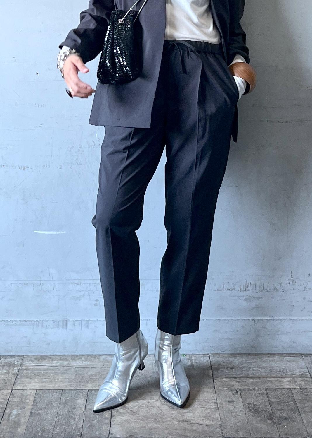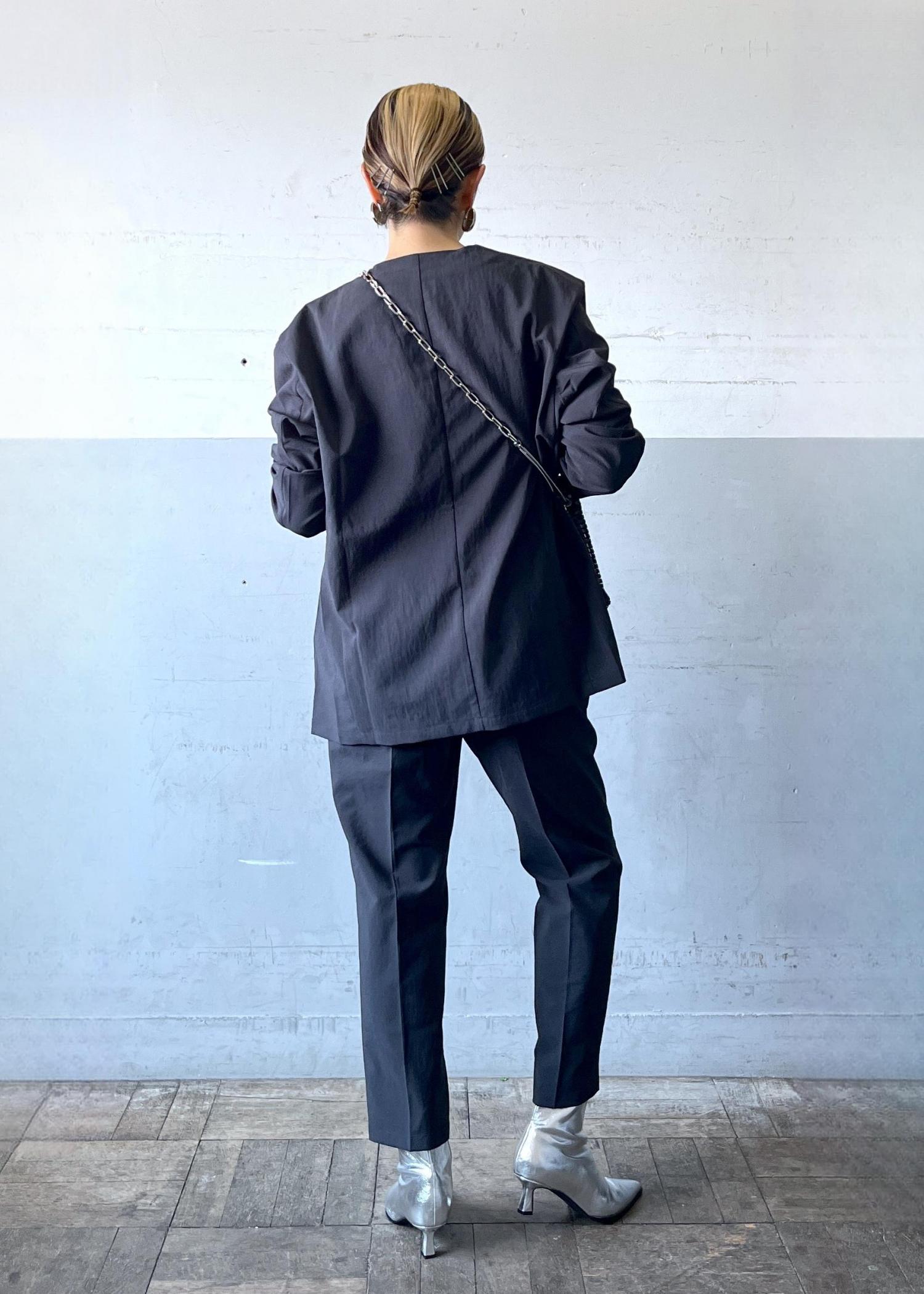 ADAM ET ROPÉ HOMME【RIRANCHA】サマーセットアップ / ノーカラージャケット & スラックス / イージーケア / 接触冷感 / 吸水速乾ブラック系 / M¥23,980レビューインナーが薄手のロンTだと肩が少し落ちますが袖丈はジャストサイズでした。パンツは細身で着丈はやや短めでしたが全体的なバランスはとても良く、シンプルながらカッコよさがあるセットアップです。