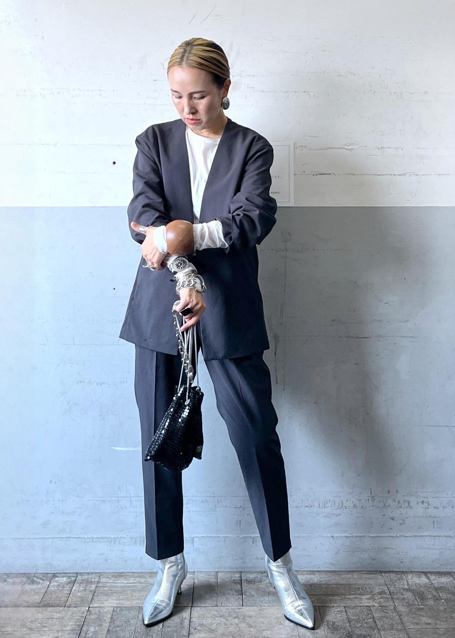 シルバーのブーツと袖口から除くシアーカフスで女性らしさを