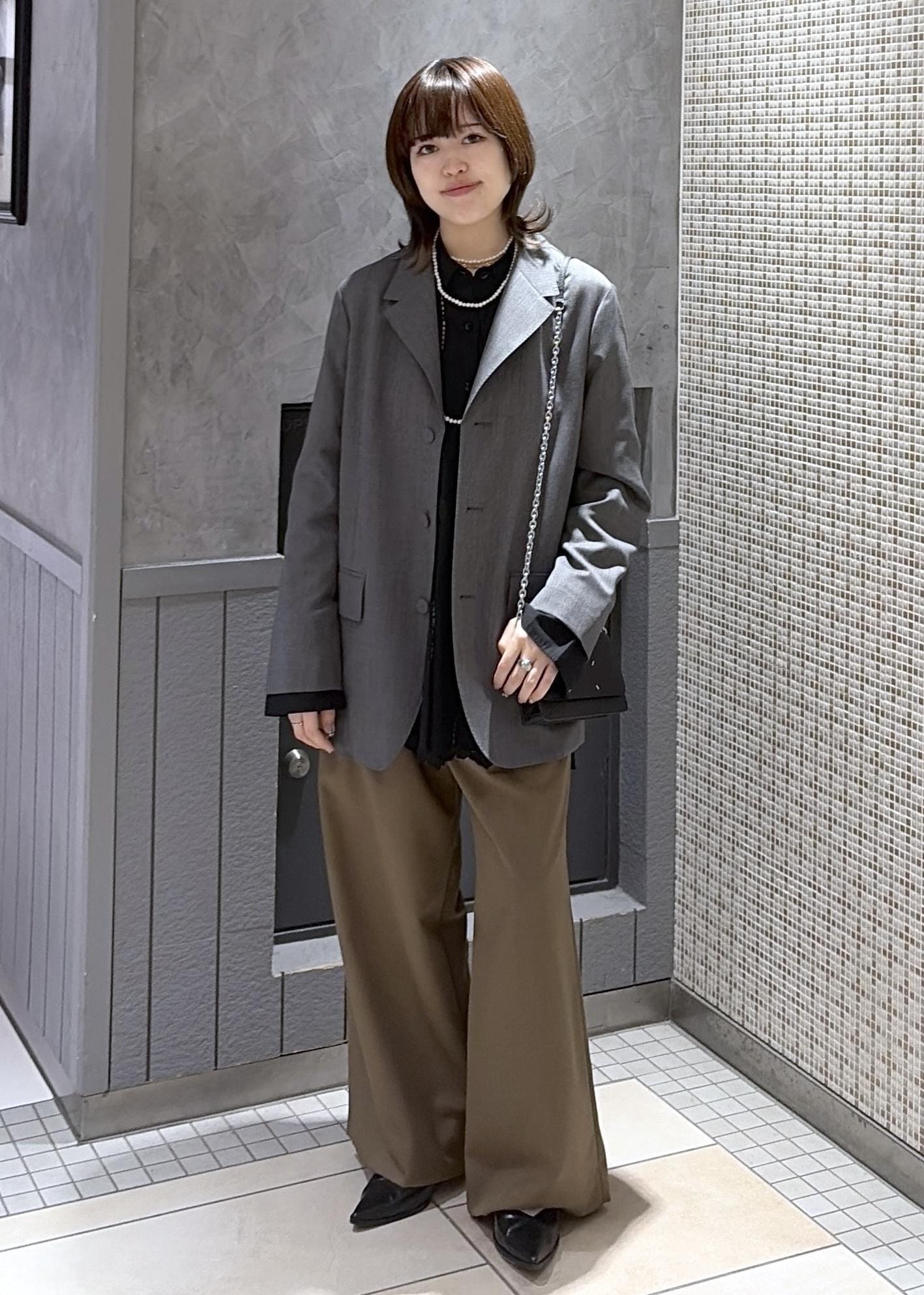 ベージュのレザーブルゾンにブラウンのチェックシャツを合わせた秋らしいコーディネートです。色合いがごちゃつかないようにパンツはブラックデニムを履きました。秋らしいブラウン、ベージュが目立つように仕上げました。