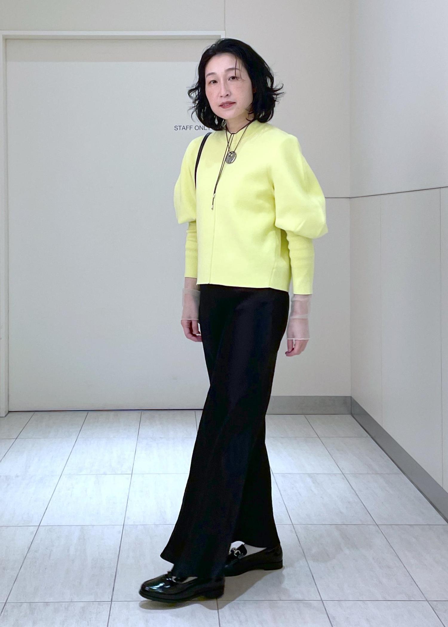 シンプルなスタイリングですが、トップスの中には再入荷したエアリーカフスプルオーバーを重ねて、袖口からキラっとシアーを覗かせたのがポイントです♩