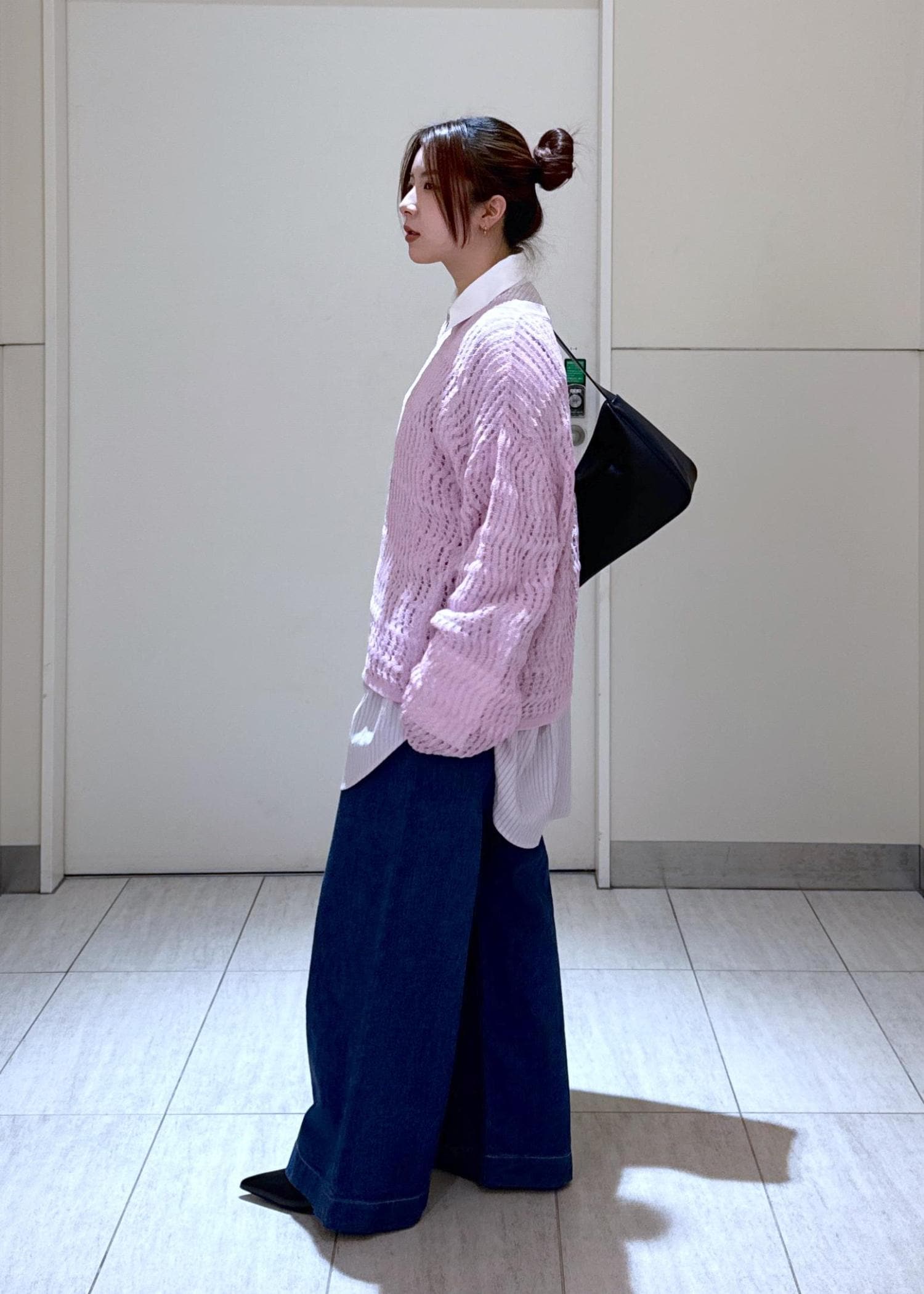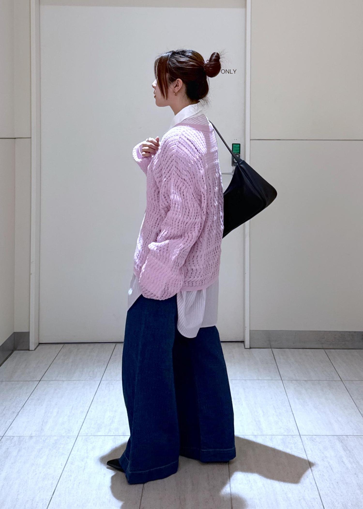 ゆるっとシャツにゆるっとニットをレイヤードしました!ピンクにピンク合わせ、めちゃくちゃ可愛いです…。