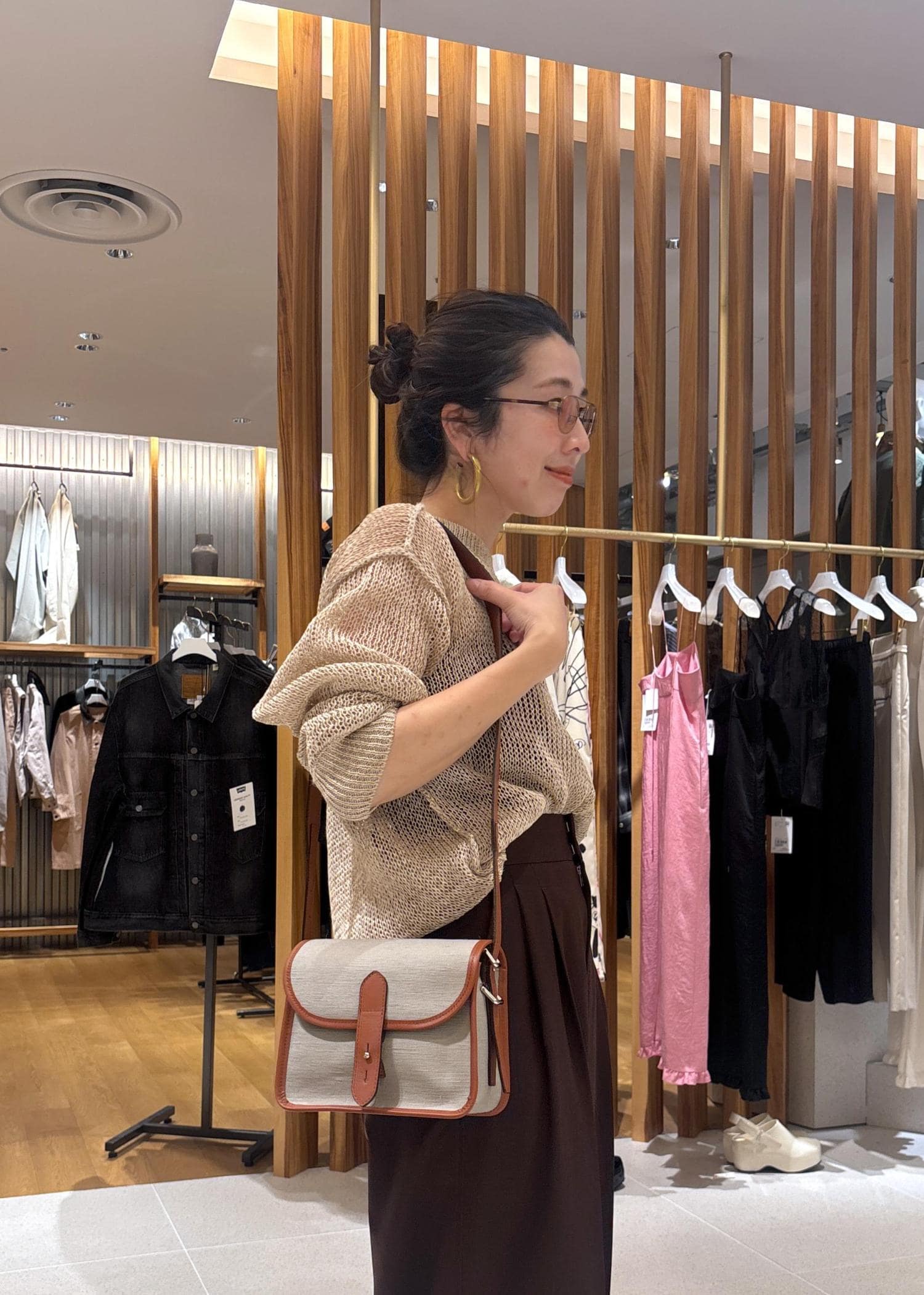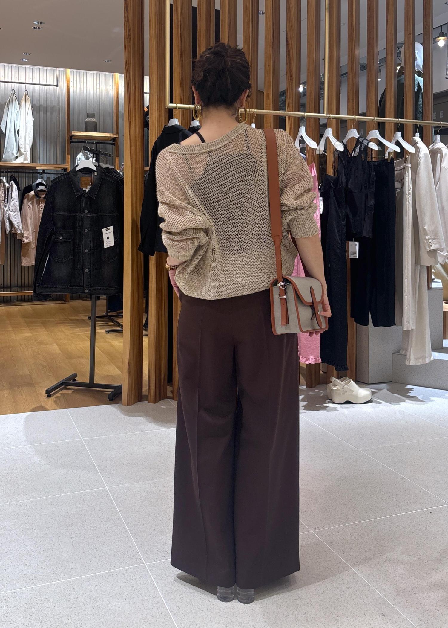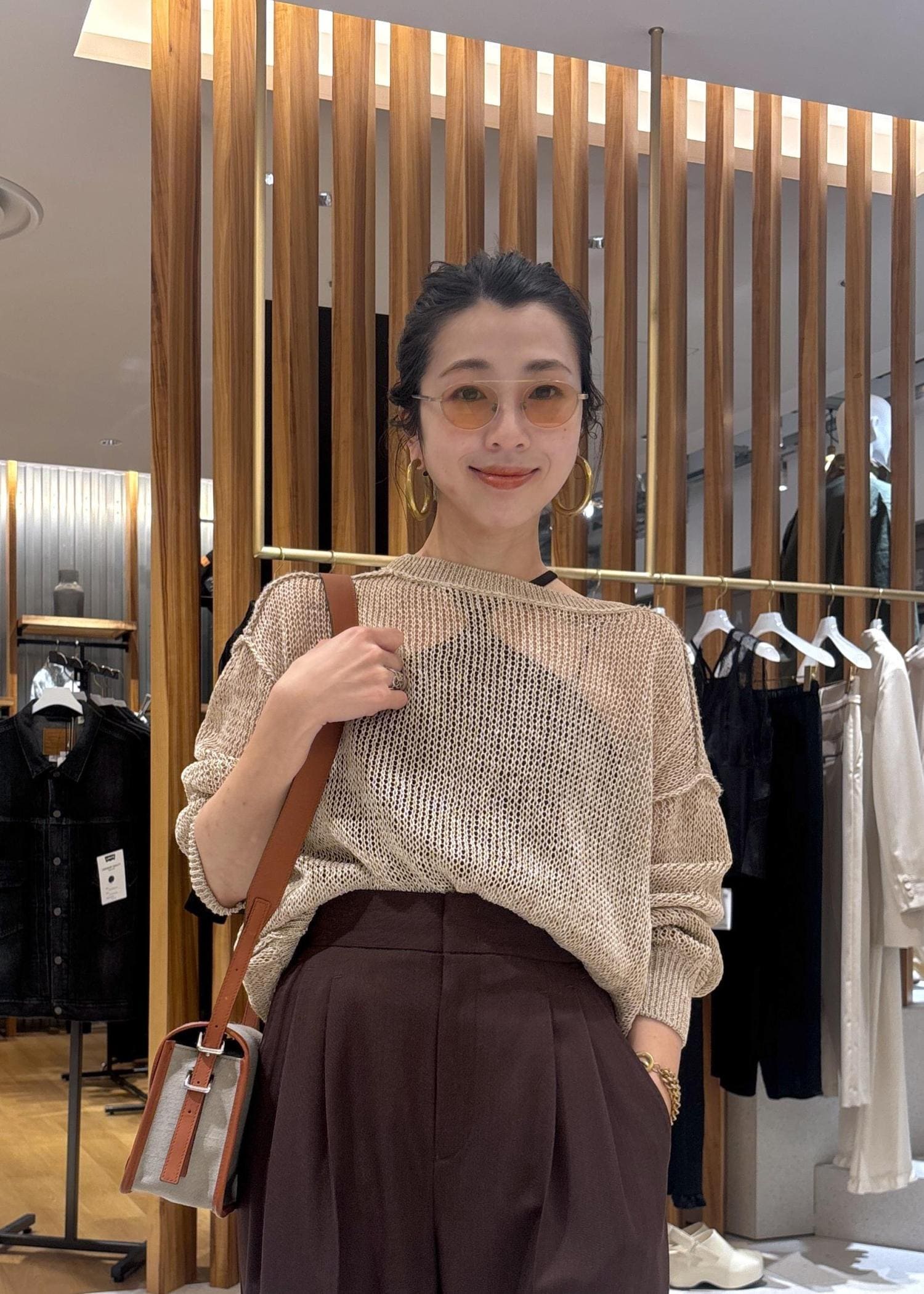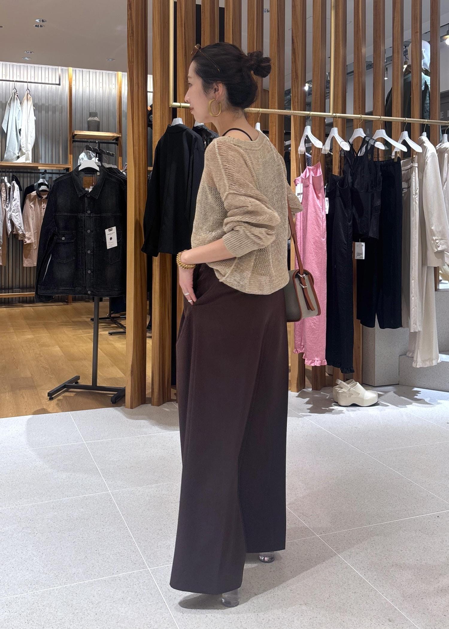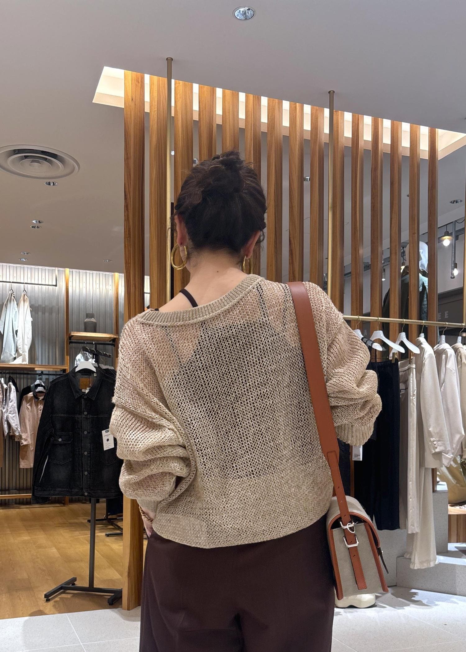 ざっくり編みのローゲージニットなので、シアー感もあり夏に向けておすすめです。リネンライクなドライタッチな素材で、肌触りも良くとても着やすいと思います。