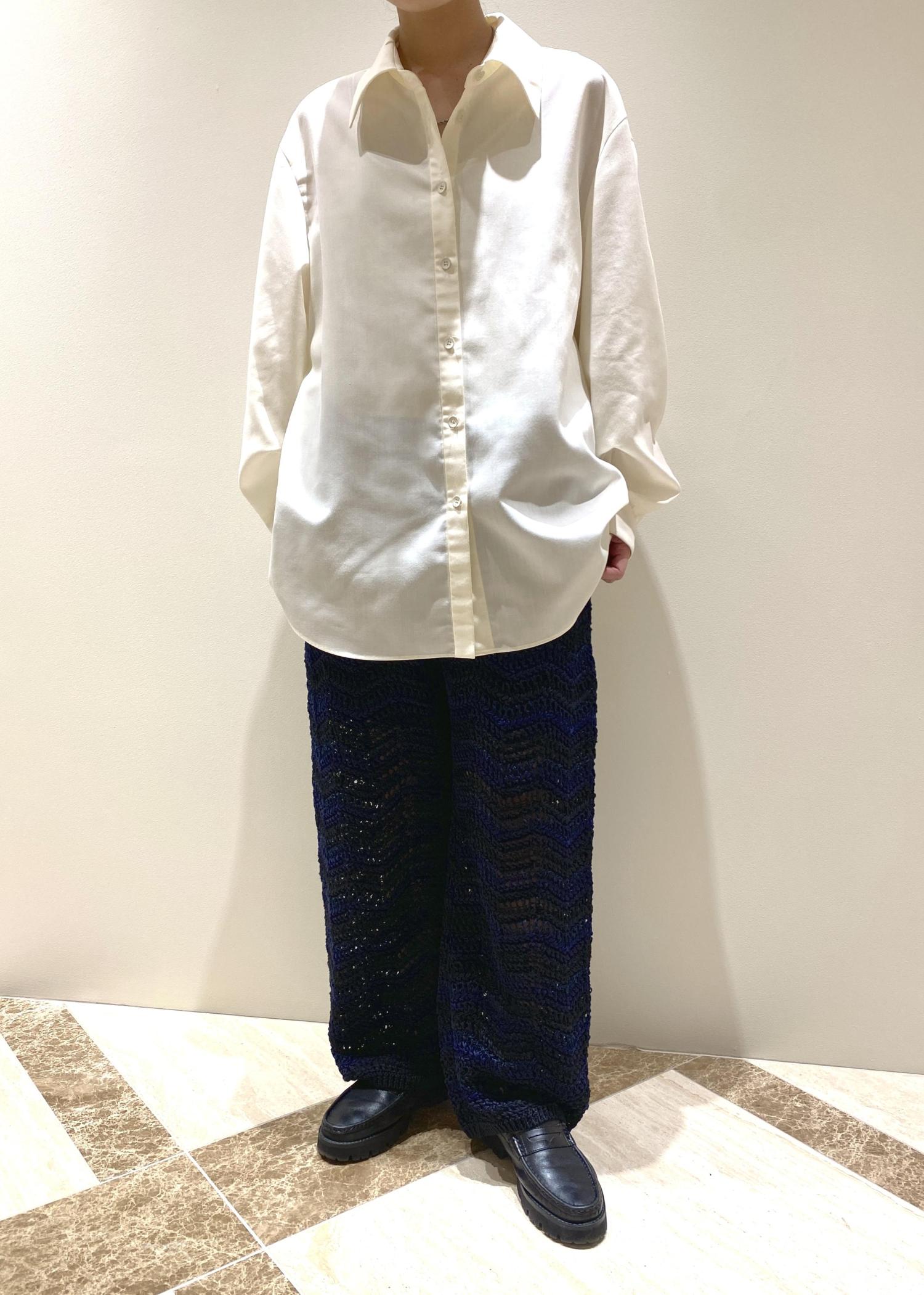 透け感のあるニットパンツはシャツで合わせる事で