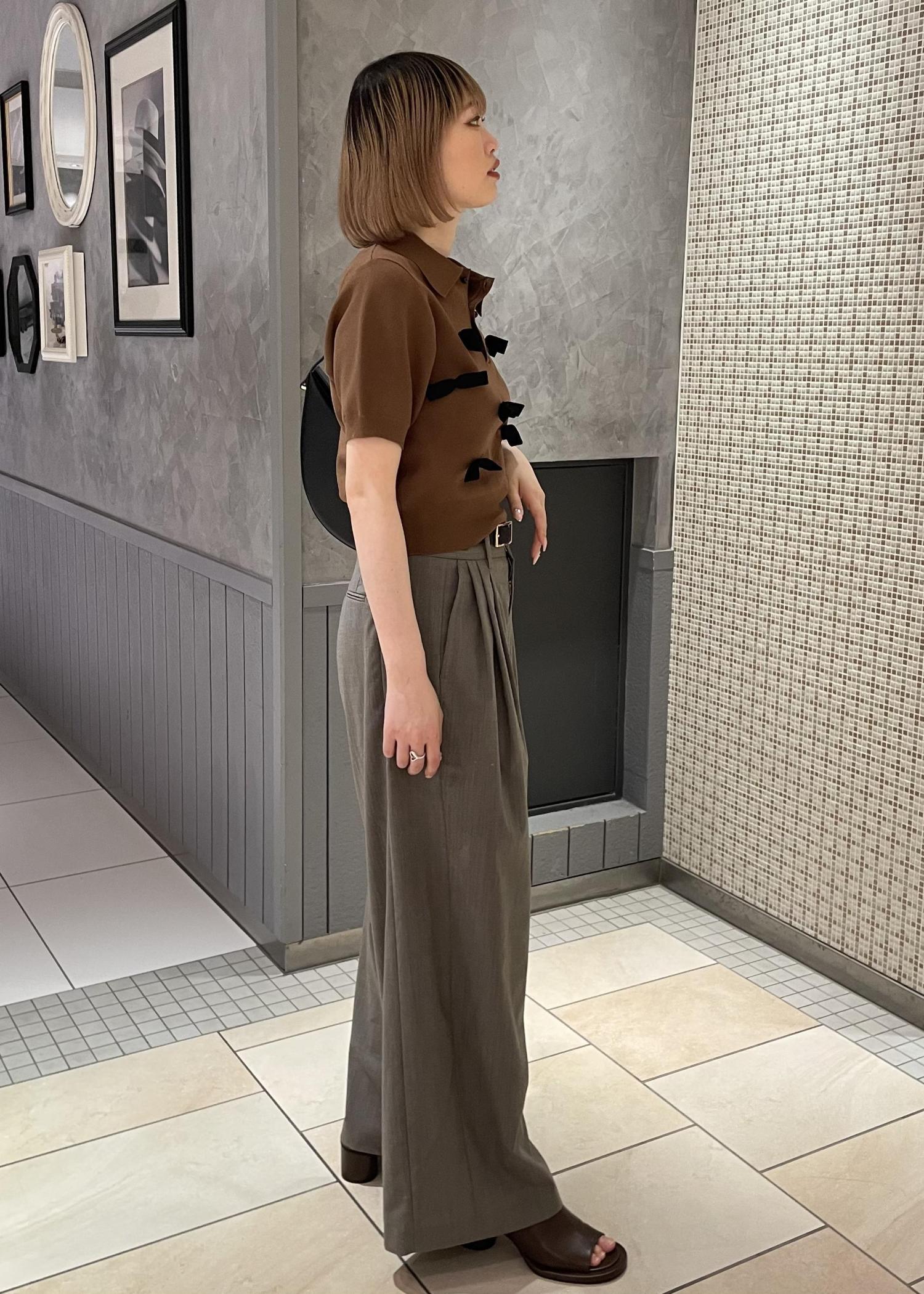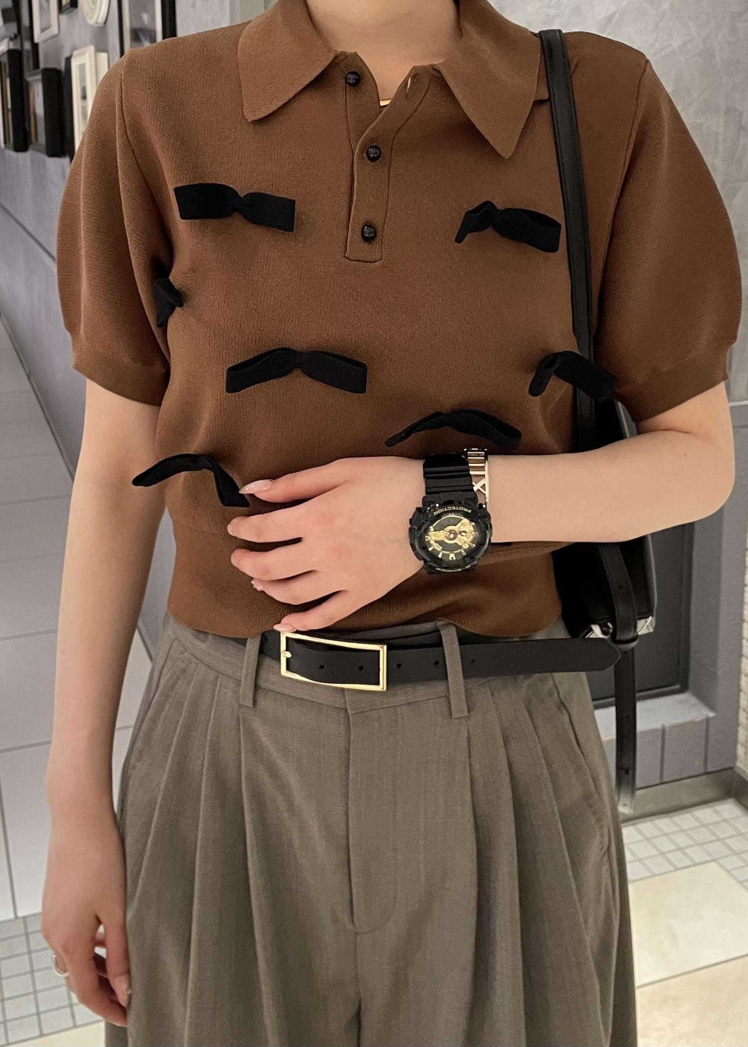 ポロシャツというカジュアルなアイテムにリボンの甘さがプラスされて少し甘辛なトップスです。着丈は短めです。