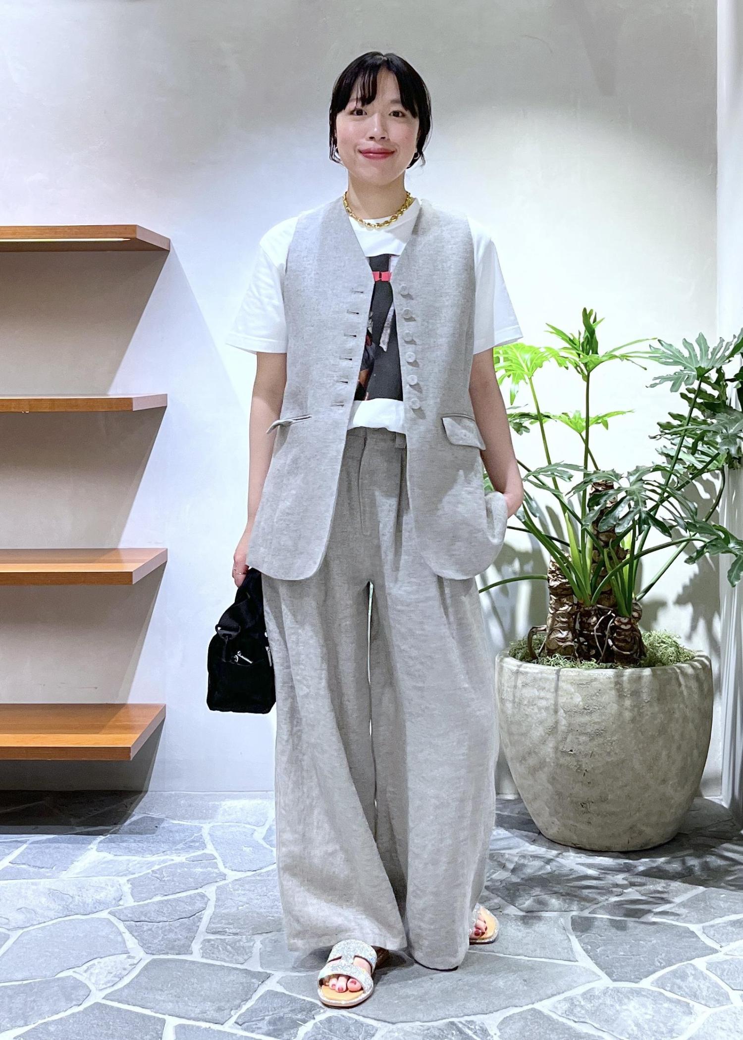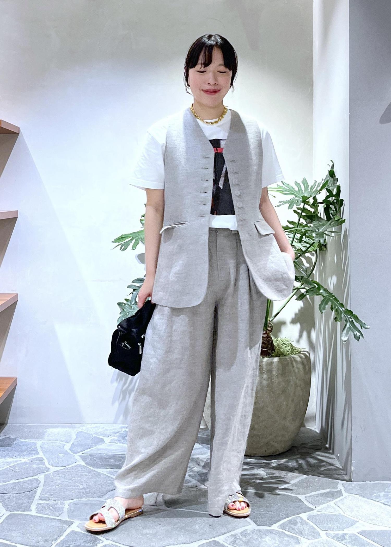 パンツはリネン特有のとろみもあり品のある印象にまとまります。