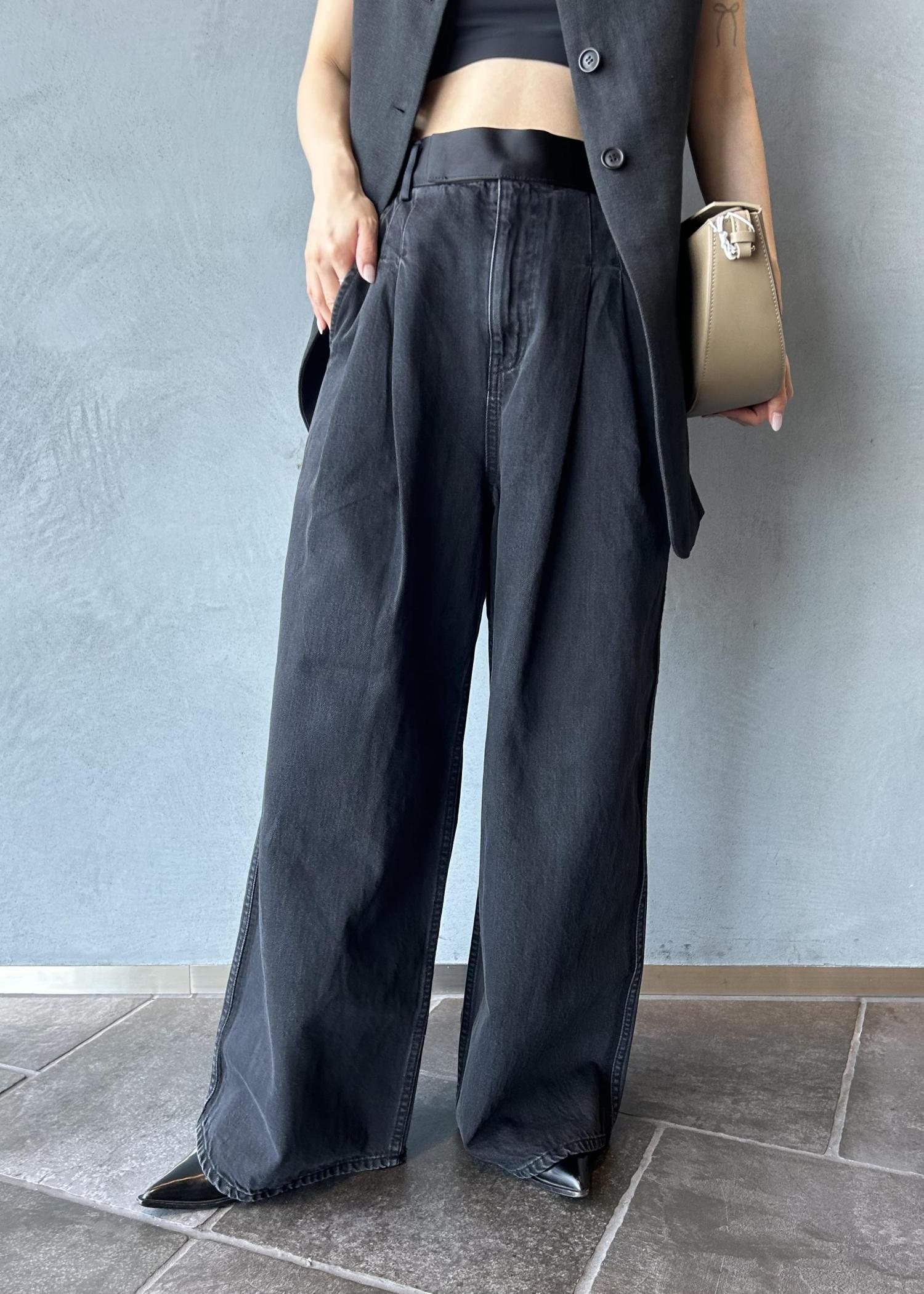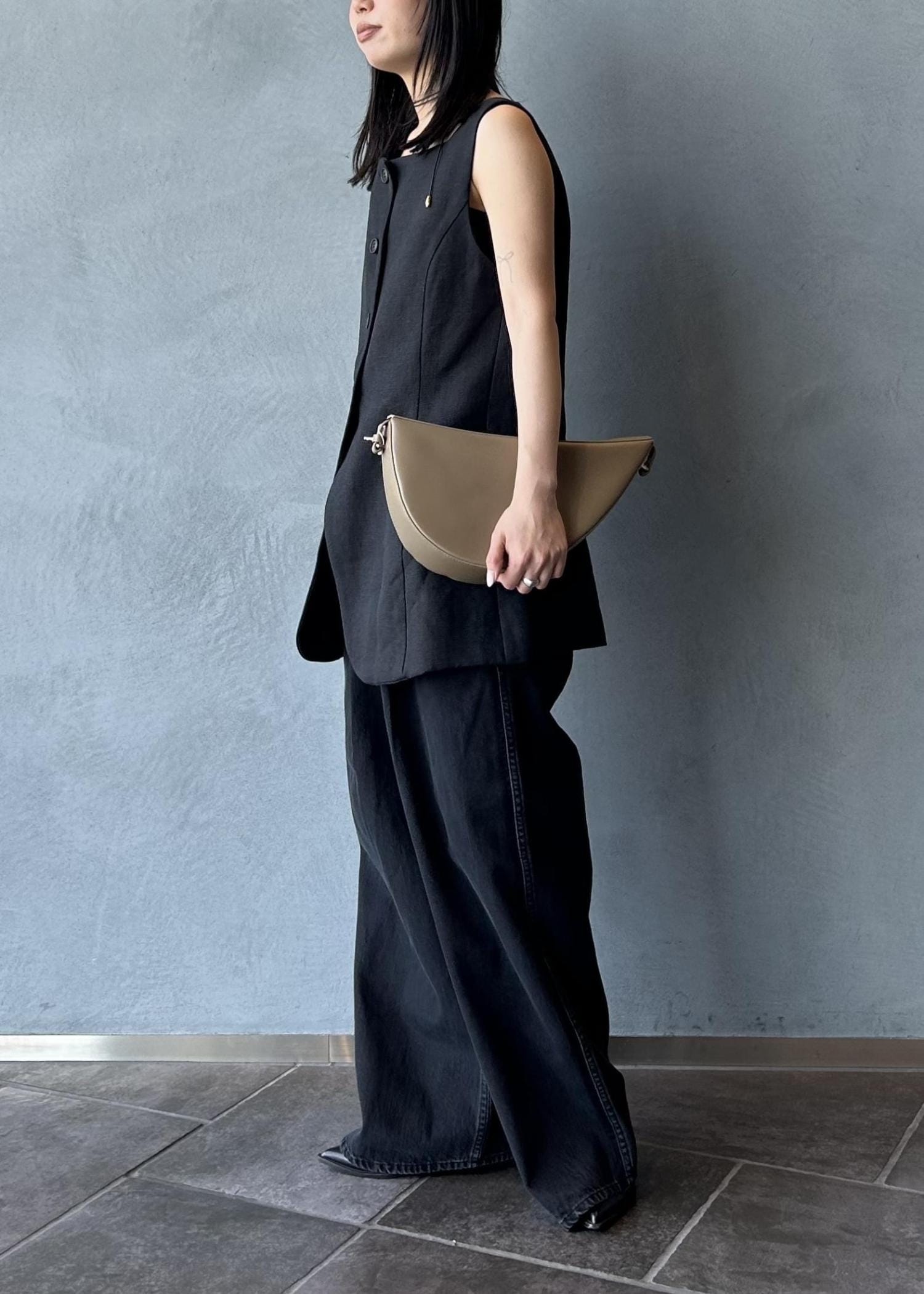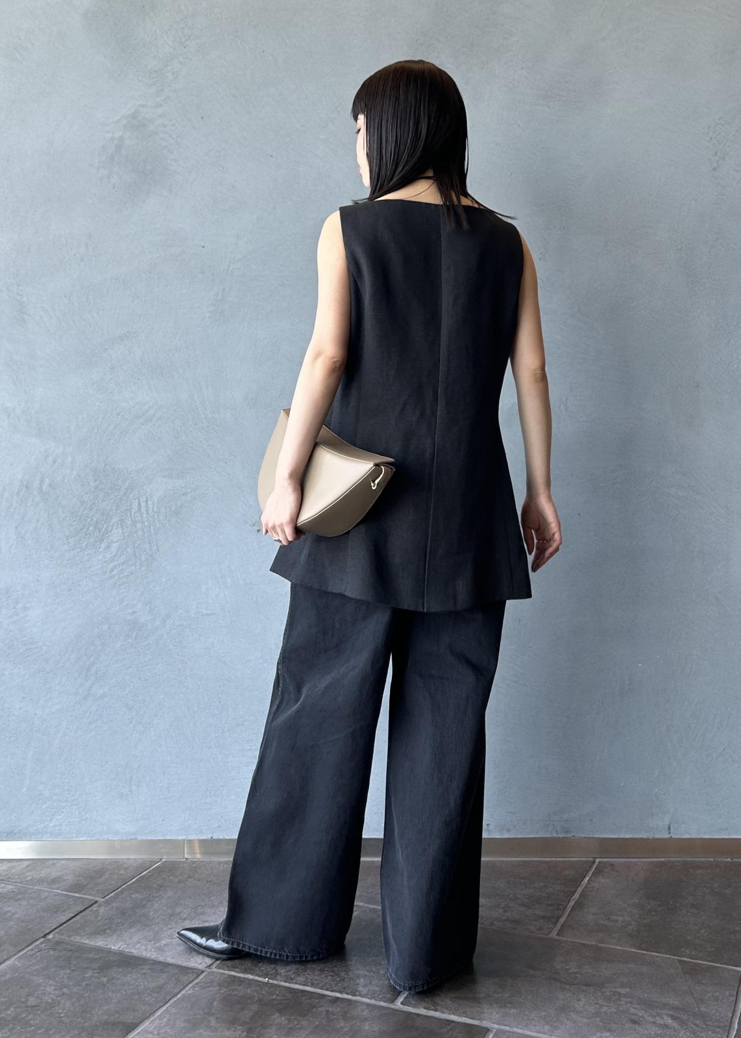EMOELLE【EMOELLE】・【サステナブル】ドレスデニムパンツブラック系 / 34¥22,000レビュー身長156cmで34サイズを着用しています。5cmくらいのヒールを履いて少したまるくらいの長さです。ウエストの切り替えがワンポイントになります。