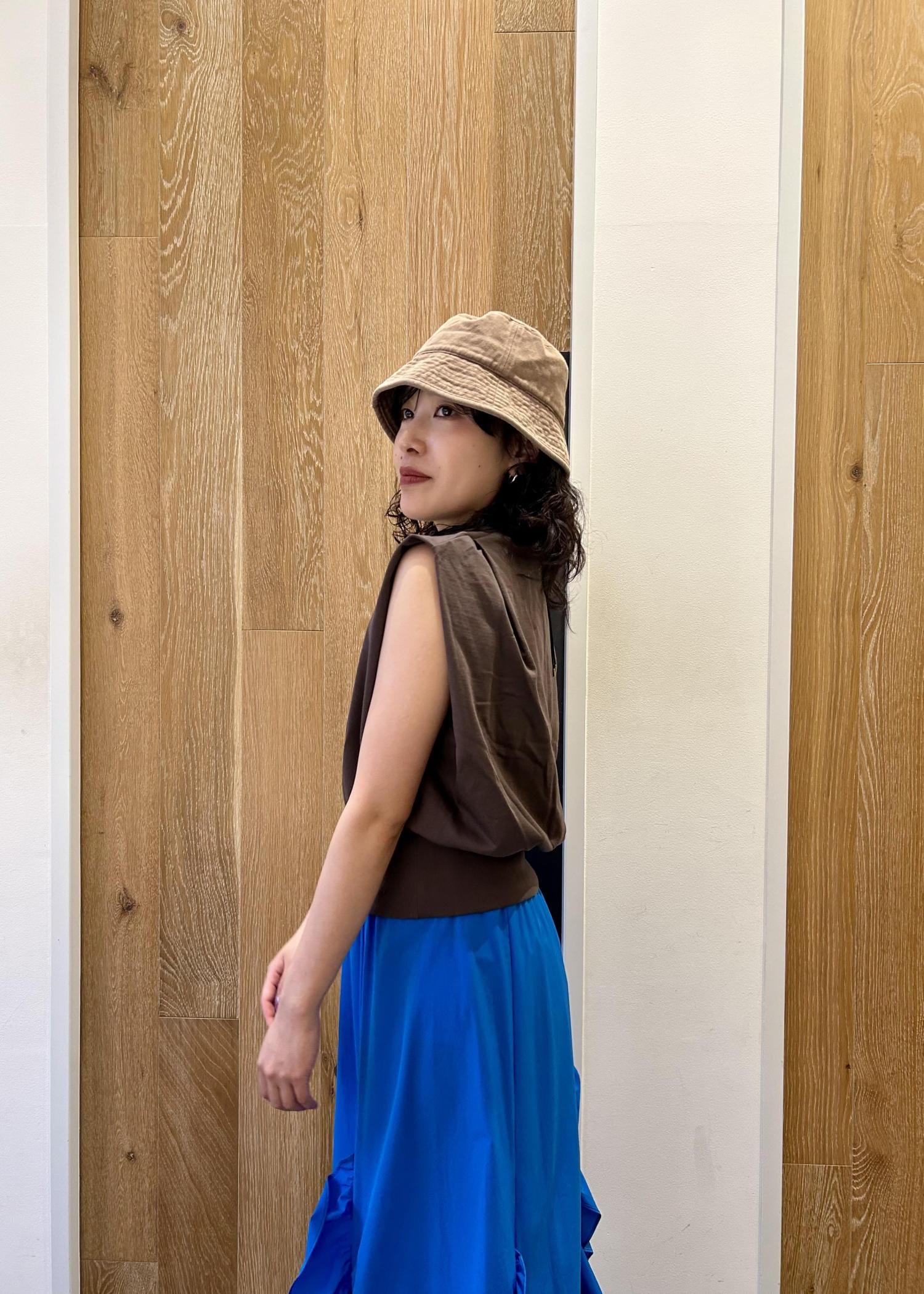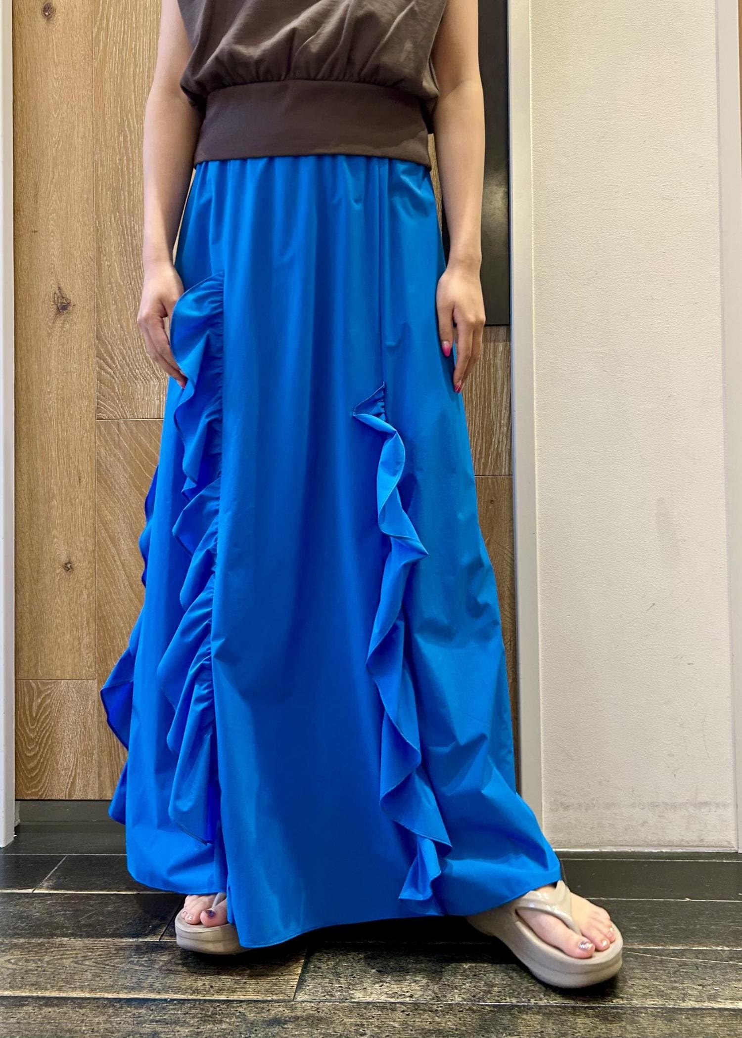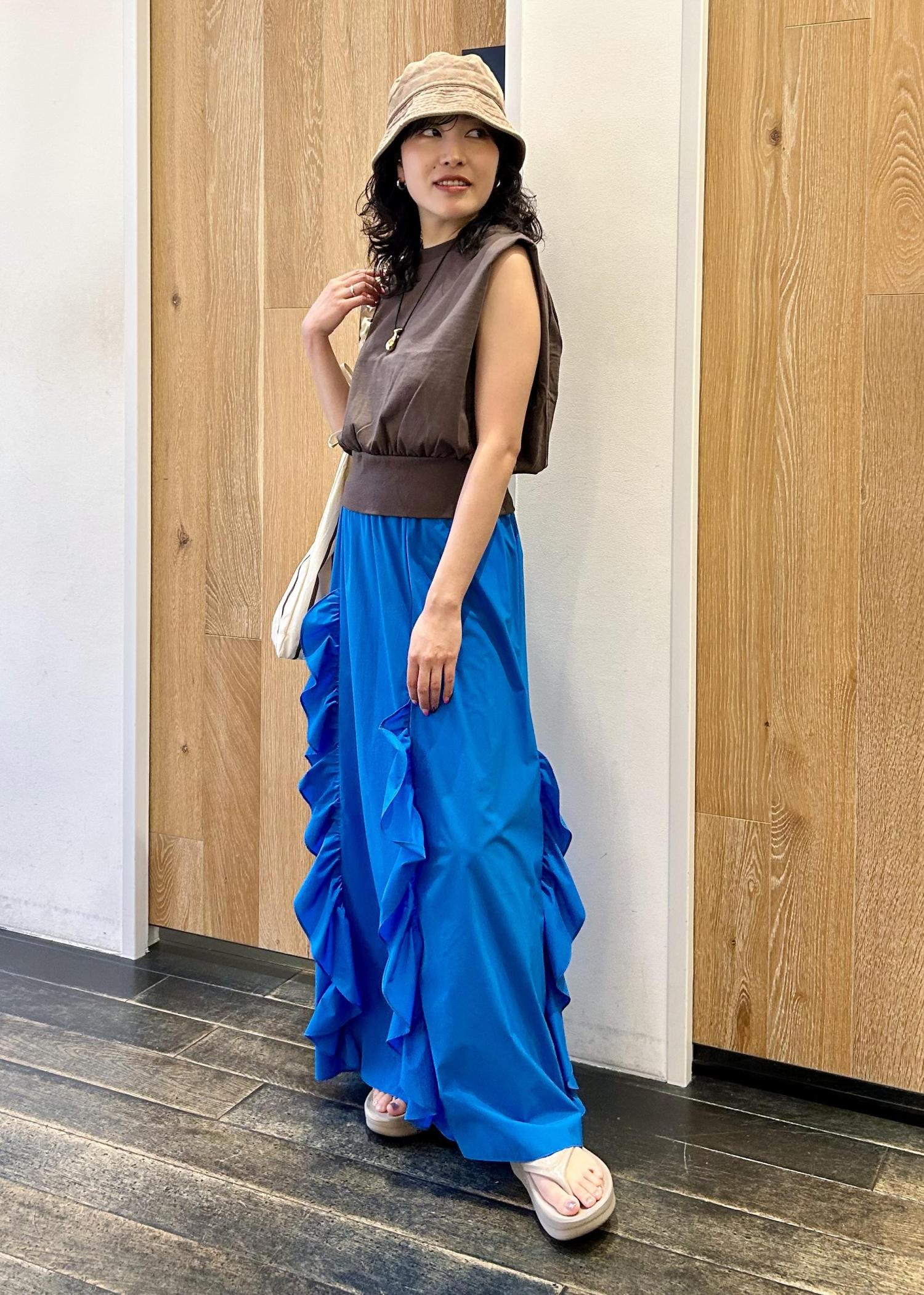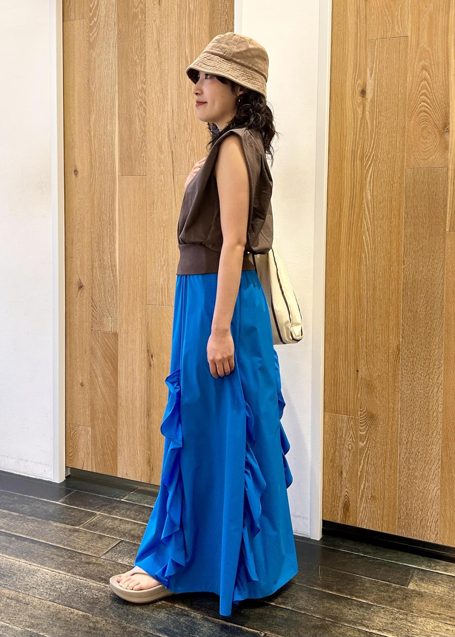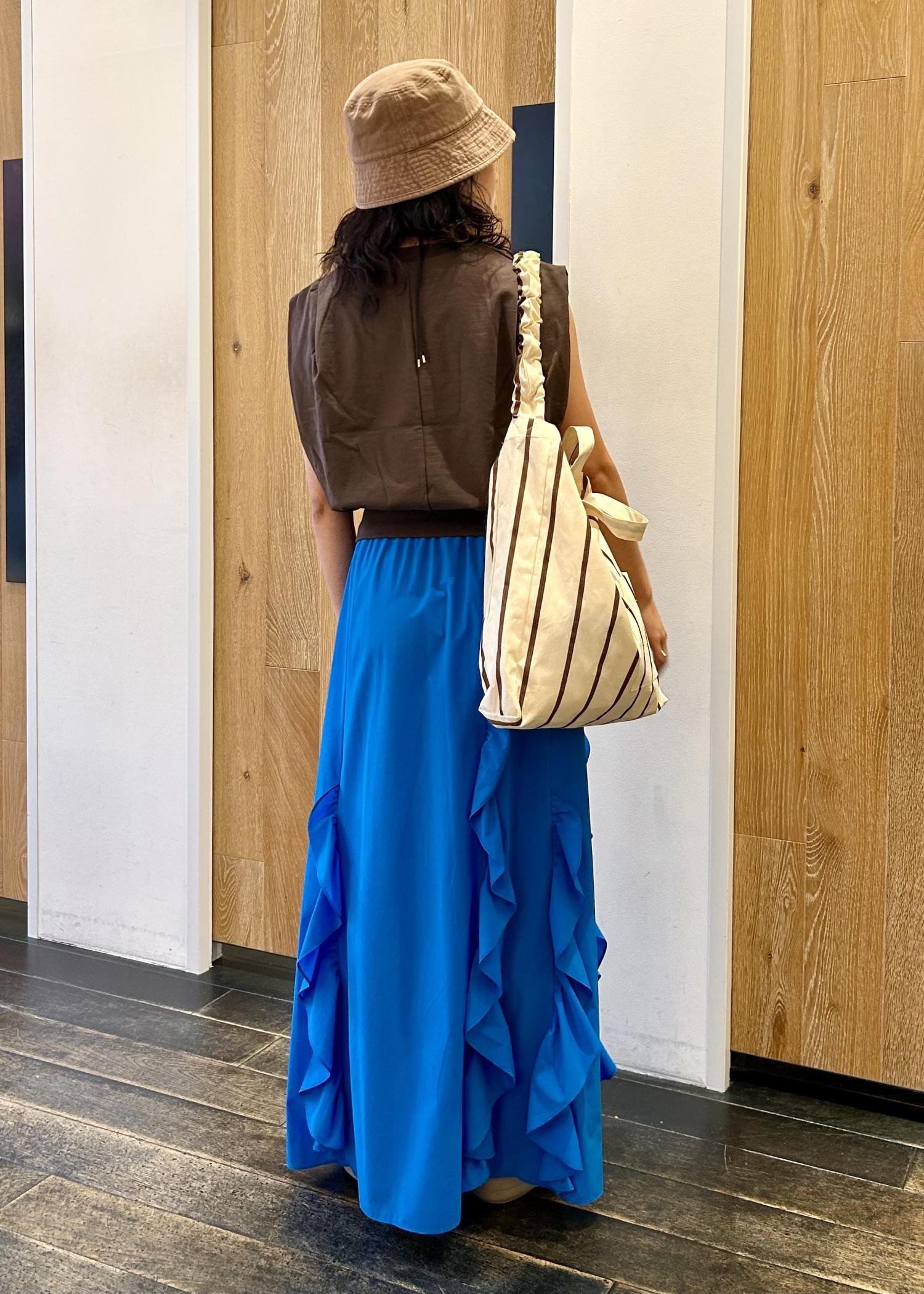 目が覚めるようなブルーのスカートは