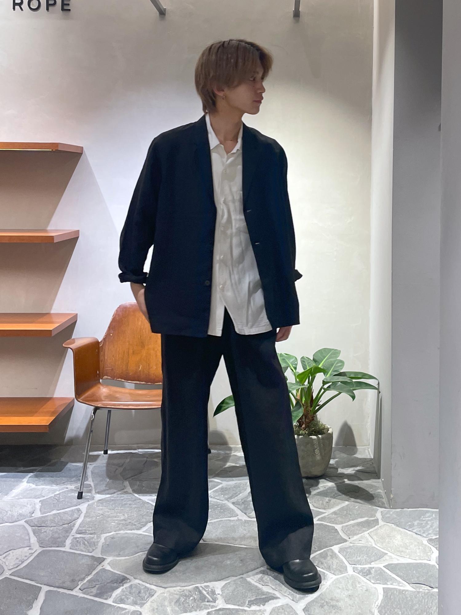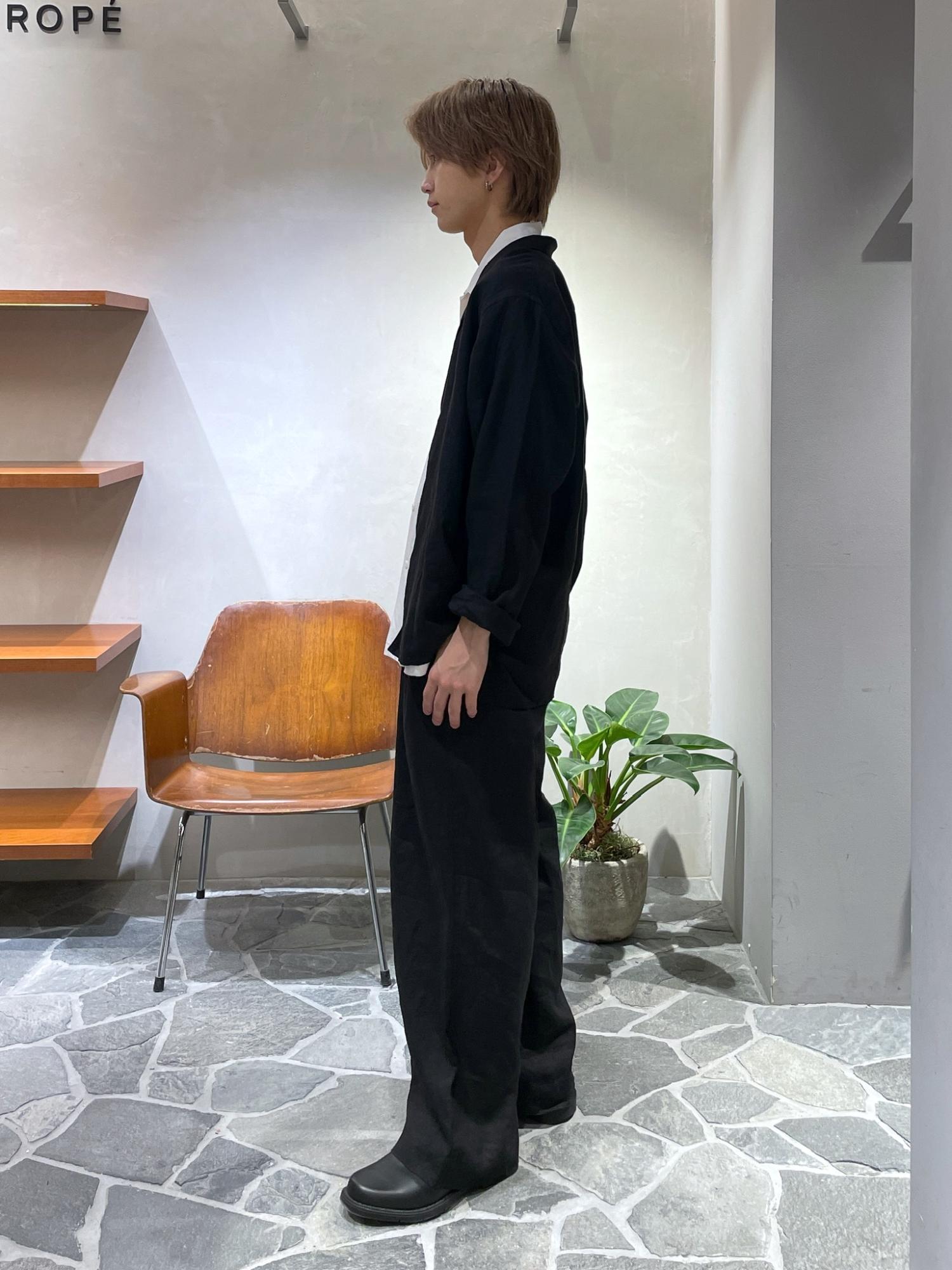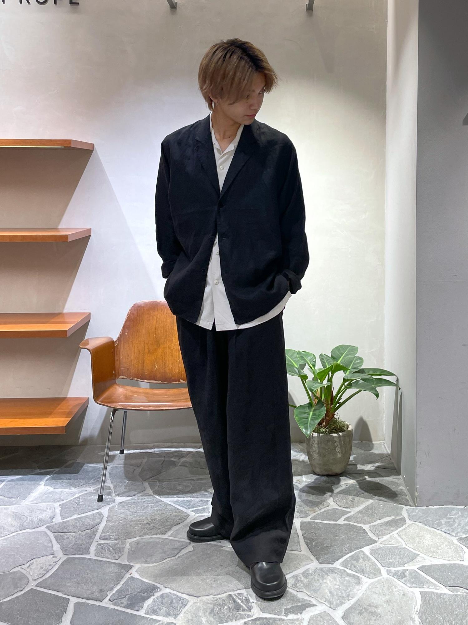 重たくなりがちなブラックカラーのセットアップをリネンの素材とアロハシャツで、程よいリラックス感のあるバランスがとれたコーデです◎