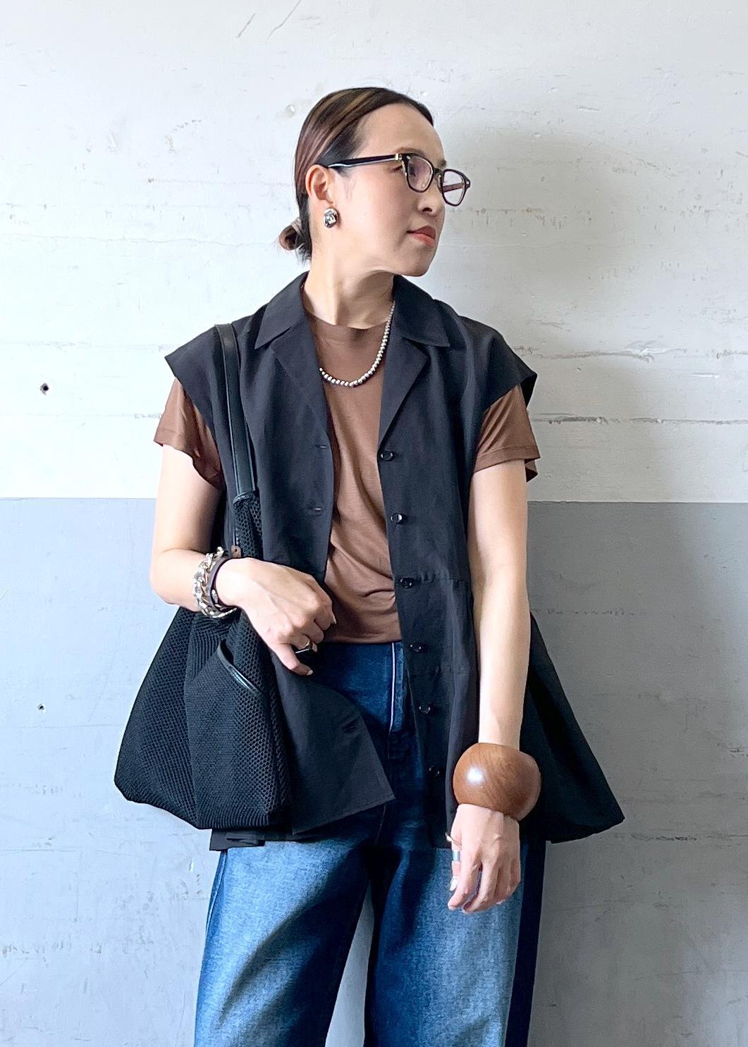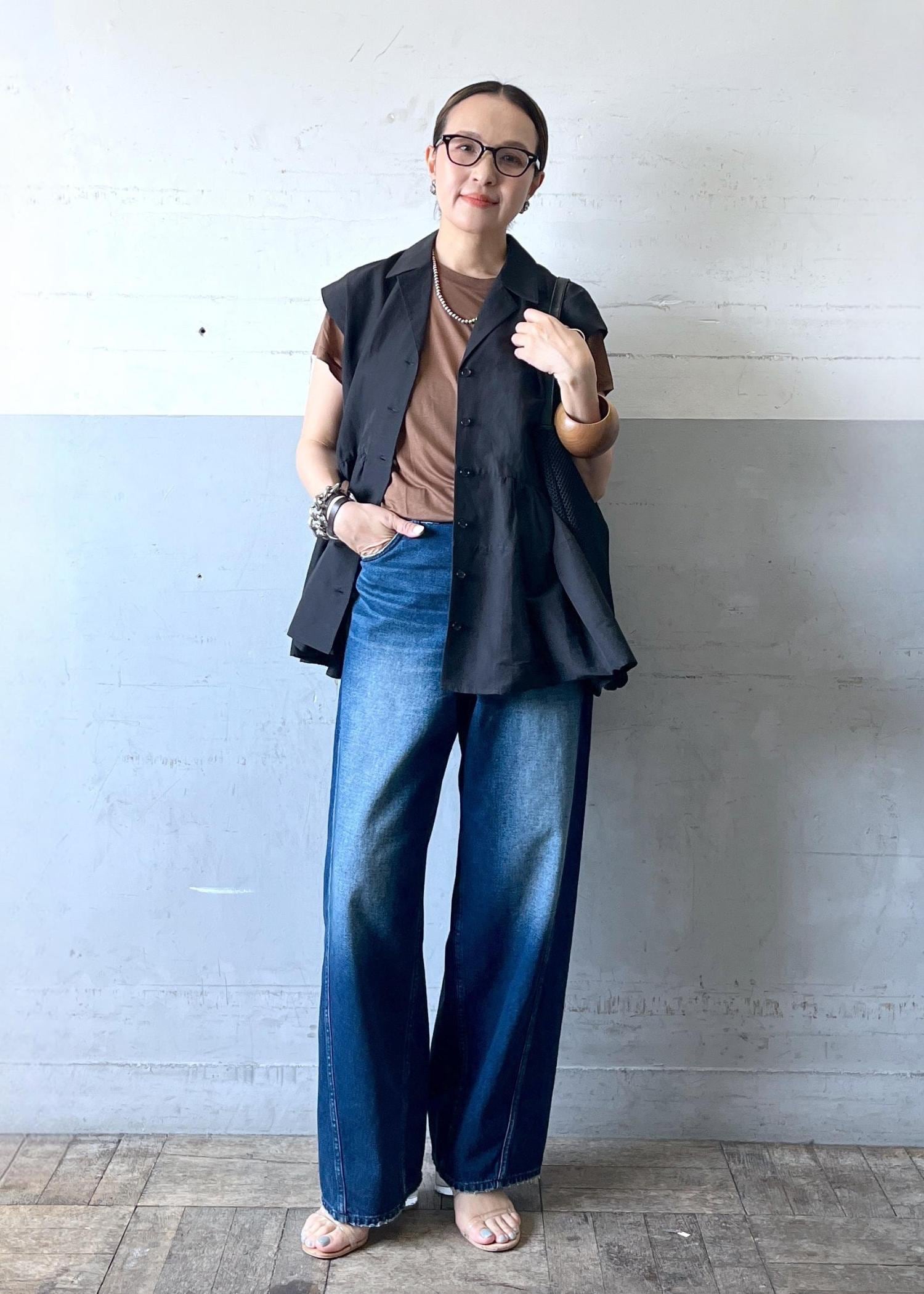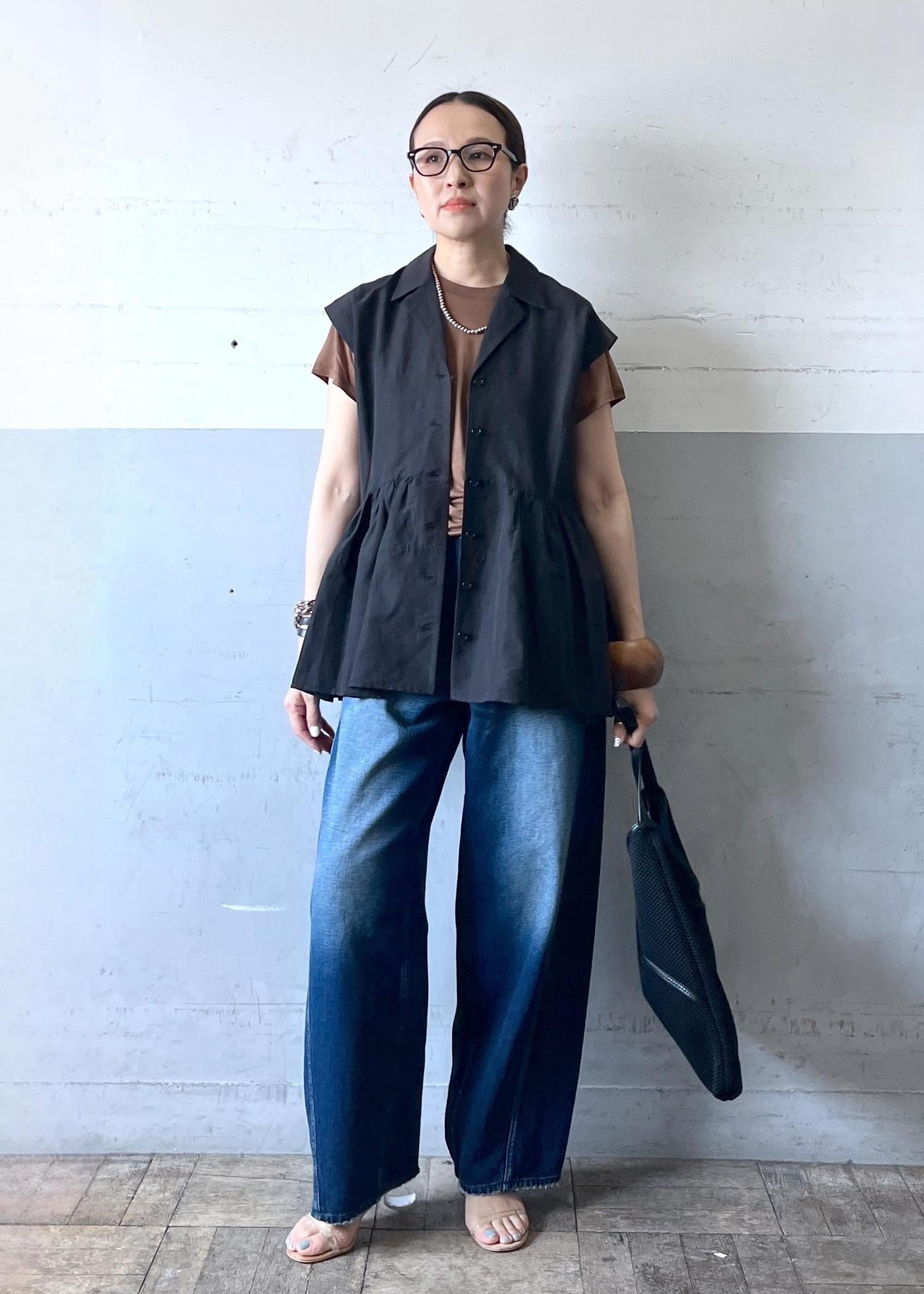 Tシャツとデニムスタイルにプラスしてこんなベストはいかがでしょうか。ペプラムがポイントのベストは前を閉じてブラウスとして着ても◎ノースリーブですがドロップショルダーになっているので気になる二の腕もやんわりとカバーしてくれます。この夏、活躍すること間違いなし!オススメです♡