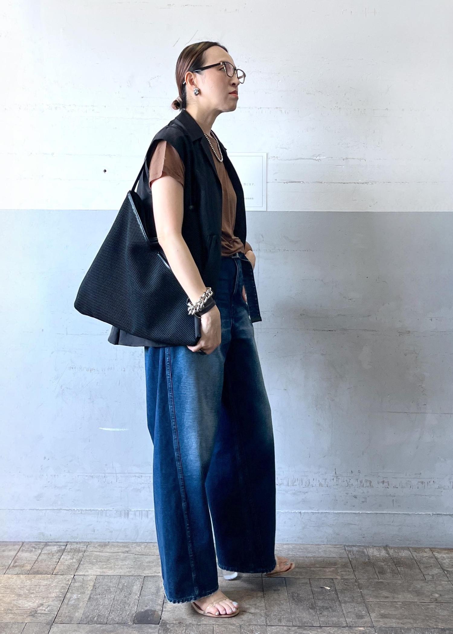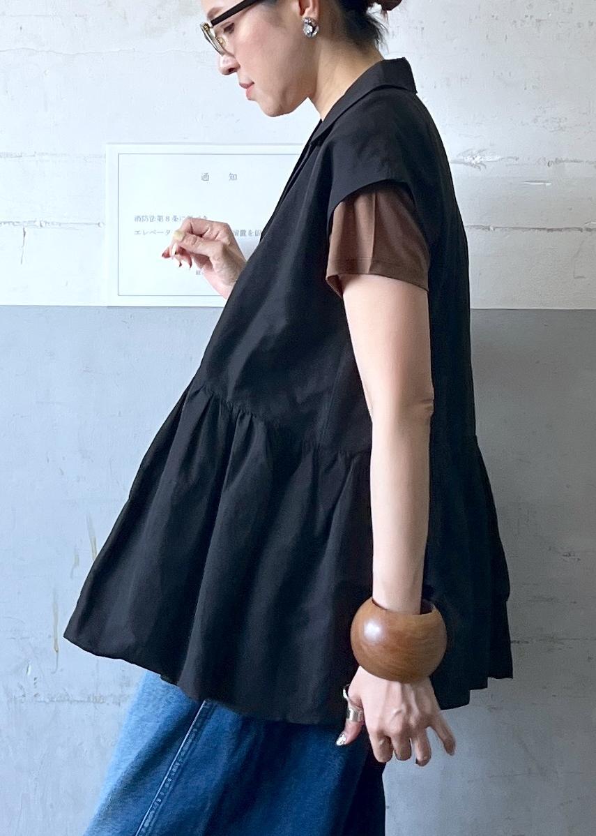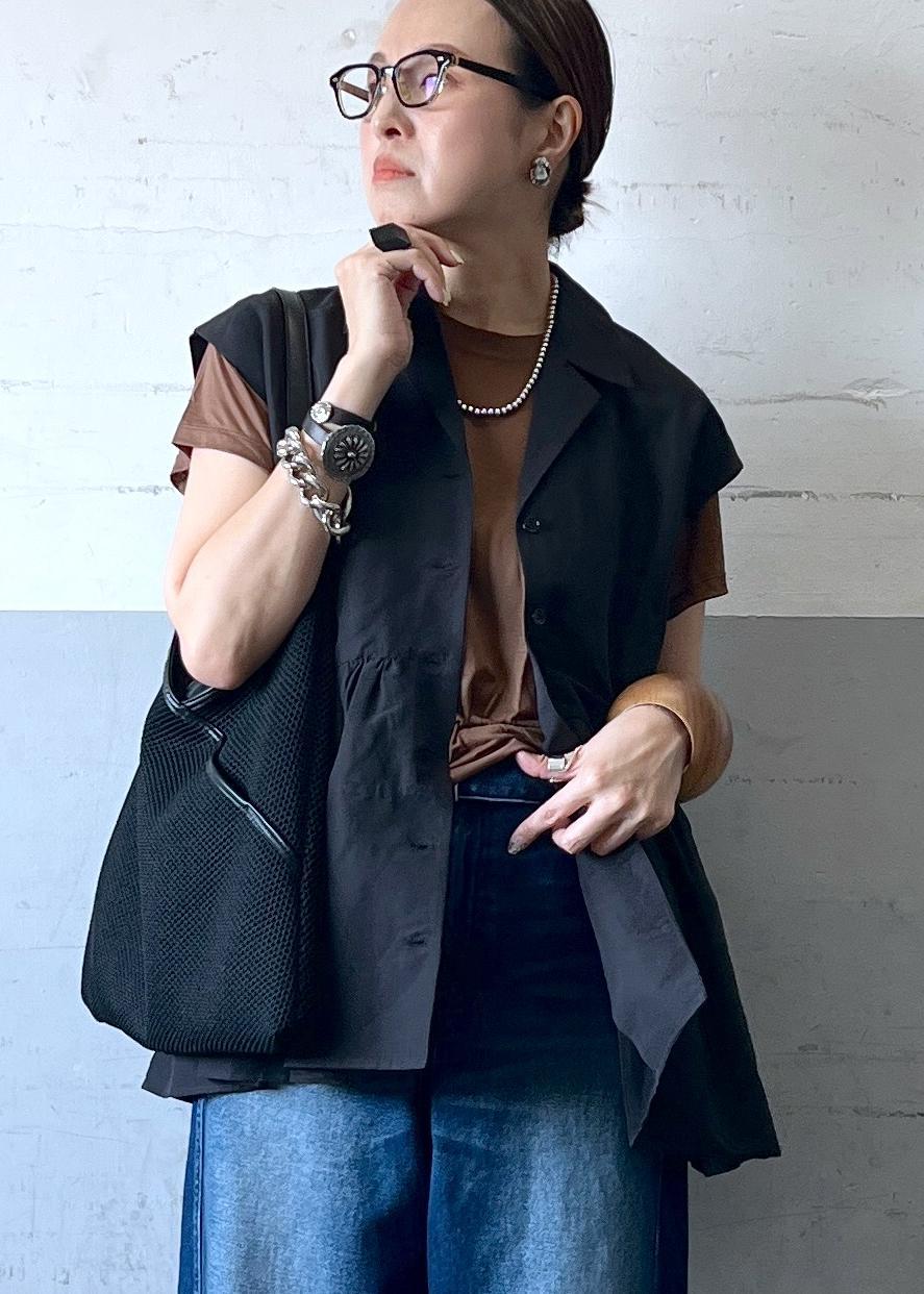 Tシャツとデニムスタイルにプラスしてこんなベストはいかがでしょうか。ペプラムがポイントのベストは前を閉じてブラウスとして着ても◎ノースリーブですがドロップショルダーになっているので気になる二の腕もやんわりとカバーしてくれます。この夏、活躍すること間違いなし!オススメです♡