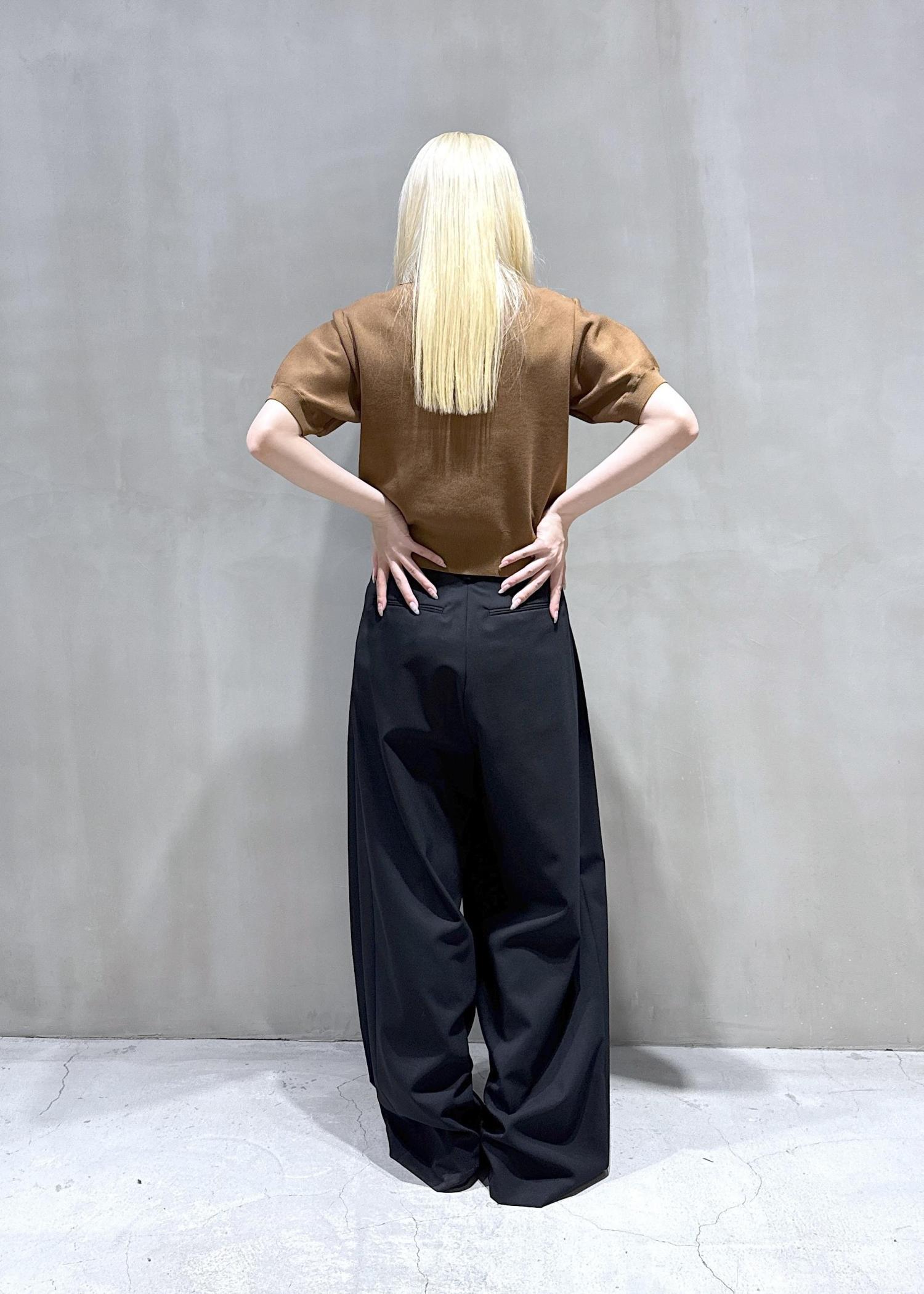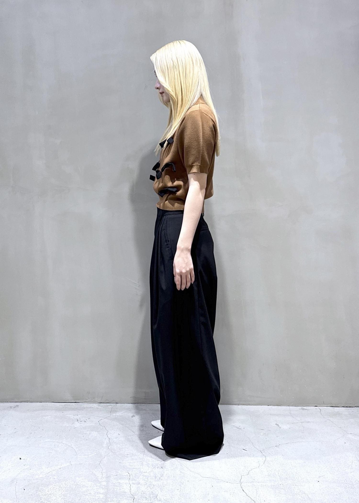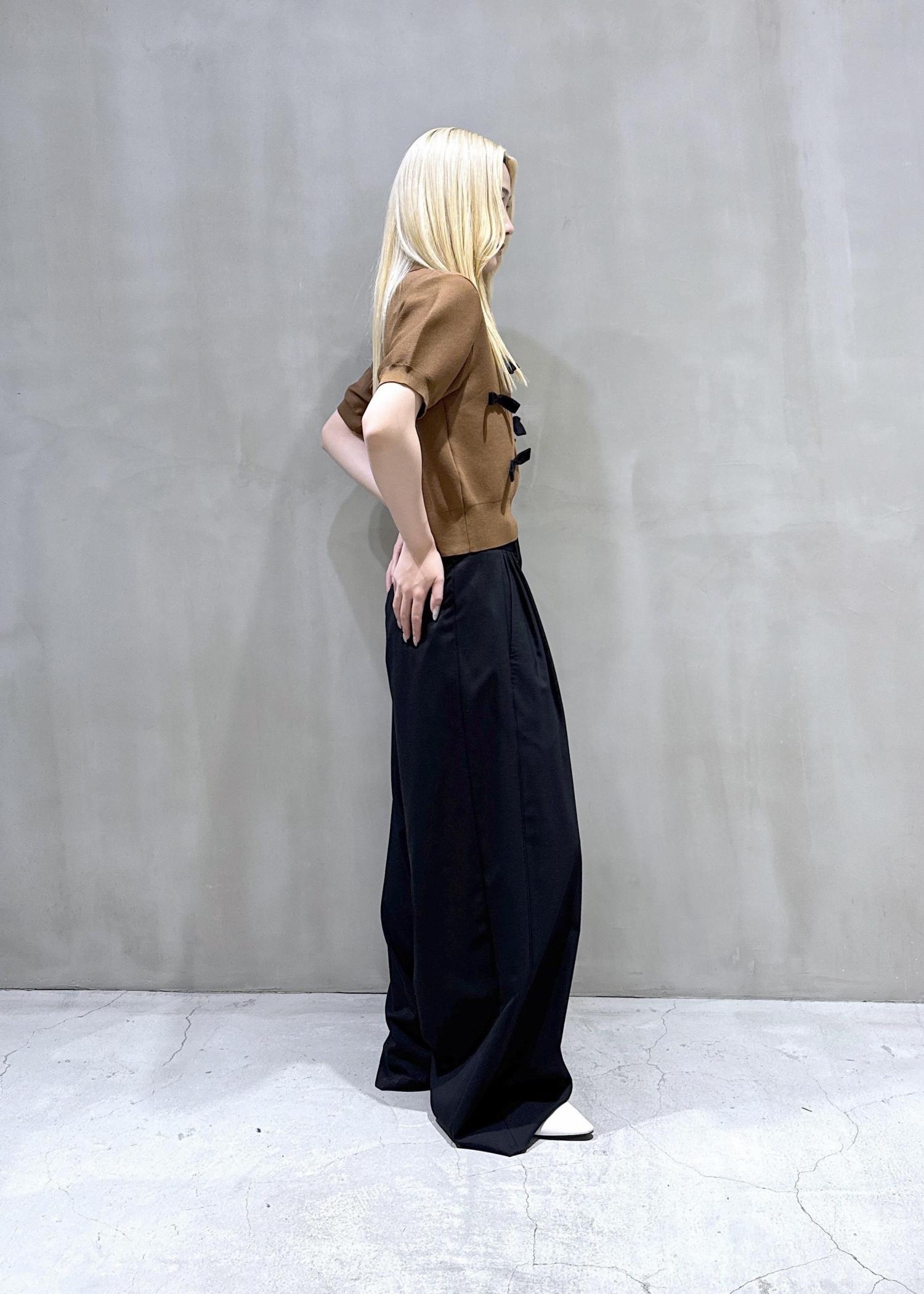 ワイドのスラックスパンツを合わせ大人っぽさを出し甘さ控えめに。