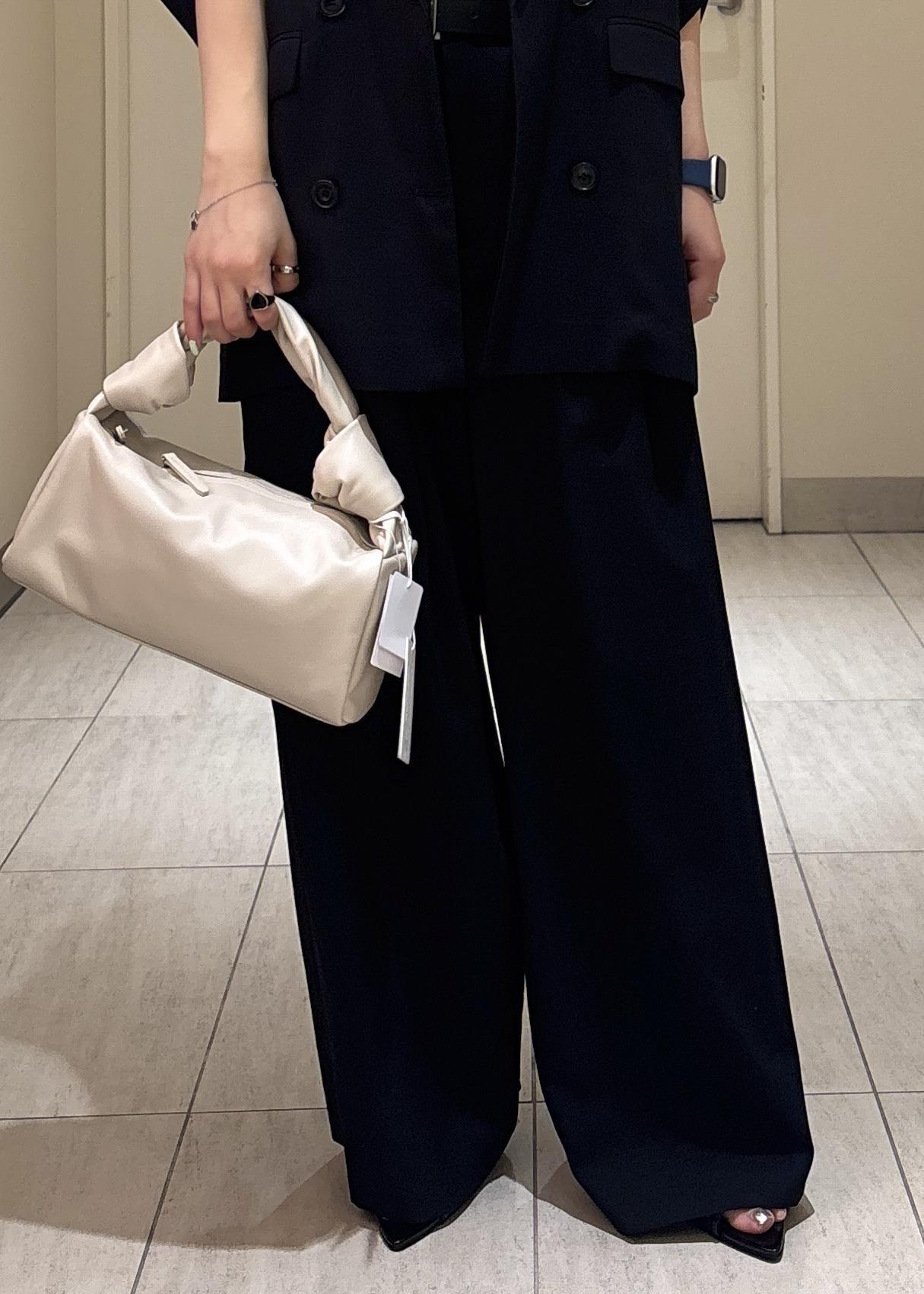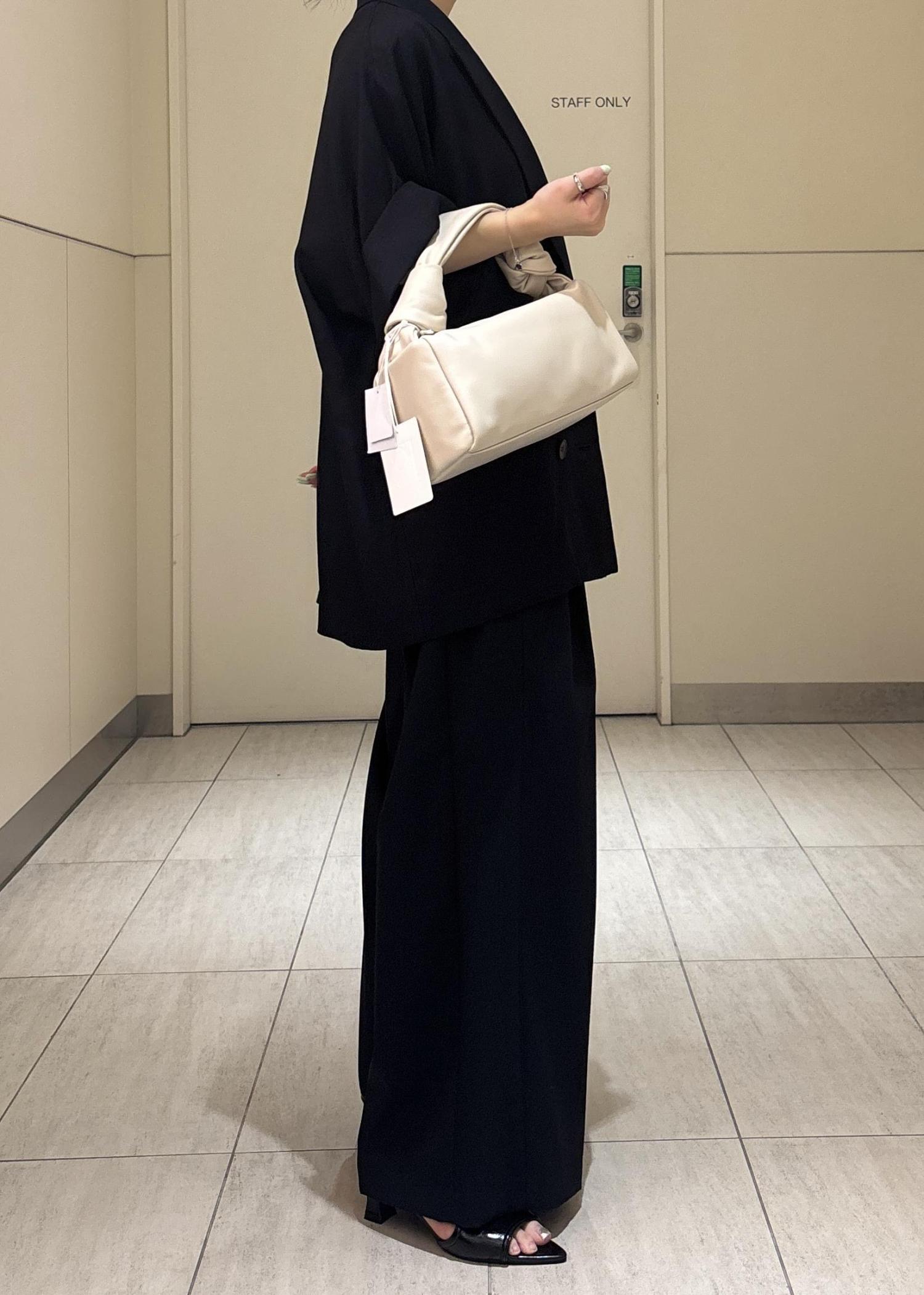 持ち手は短めなので、手で持っていただくか腕にかけていただく仕様となっております。クラッチバック風に持っていただくとシックな印象で◎