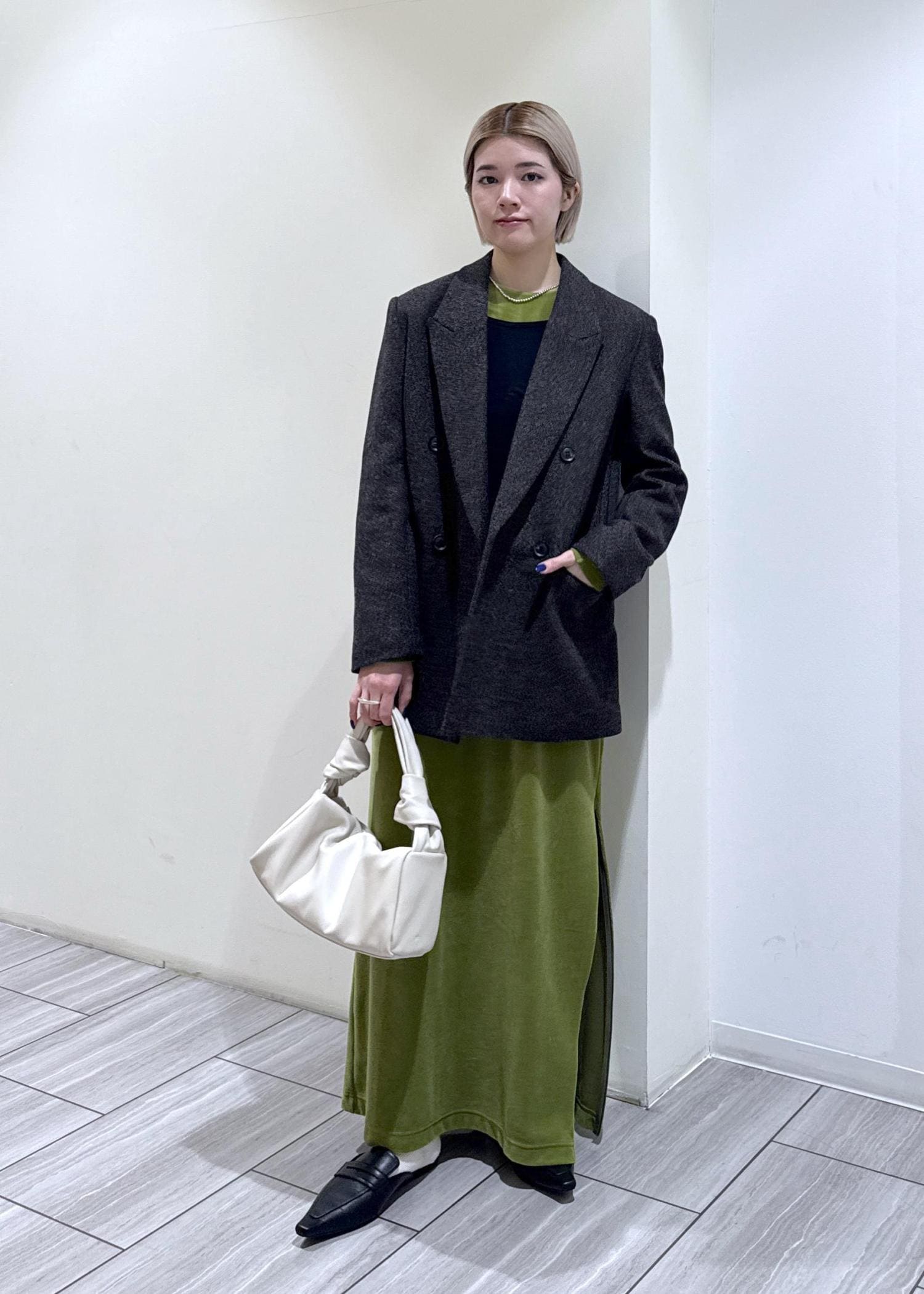 身長170cmの私がLサイズを着て、ゆったりオーバーサイズなシルエットに。着丈は長めなので、ワイドパンツの場合はインしてバランスをとるのが◎ 袖も肘くらいの長さで、ルーズな雰囲気で着用できました。