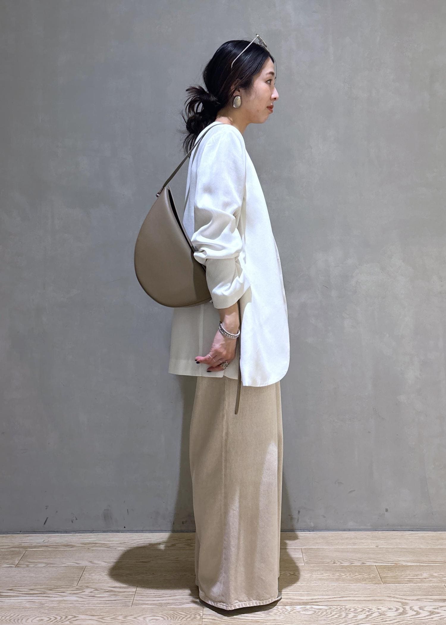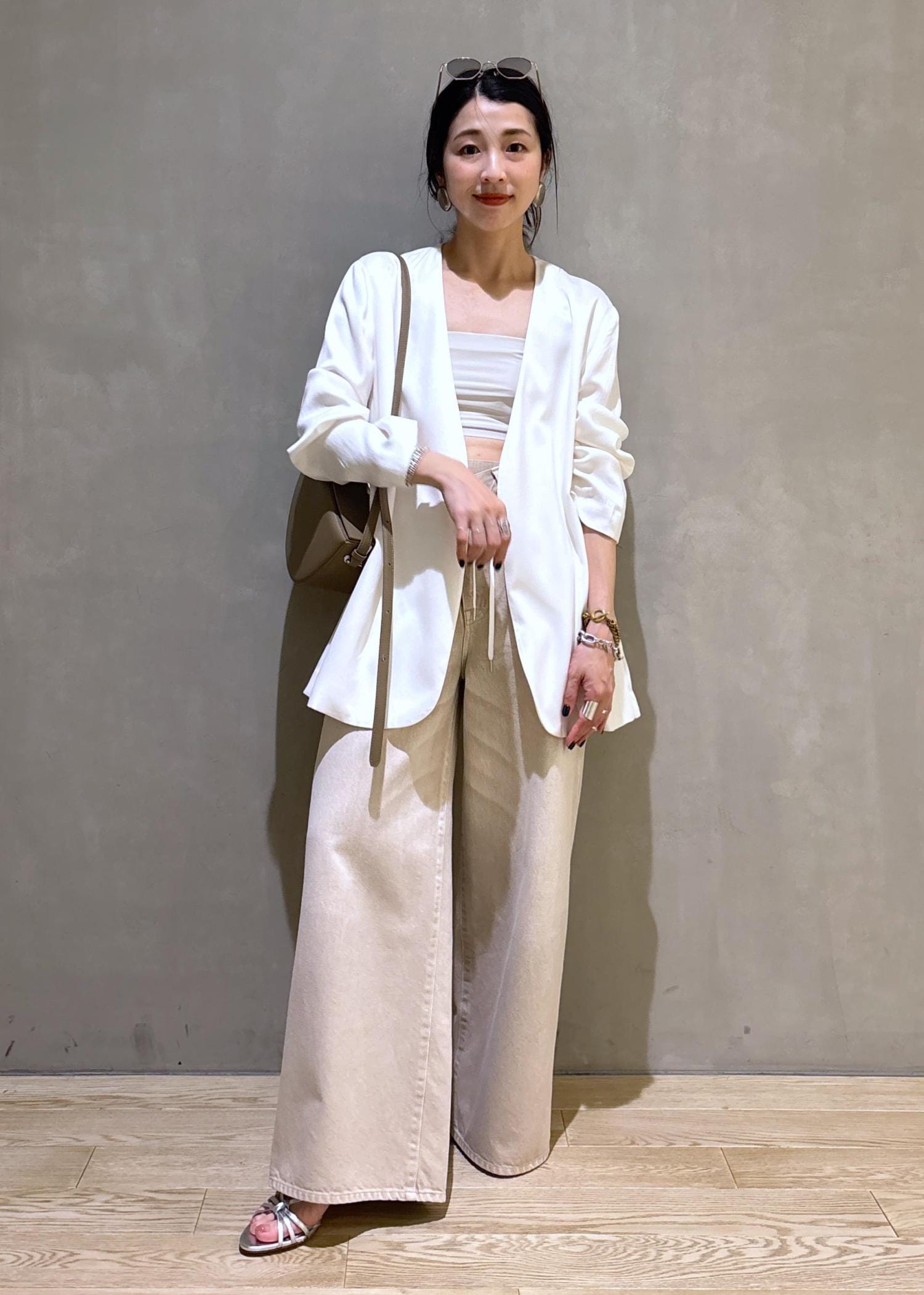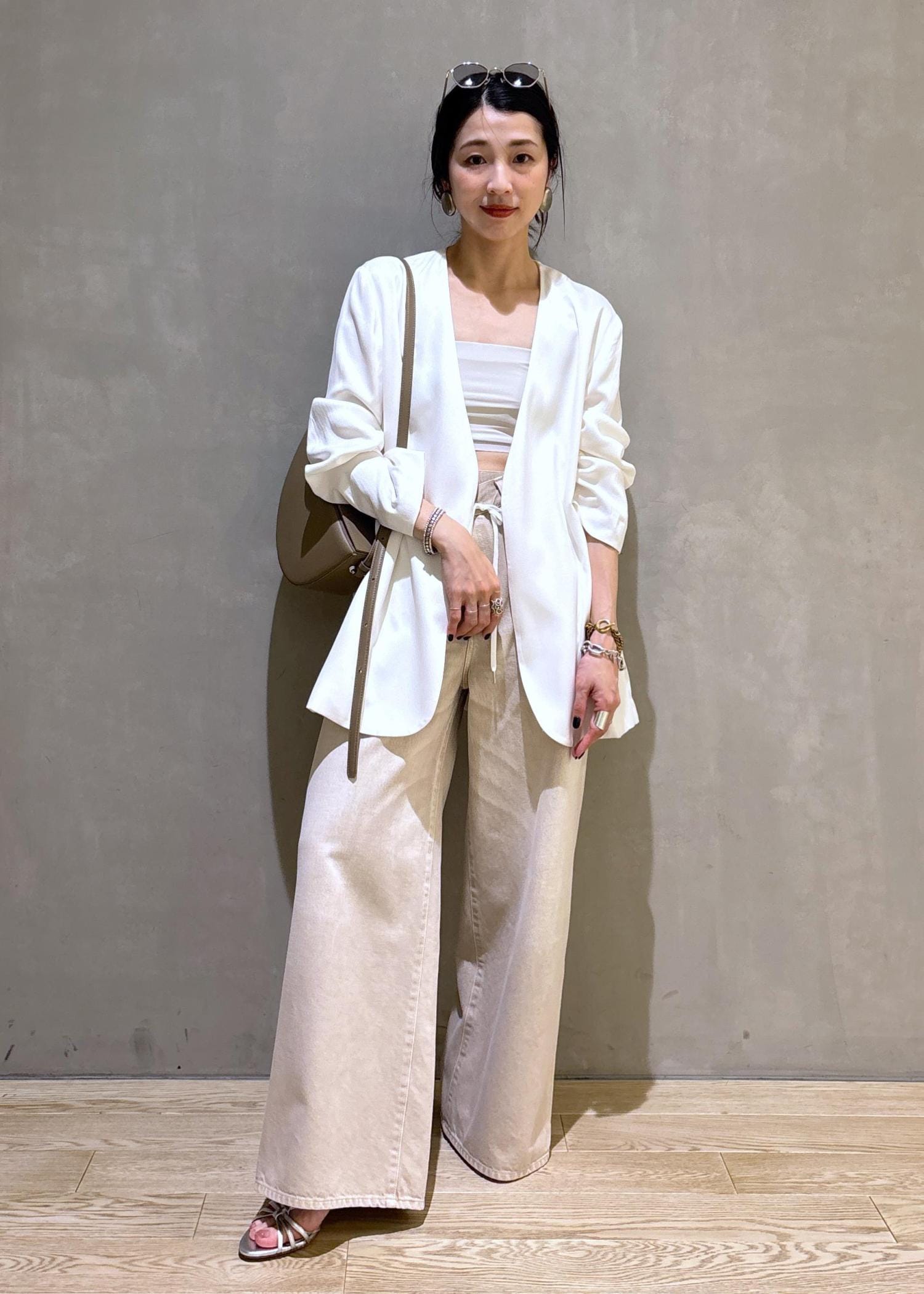 ノーカラーのキレイめなジャケットなので、あえてボトムはカジュアルなデニムで合わせ、カラーはワントーンで淡めのカラーでまとめてみました。
