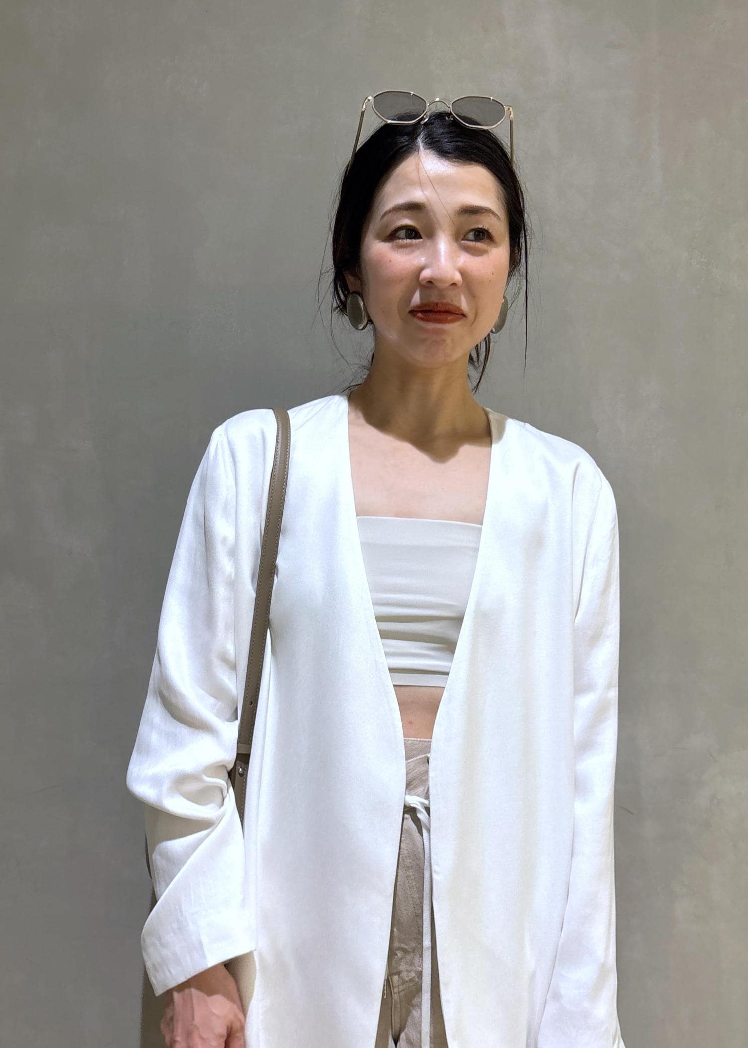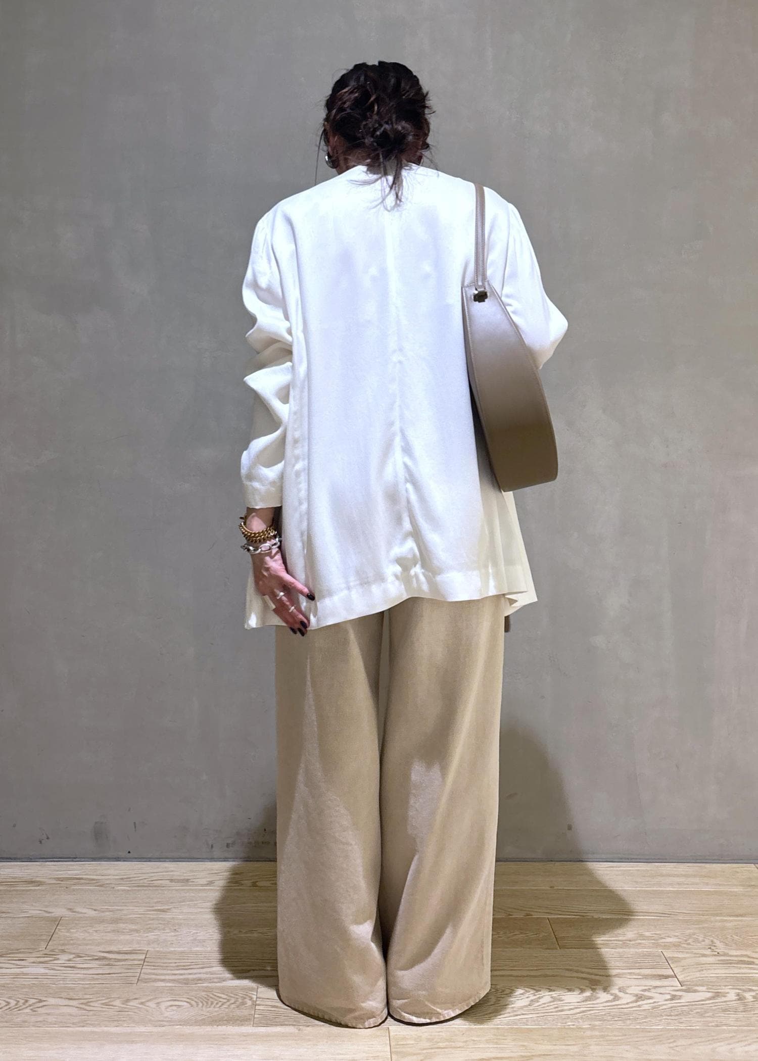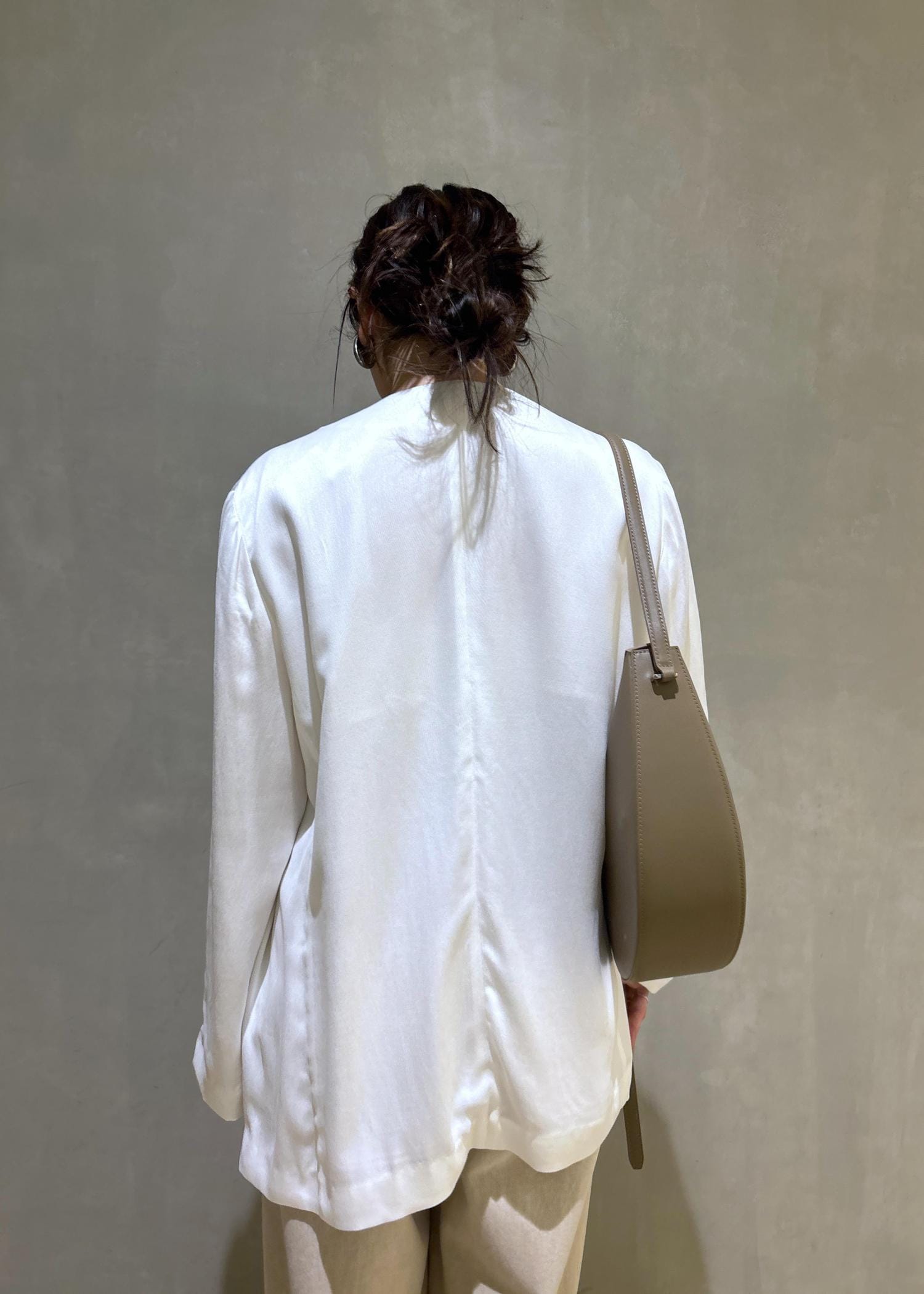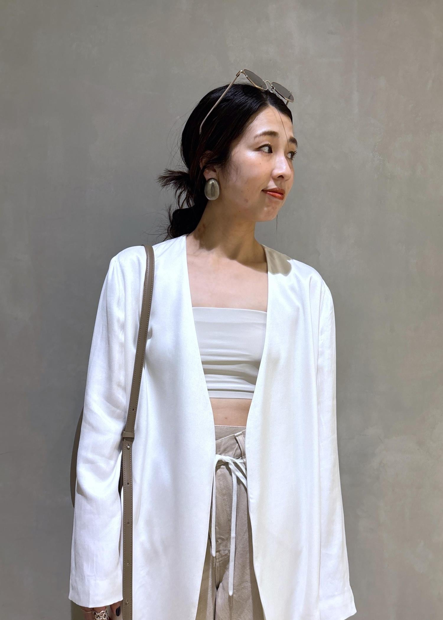 ノーカラーのキレイめなジャケットなので、あえてボトムはカジュアルなデニムで合わせ、カラーはワントーンで淡めのカラーでまとめてみました。