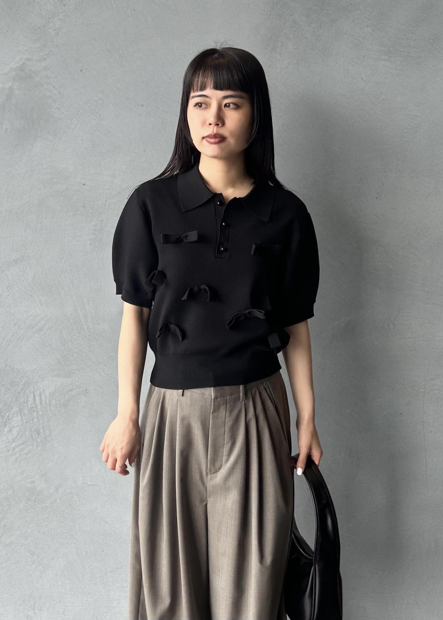リボンモチーフがキャッチーなニット。ブラックは同色でシックな印象です。