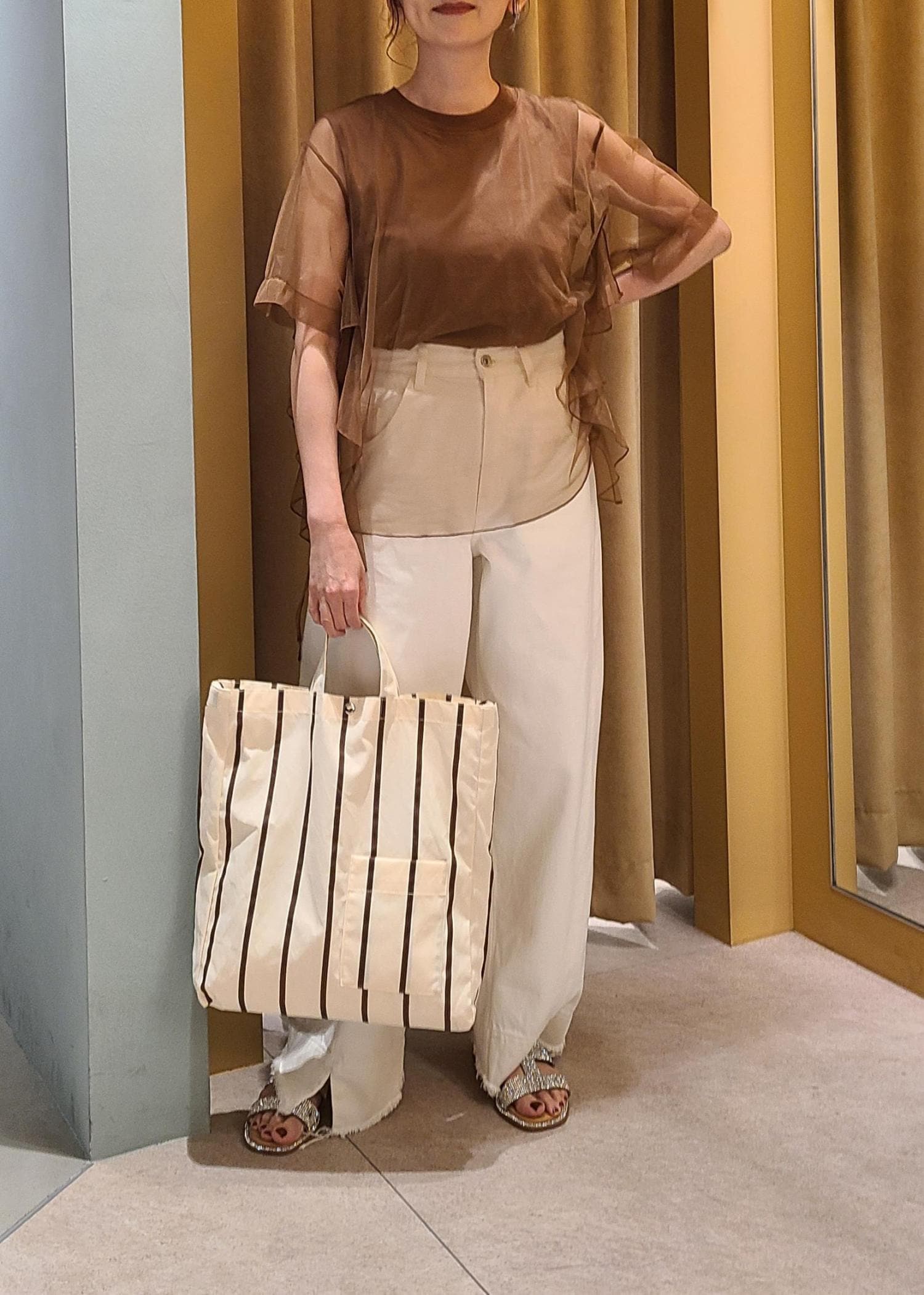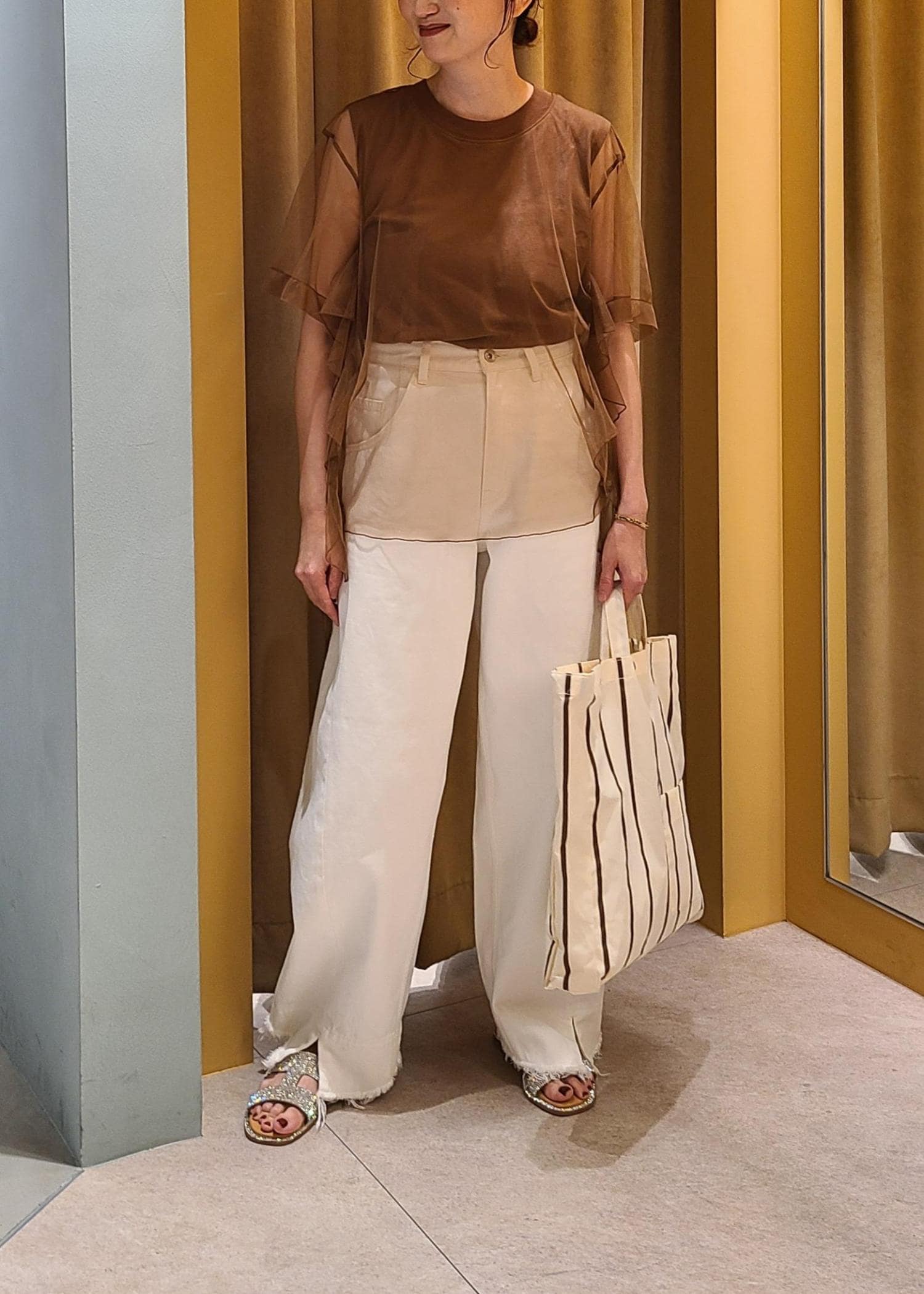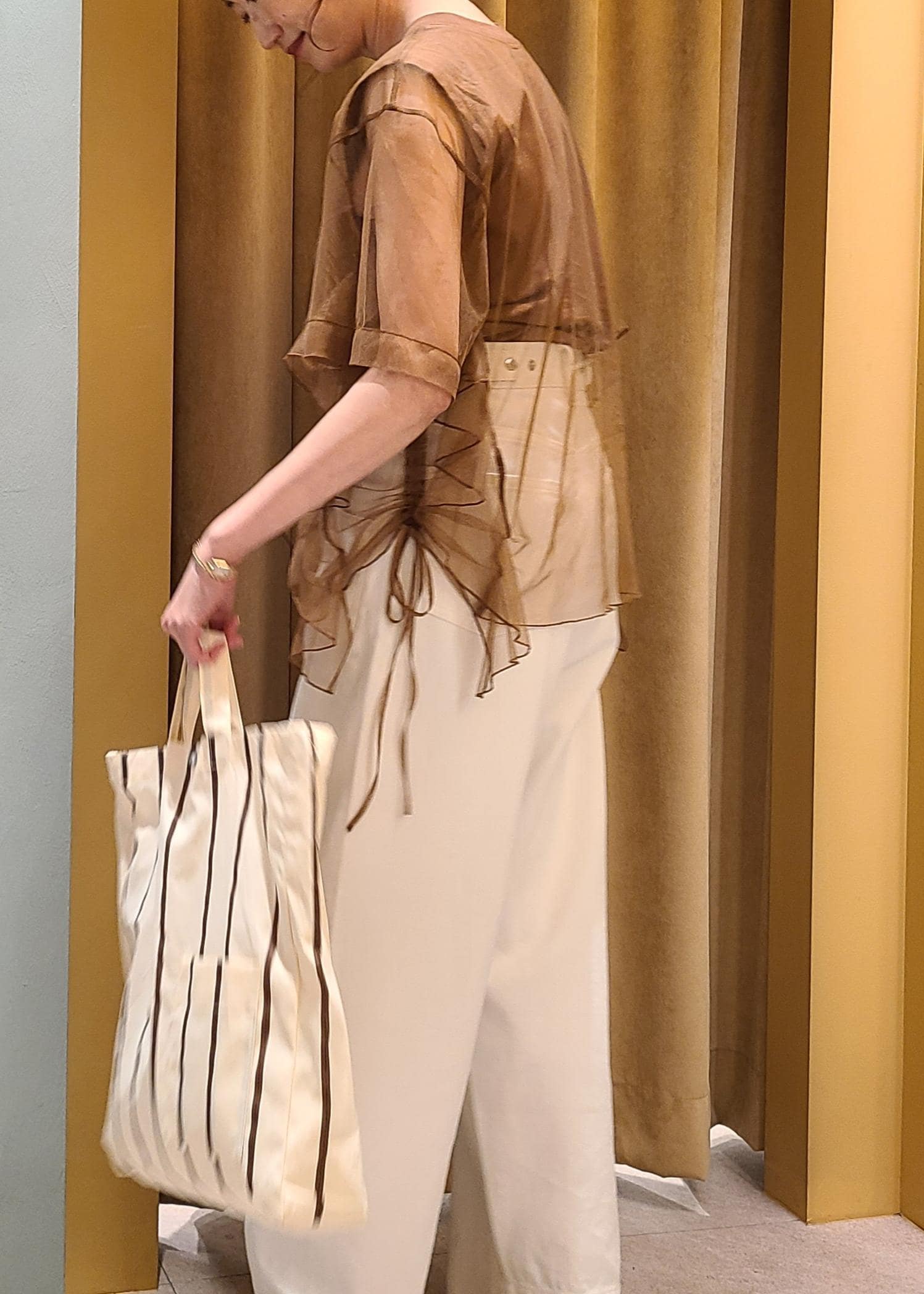 ADAM ET ROPÉ FEMME【サステナブル】・【定番人気】ギャザーチュールトップスブラウン / F¥14,300レビュー身長159cmでヒップにかかる着丈。チュールが柔らかく着心地がよいです。