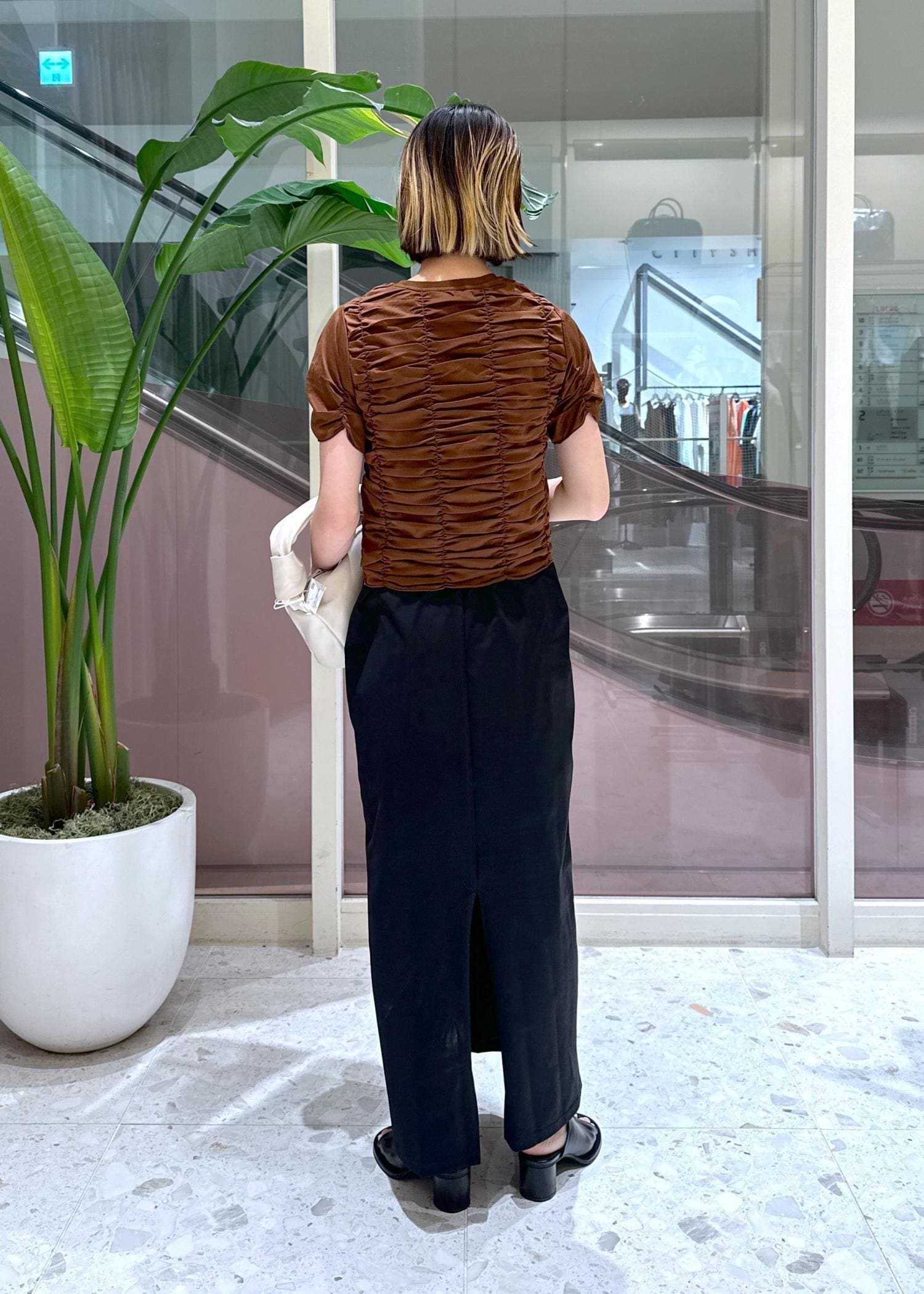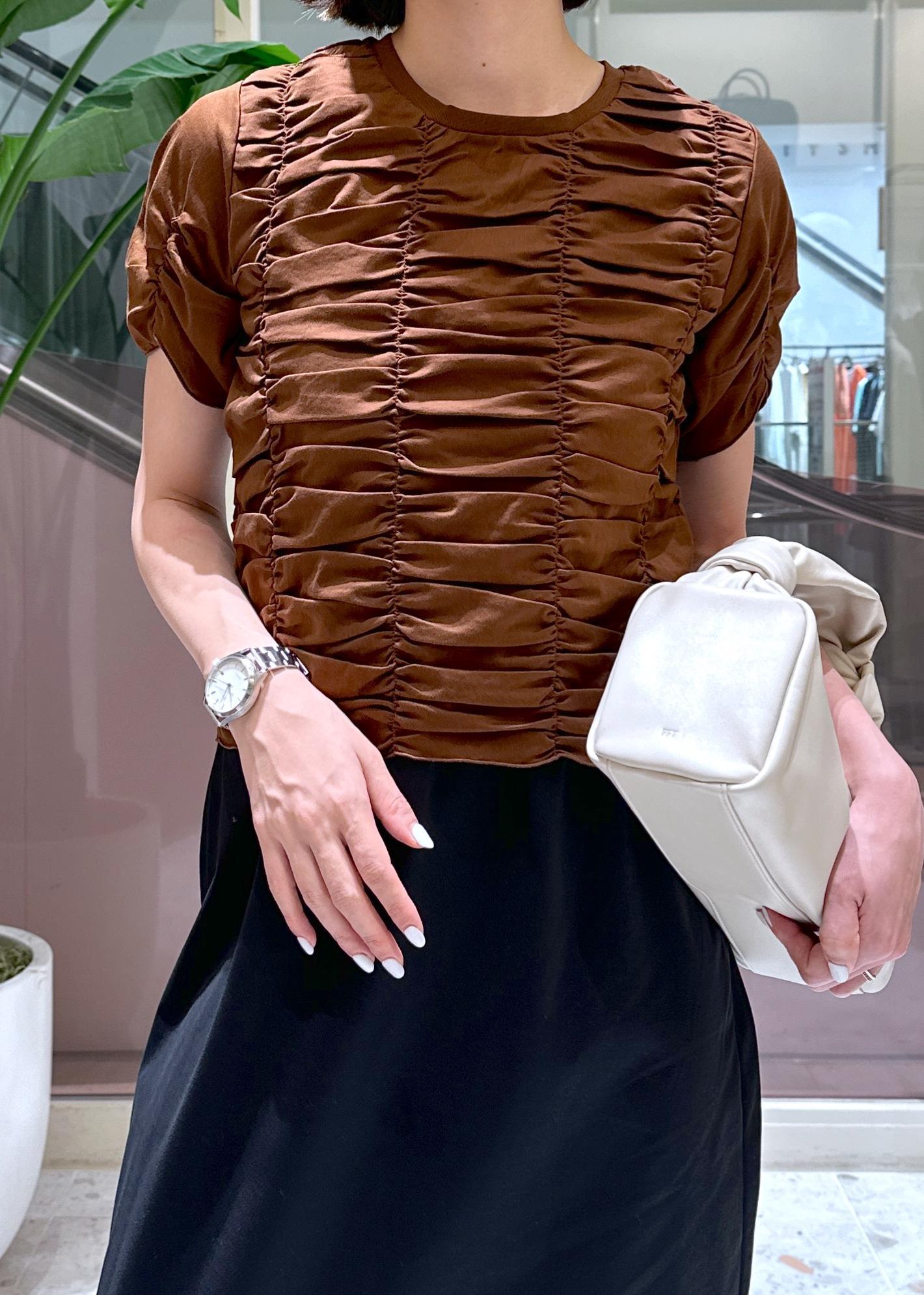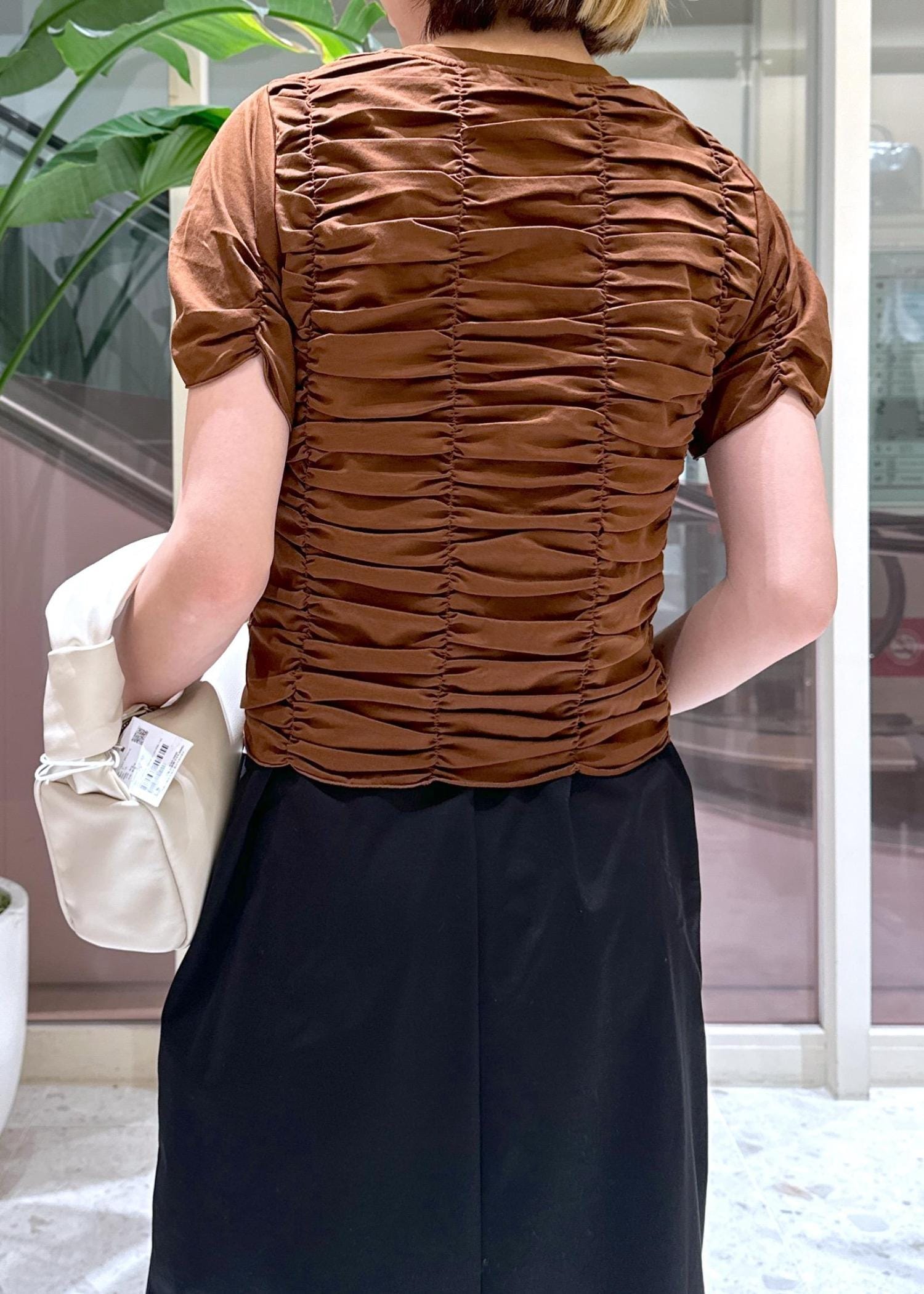 伸縮性のある柔らかなコットン素材で、シャーリングのデザインがとても素敵。コンパクトながら程よく肌離れするサイジングで夏に活躍しそうなTシャツです◎