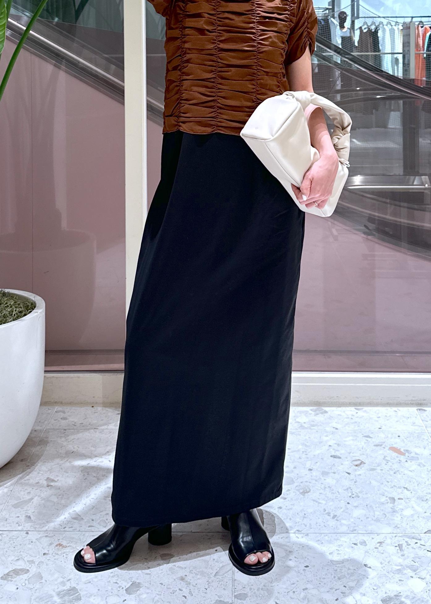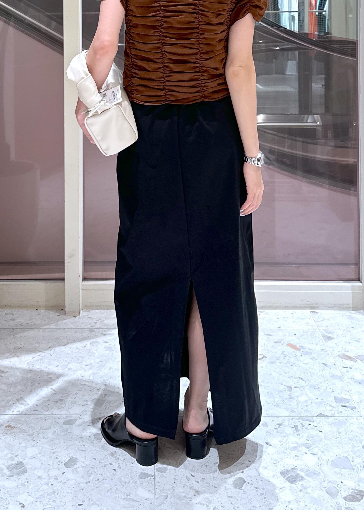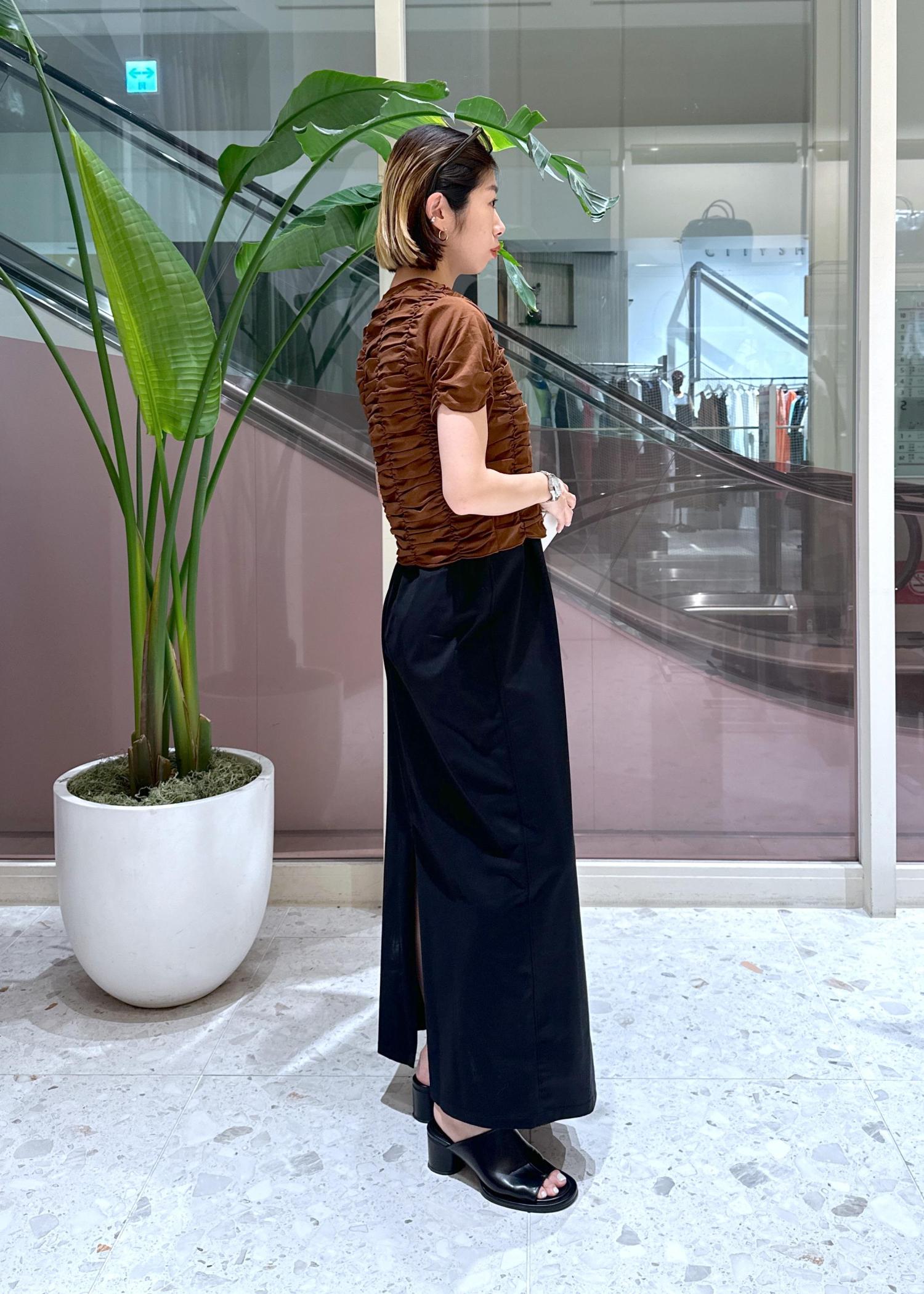 伸縮性のある柔らかなコットン素材で、シャーリングのデザインがとても素敵。コンパクトながら程よく肌離れするサイジングで夏に活躍しそうなTシャツです◎