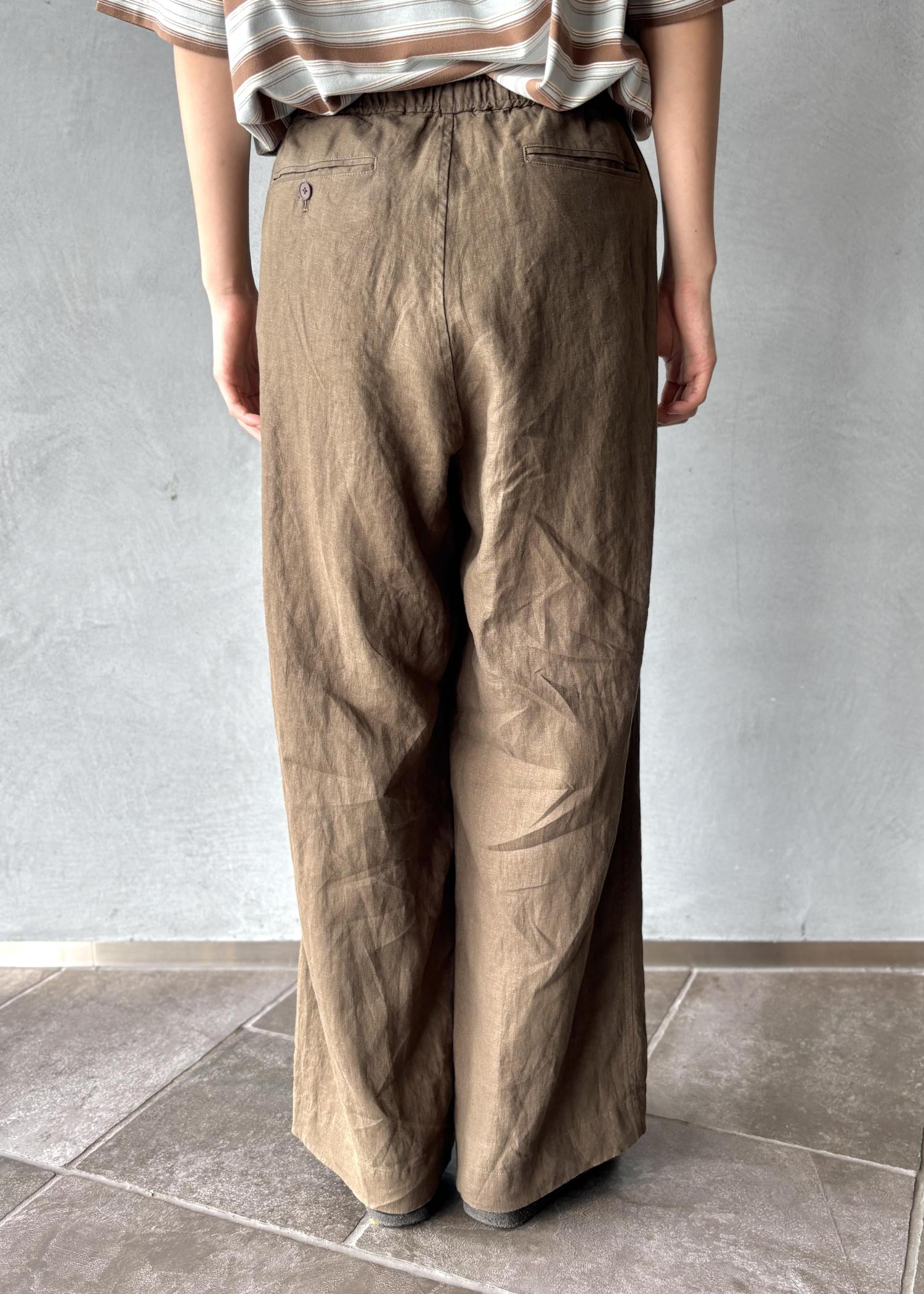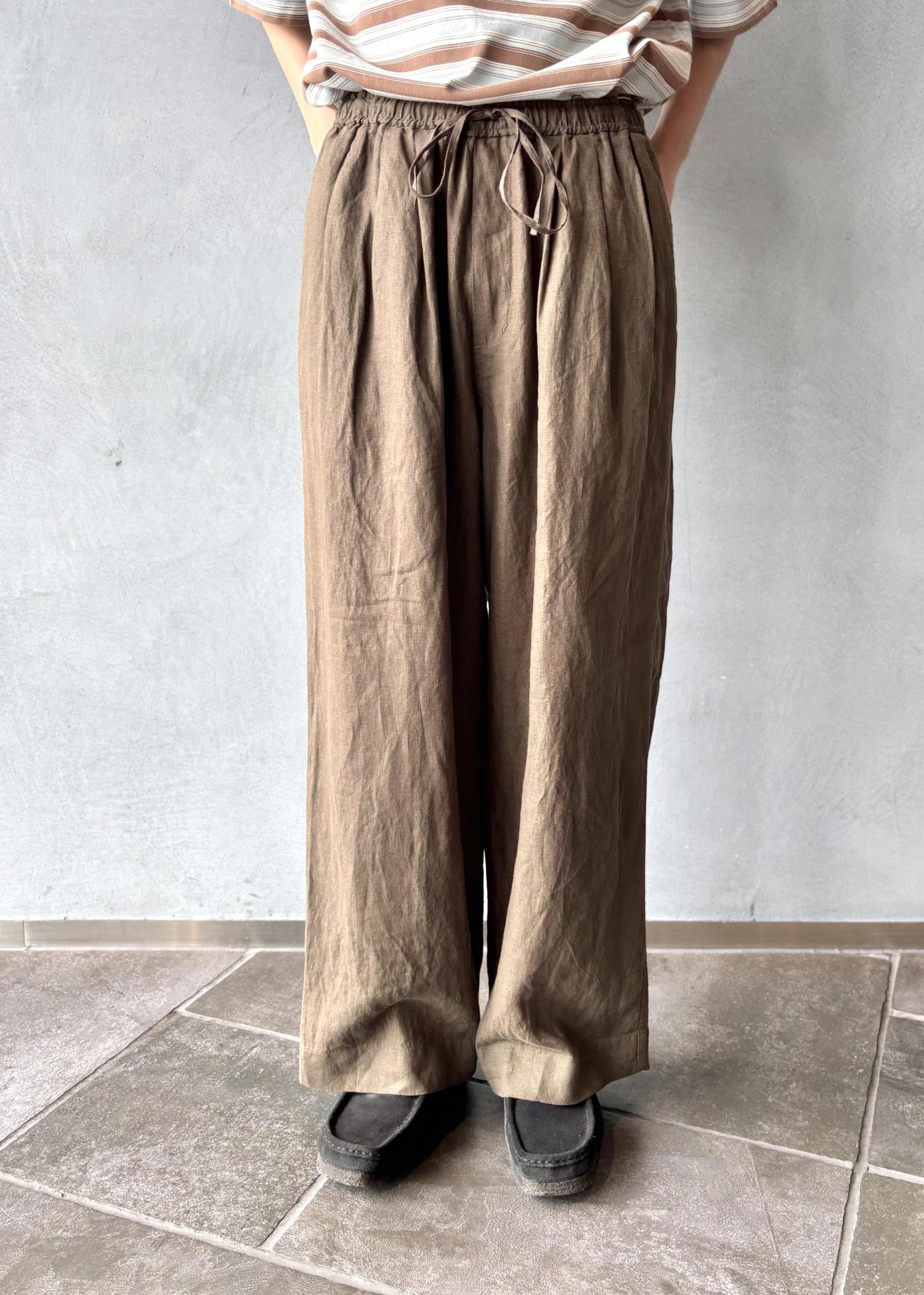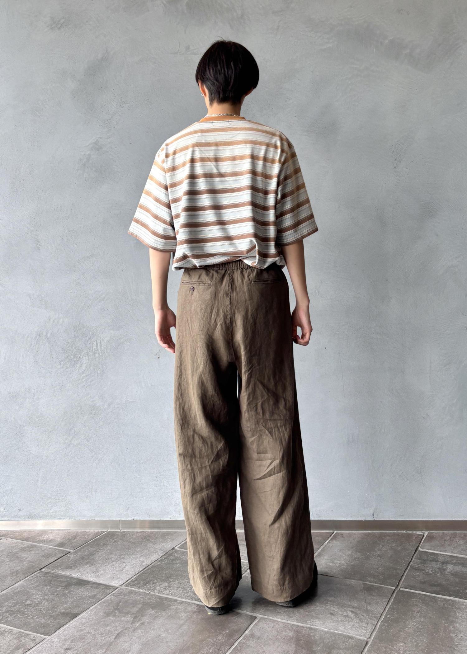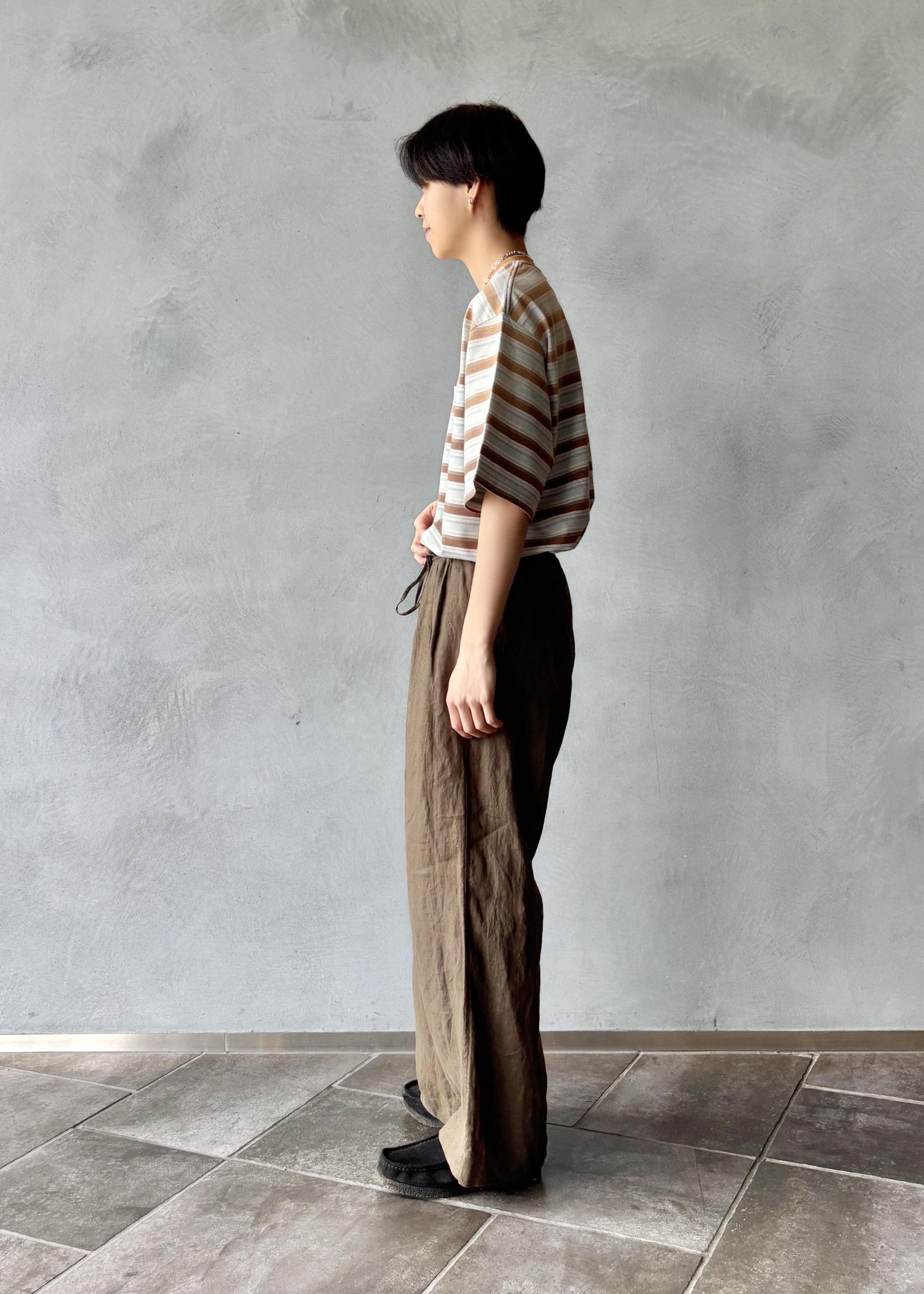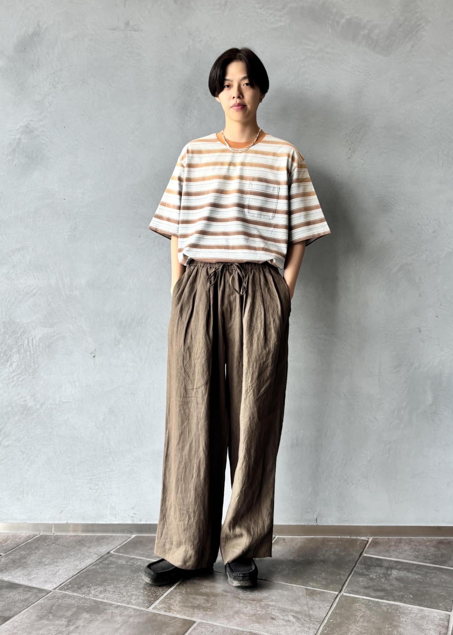 トレンド感のあるボーダーTシャツにリネンパンツの超リラックススタイルはこの夏におすすめのコーディネートです