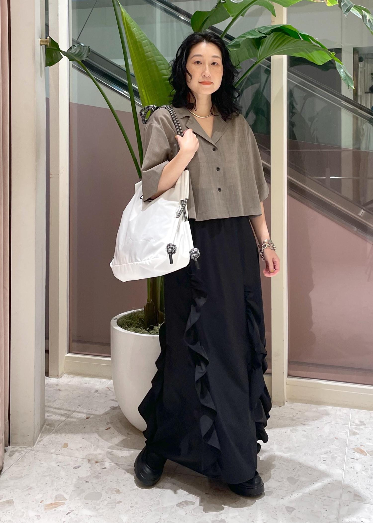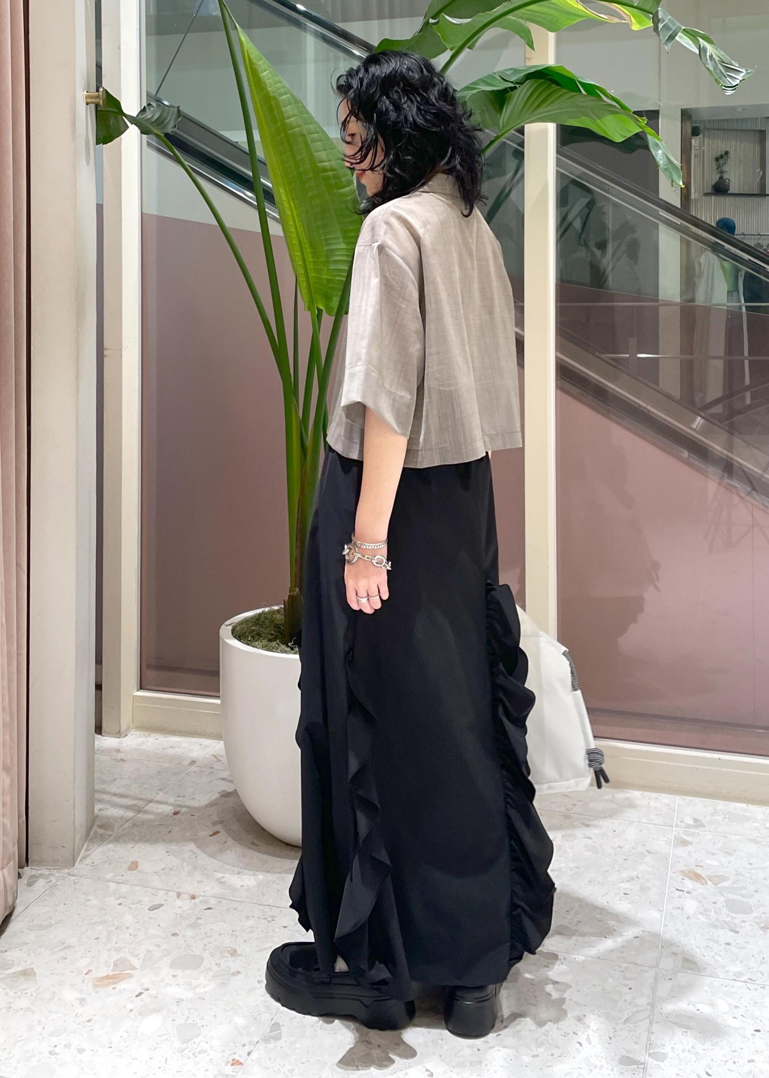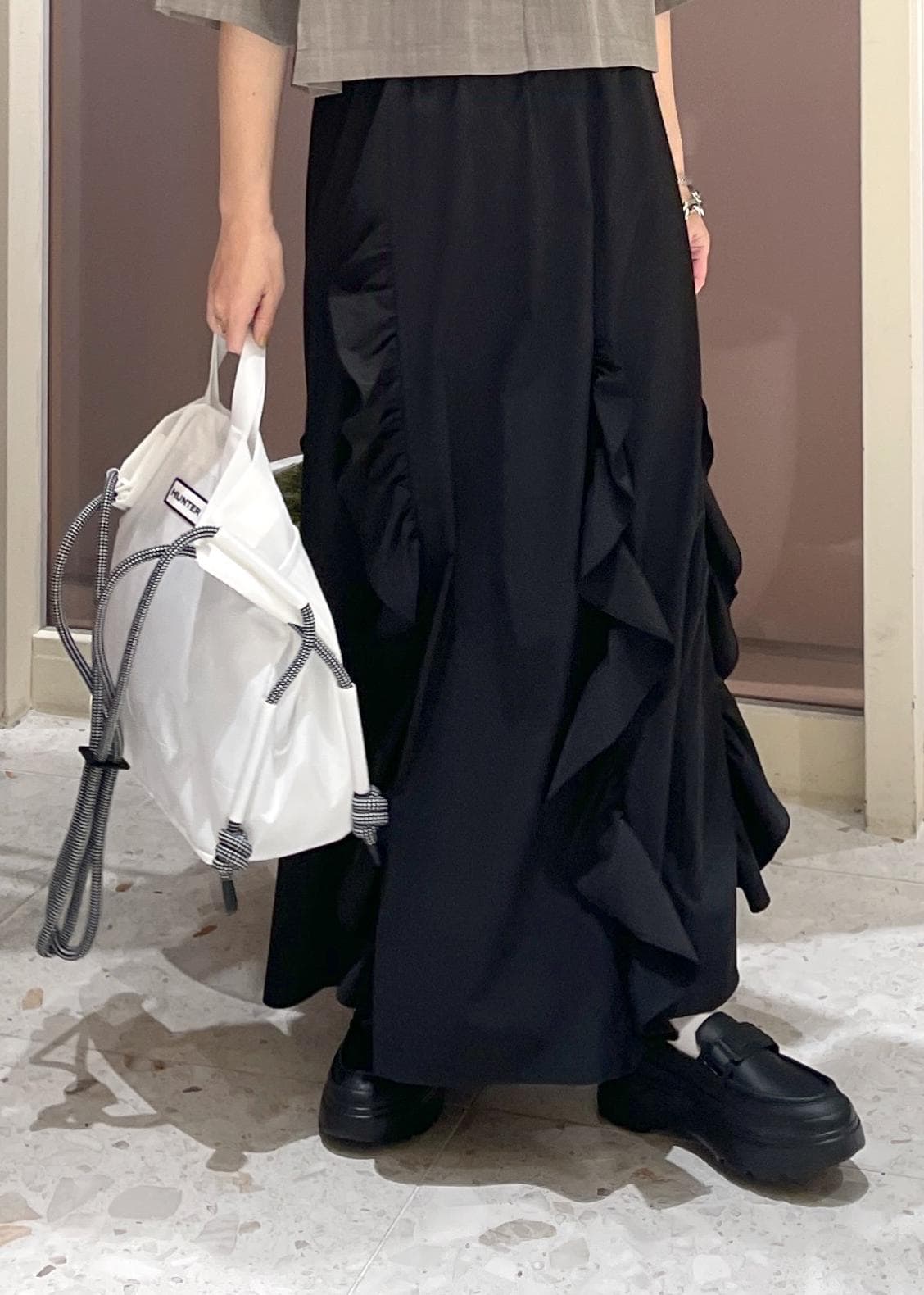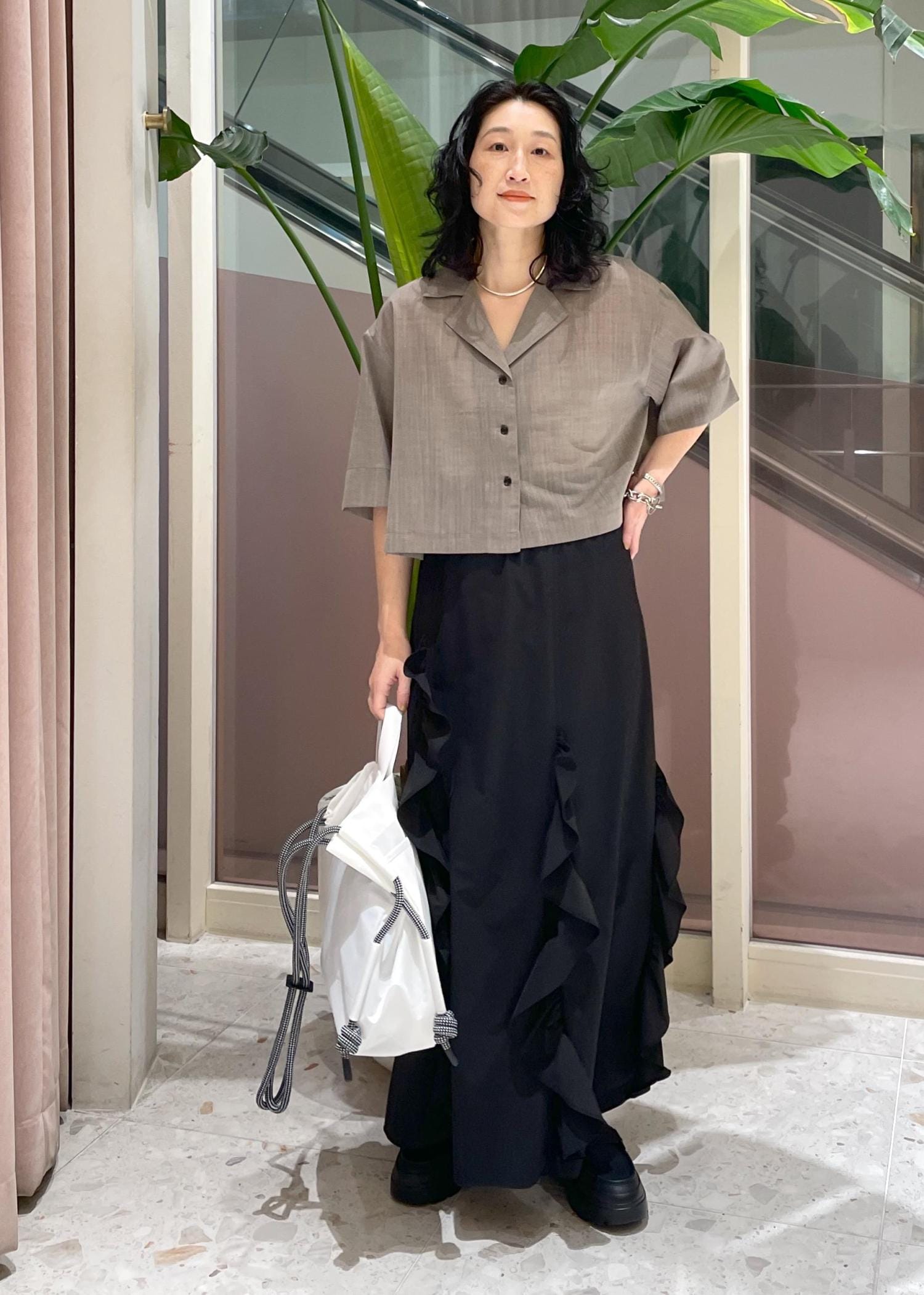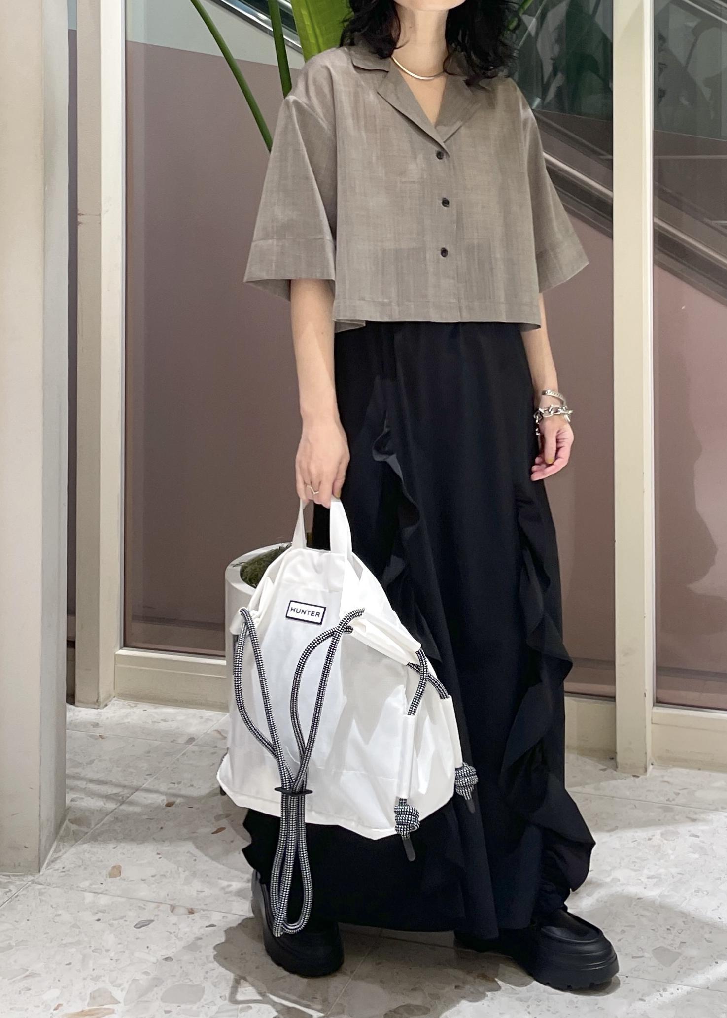 着用したシャツもジメっとした気温にも快適に、スカートは撥水ではないものの、シャカっとした素材が雨の日も気兼ねなく履けそうです。