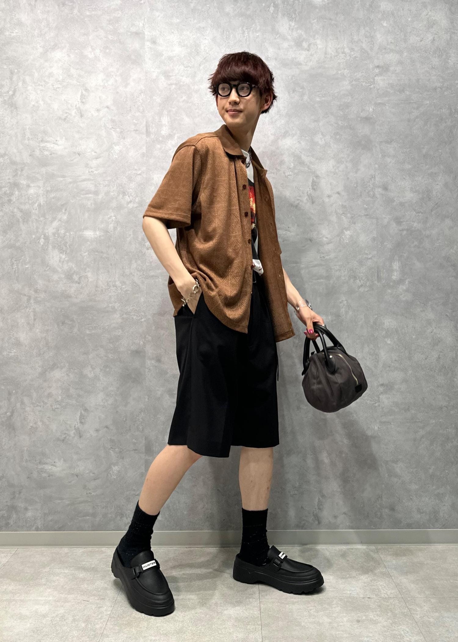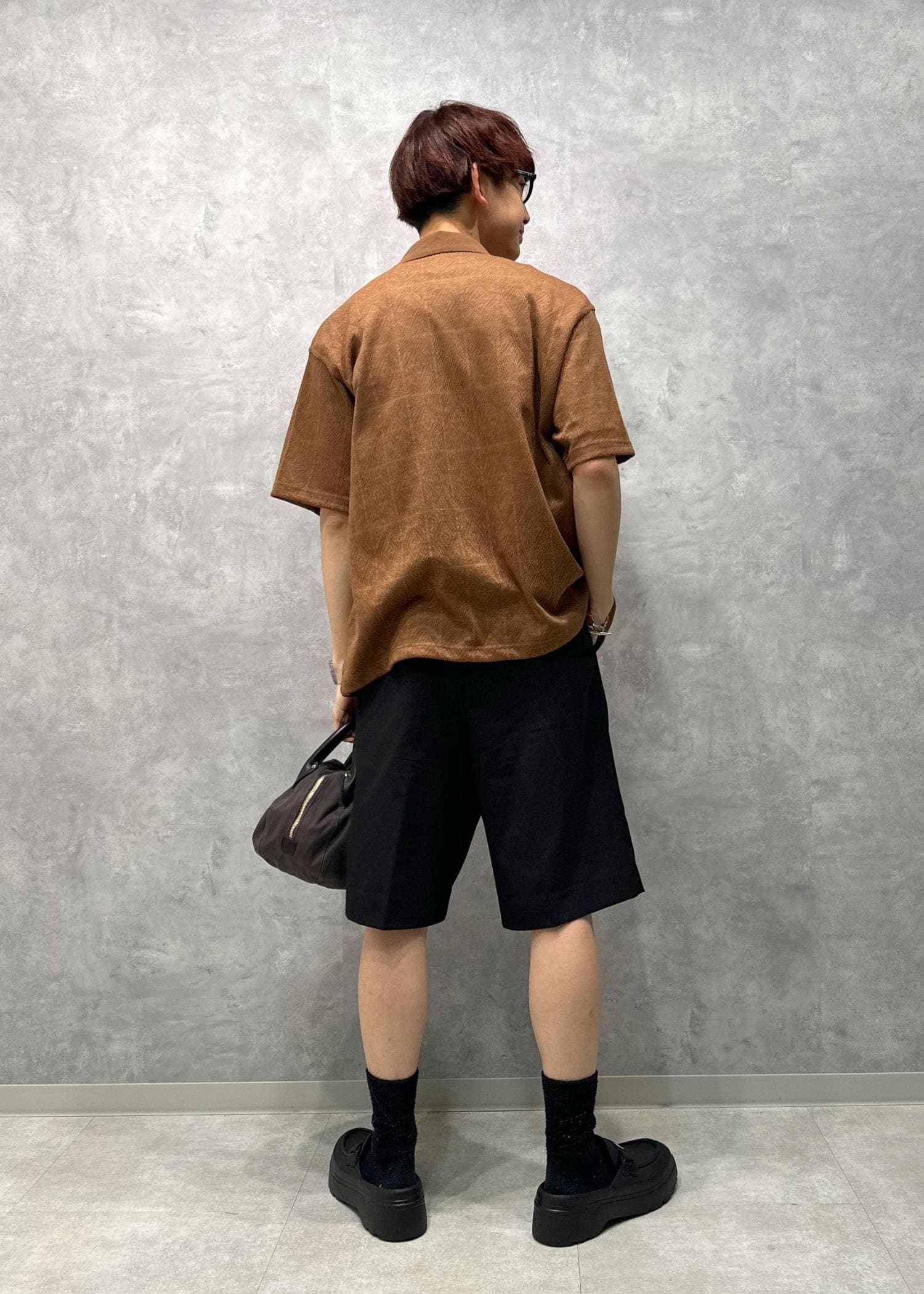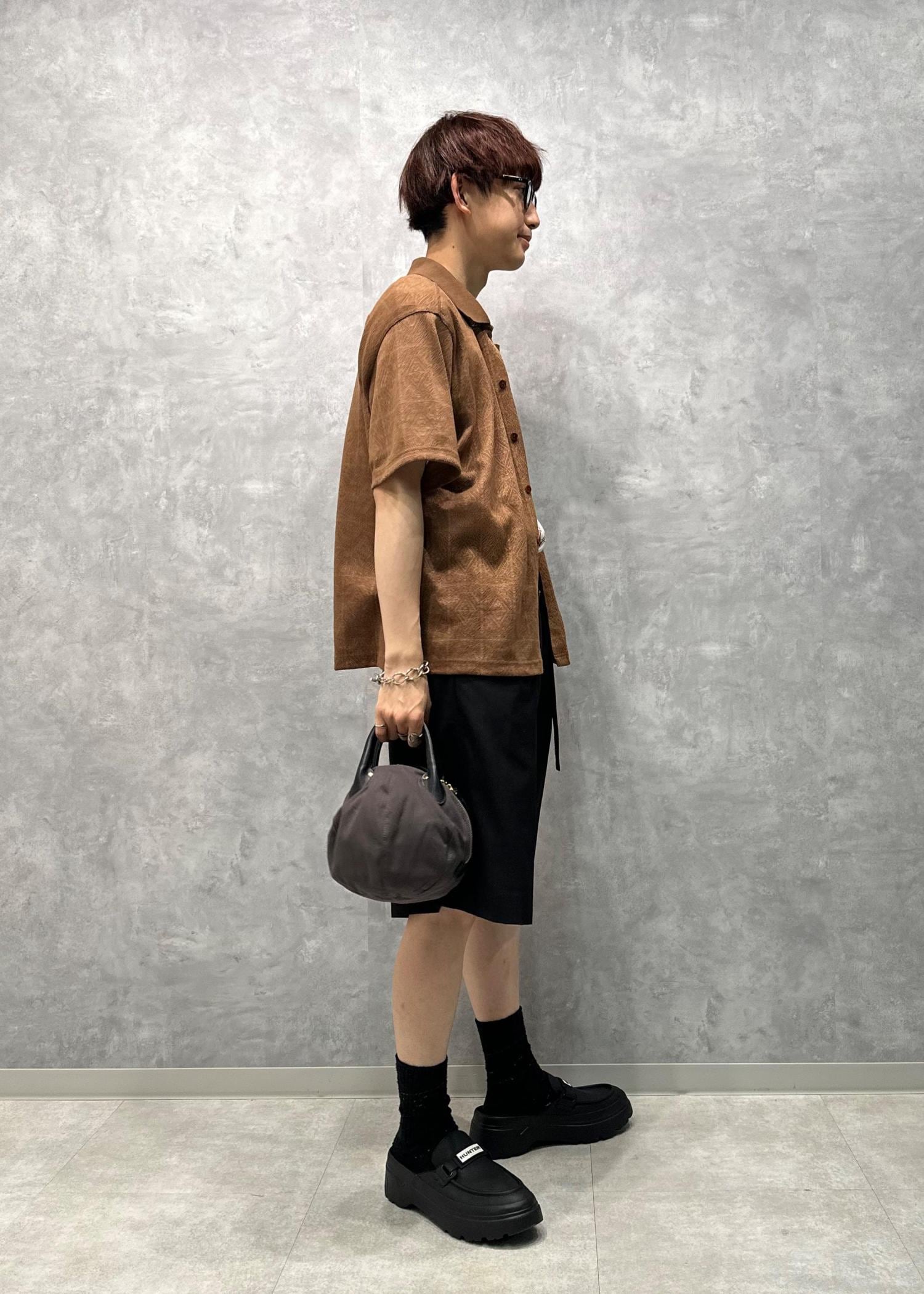 黒のショーツにレースシャツを合わせた大人ながらもかわいらしい遊び心を加えたコーデです。レースシャツは透け感が弱いのでフェミニン感はそこまで強くないです。レザーシューズで上品に。チャコールのバッグで存在感がありながらもコーデに馴染ませました。