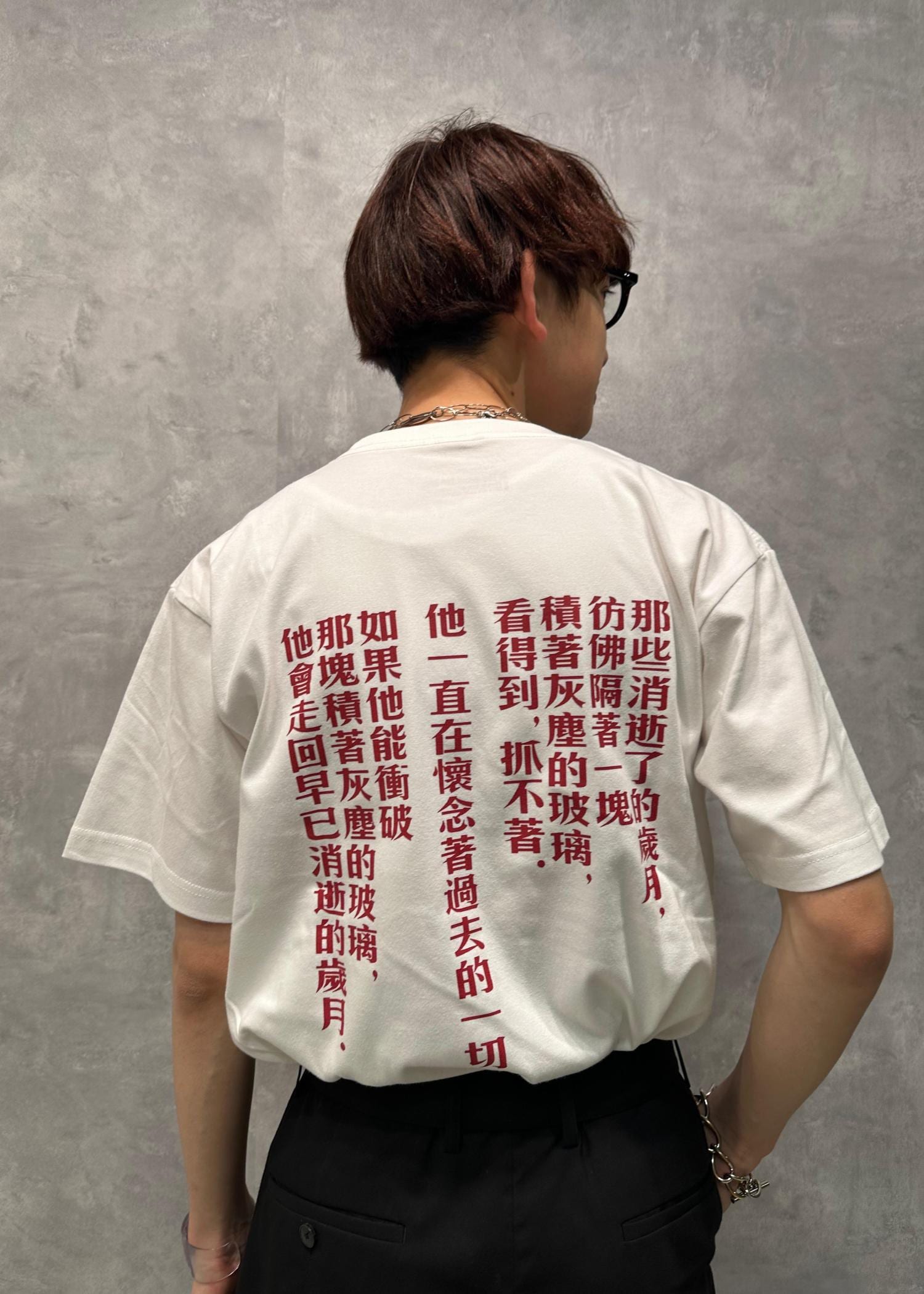 花様年華Tシャツ。劇中の印象的なシーンや映画タイトル、劇中のテロップと組み合わせたデザインのTシャツです。