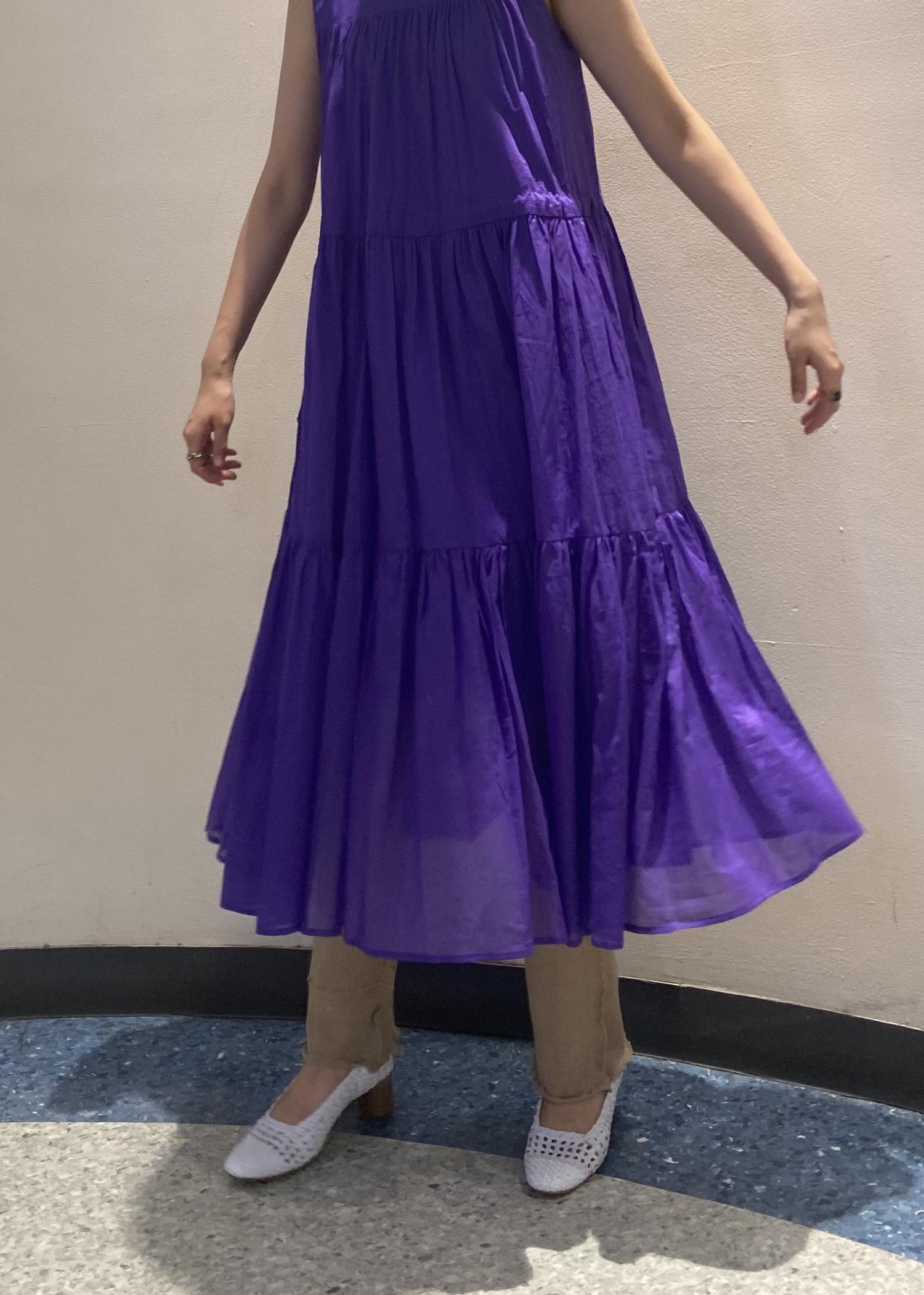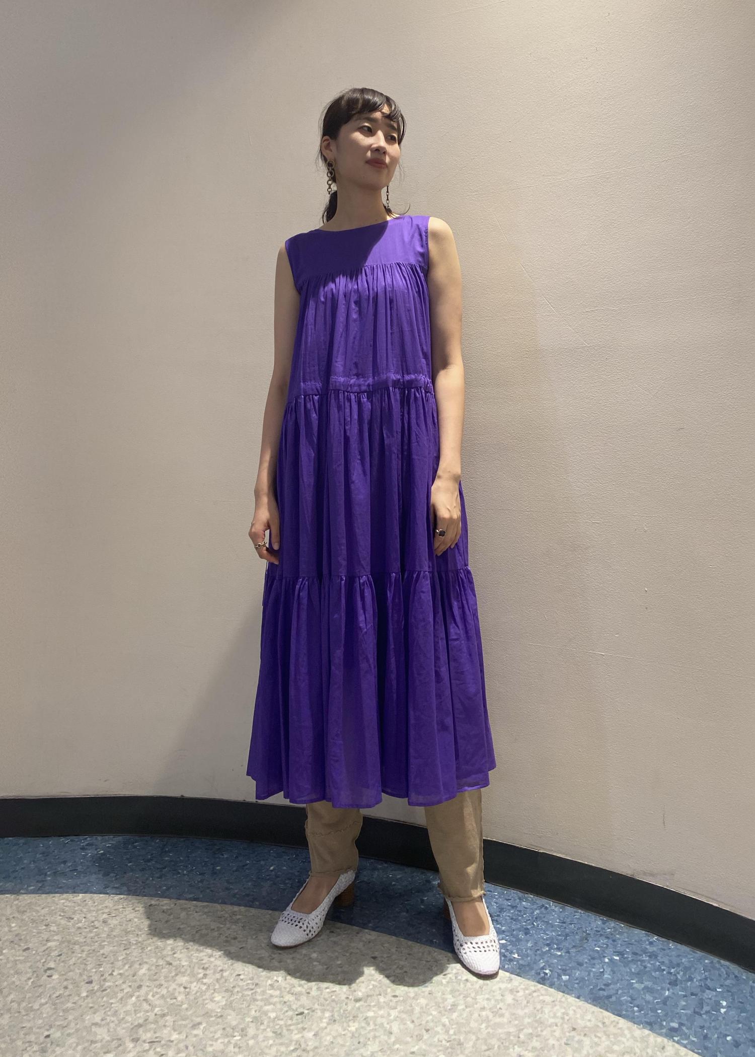 濃い目のパープルカラーなのでレイヤードで合わせるときは明るいホワイトやベージュを合わせていただくと夏らしい印象で着ることができます。