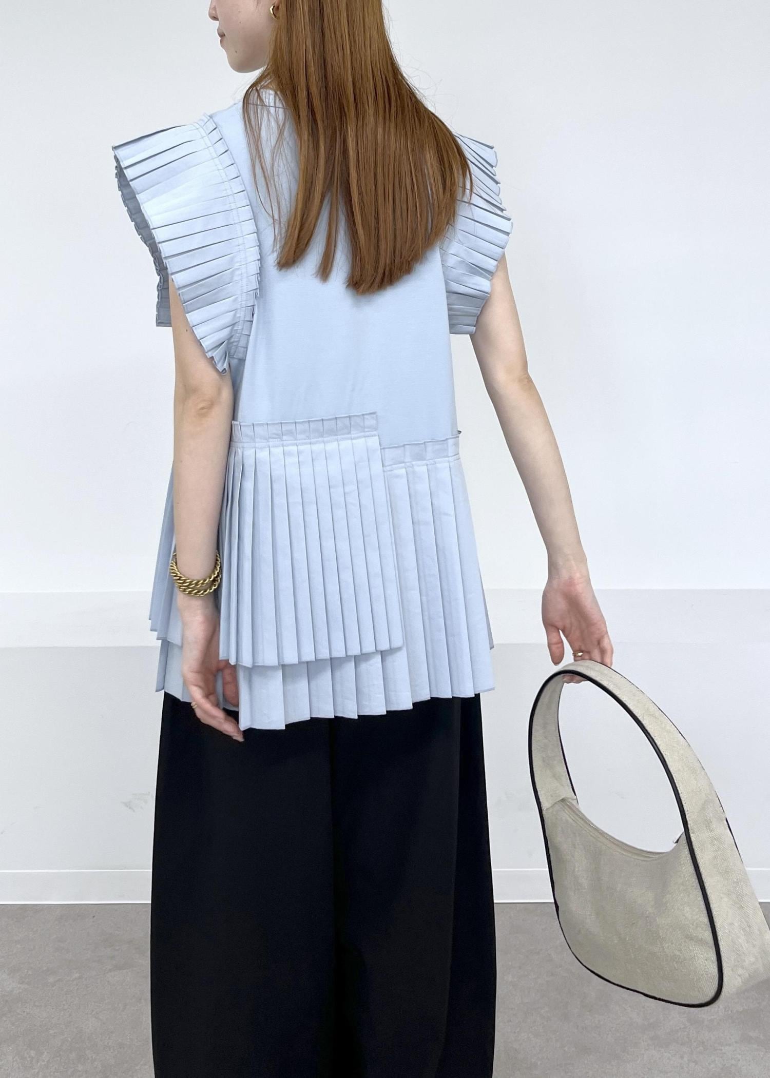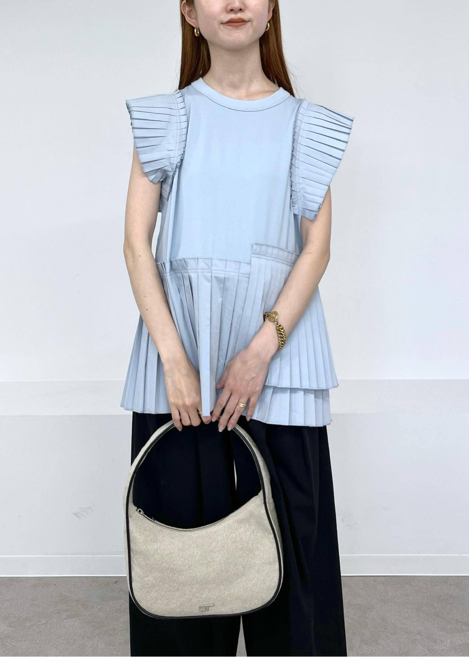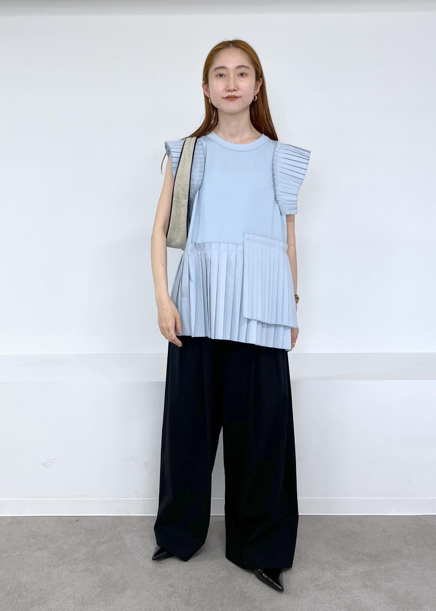 アウトレットADAM ET ROPÉ FEMME【サステナブル】プリーツコンビプルオーバーサックス / F¥5,720レビューサラッと着られる素材感で、ノースリーブのような形なので夏でも涼しく快適に◎袖にプリーツがついていることで程よく二の腕をカバーしてくれます。着丈はおしりが隠れるくらいの長さです。