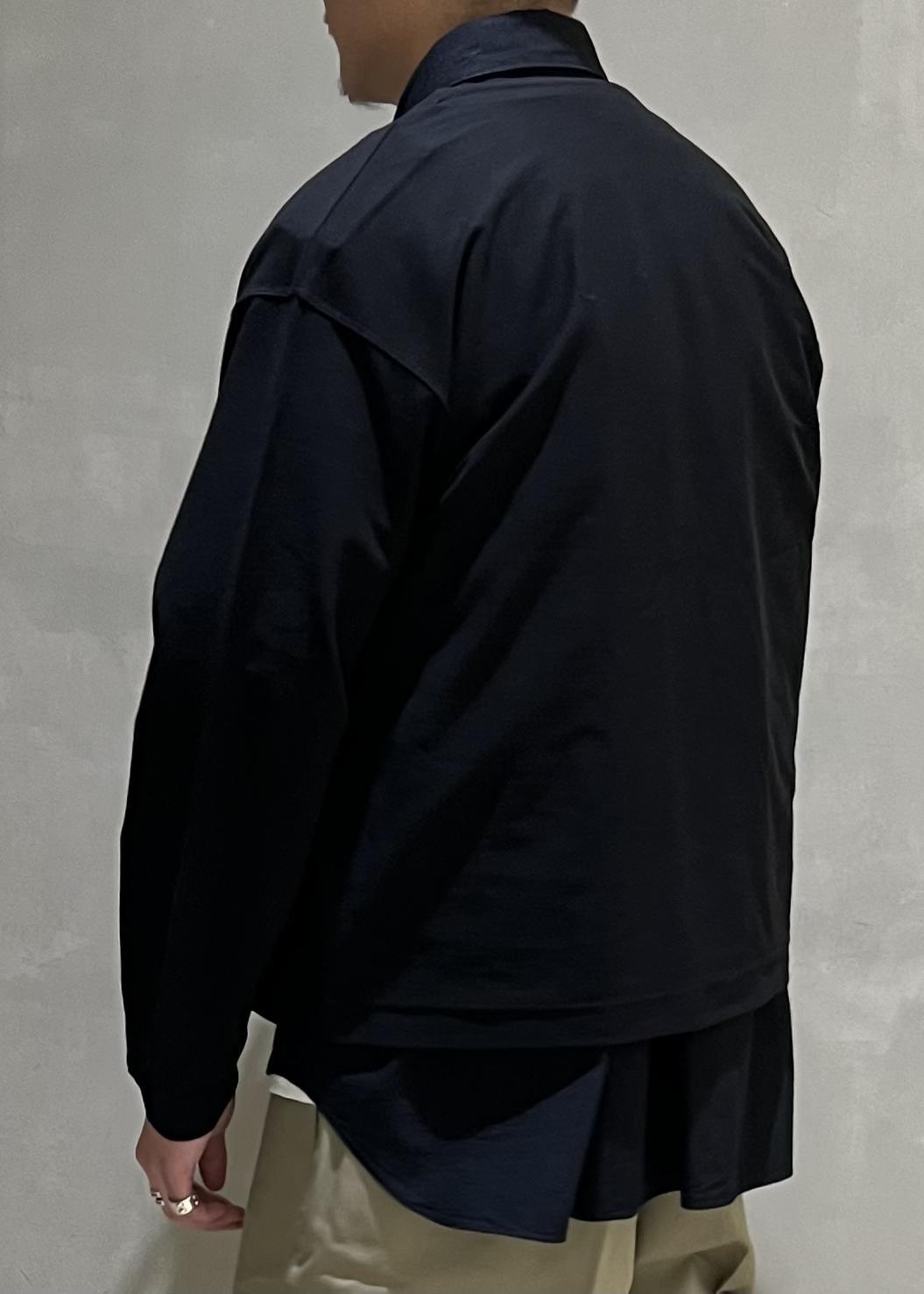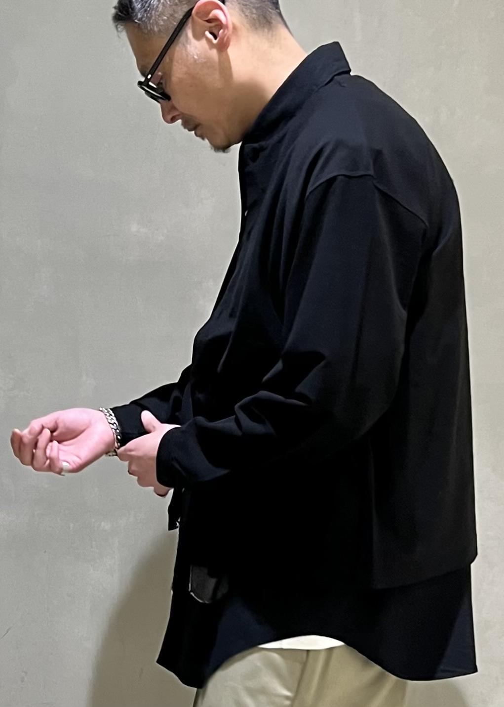 自身のジャストサイズは34(L)サイズですが、太めのシルエットにしたく、36(XL)サイズにアップして、ブラックのトーンのカーディガンとシャツで、クリーンな印象になるようにスタイリングしました!