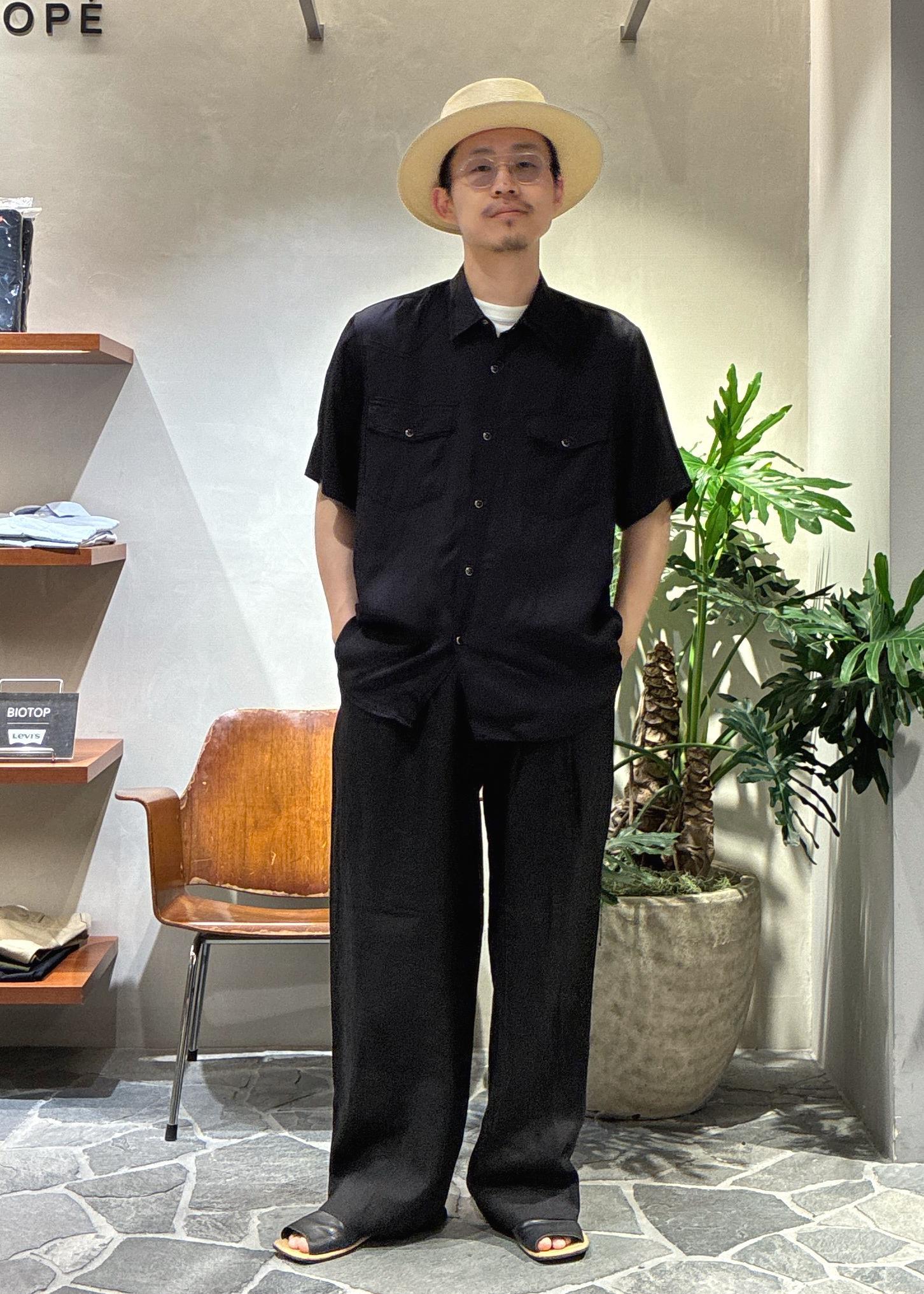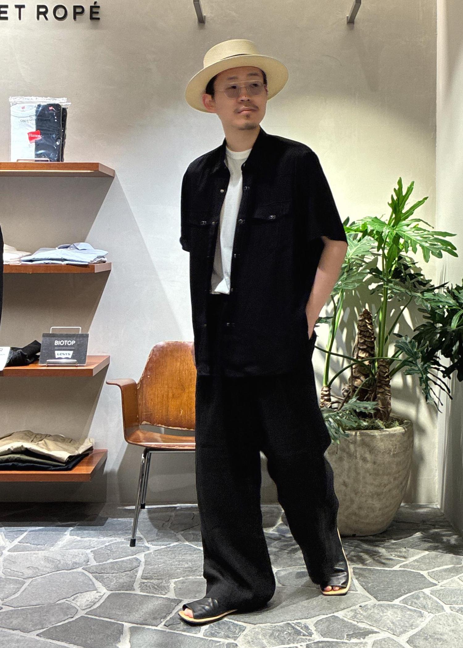 レーヨン素材のシャツとリネンのパンツの相性は間違いないですね◎