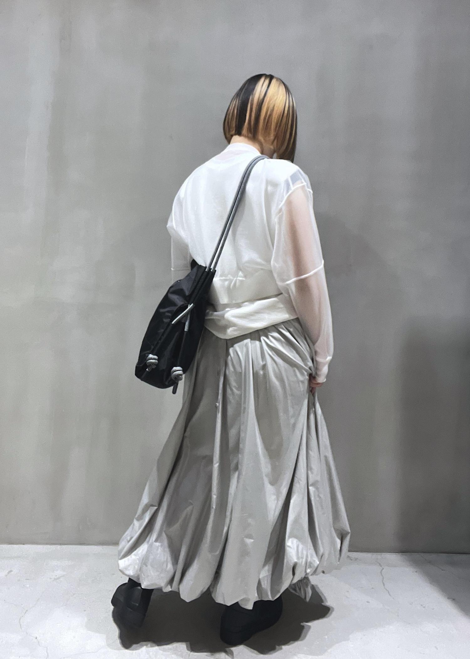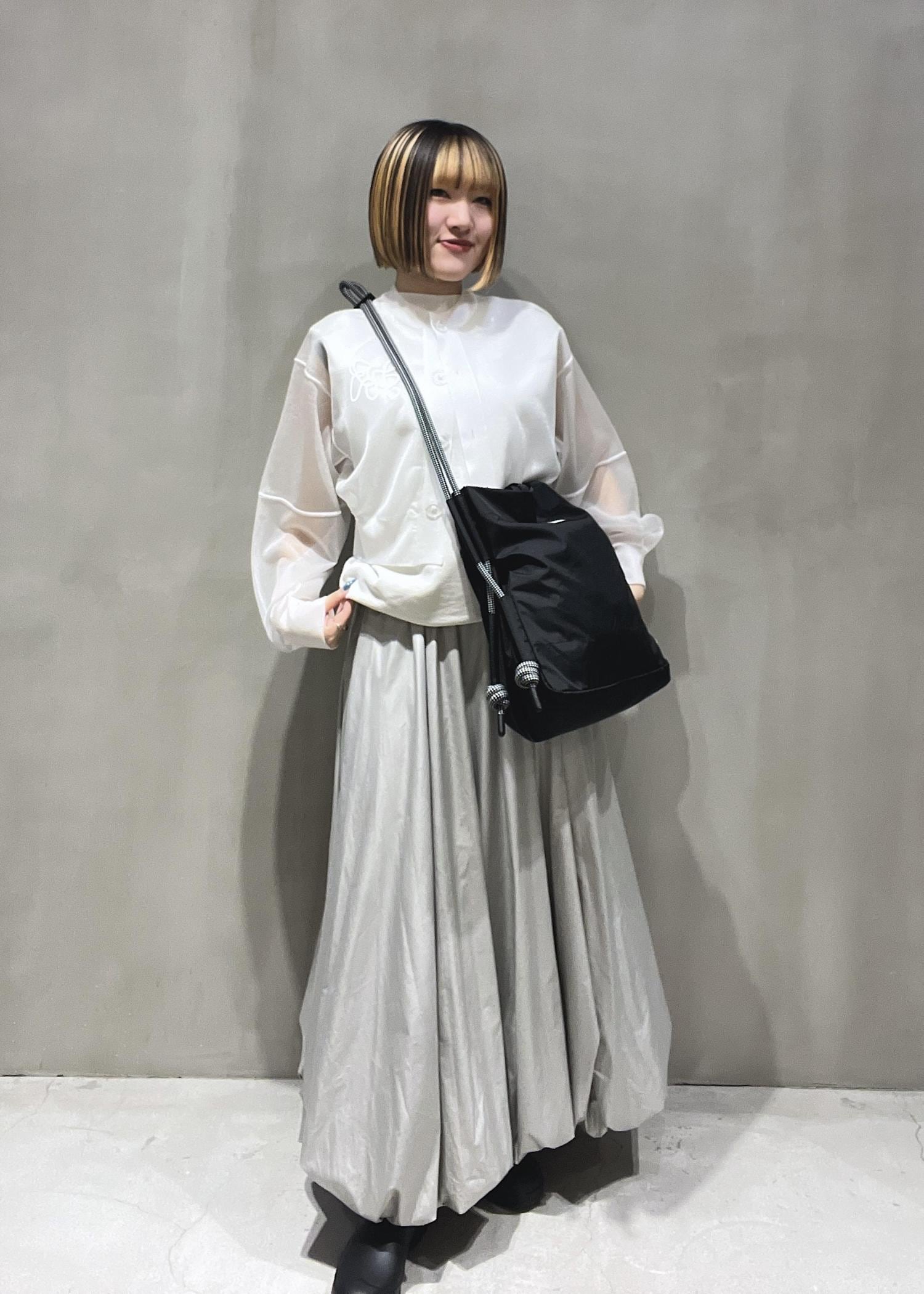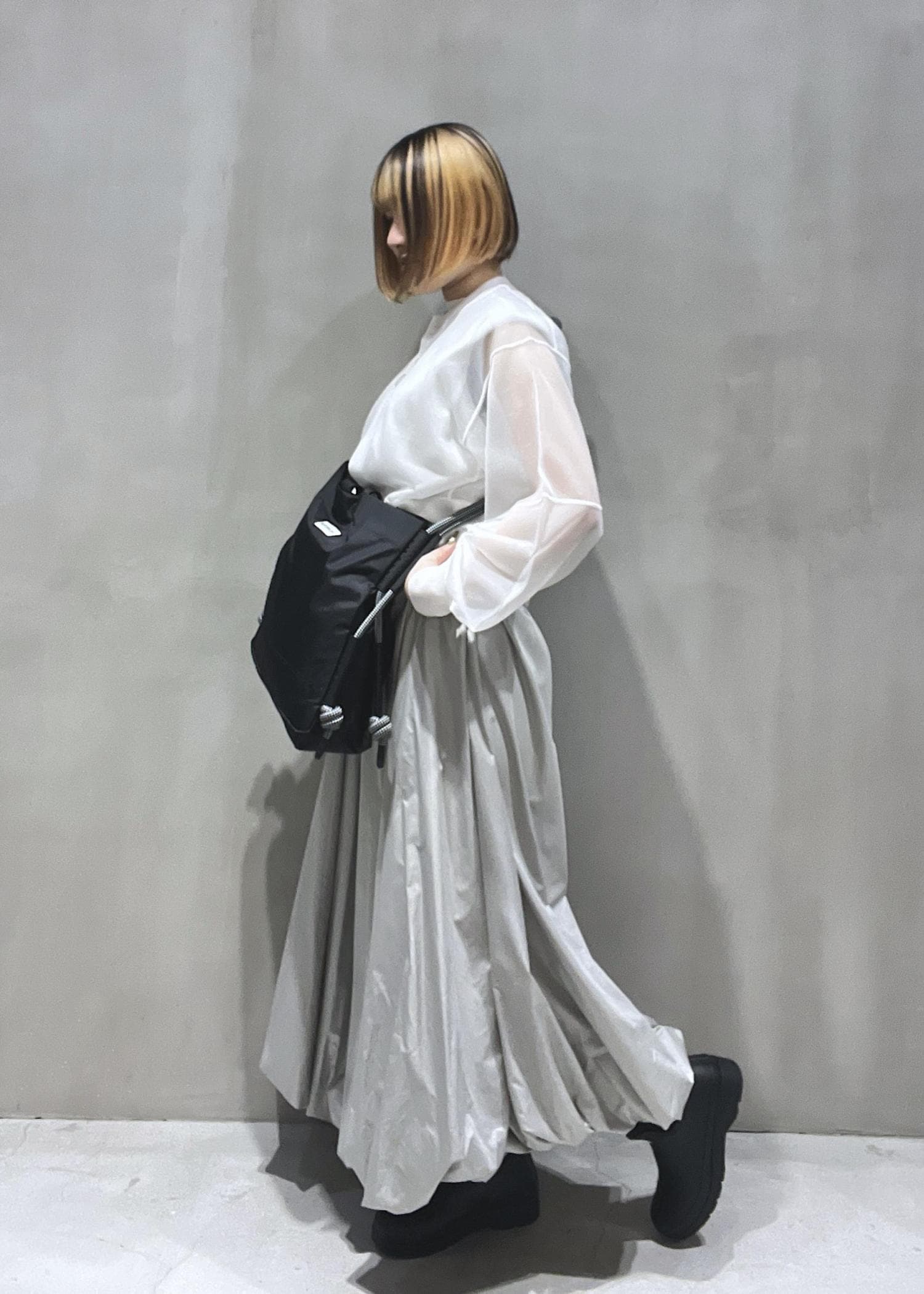 白を基調とした涼し気なコーデにナイロントートとブーツで黒を差し込みました♡