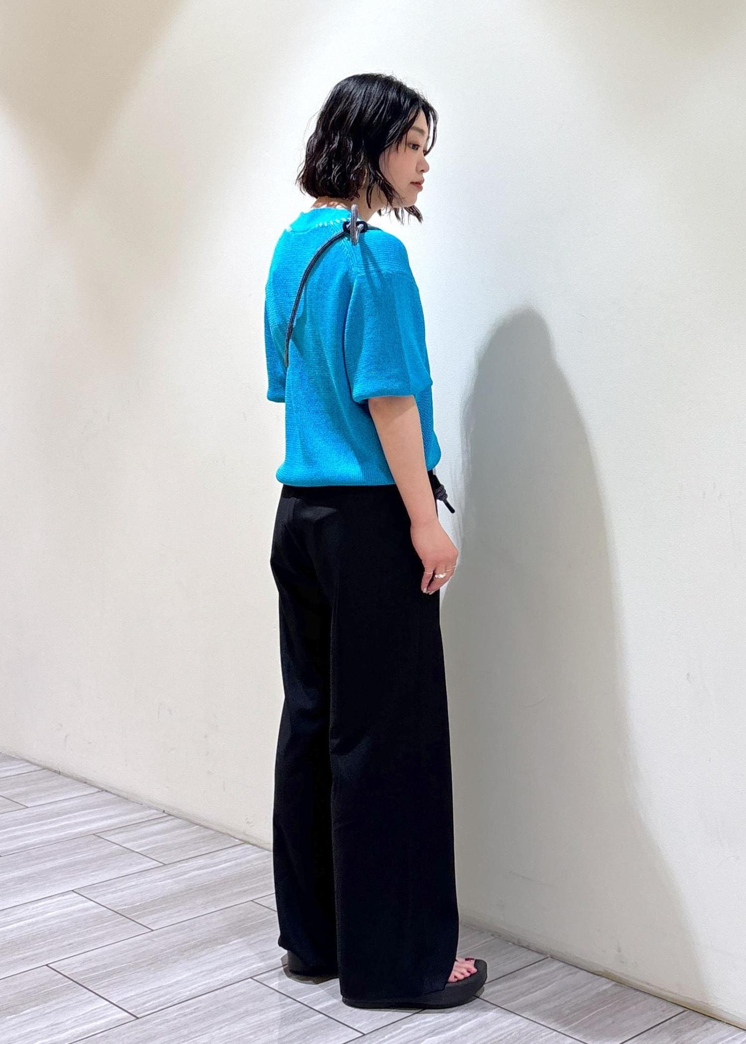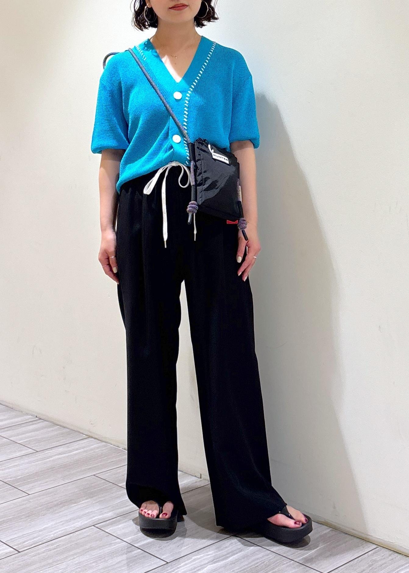 今回はペーパーシルクカーディガンのブルーを使ってコーディネートしてみました!