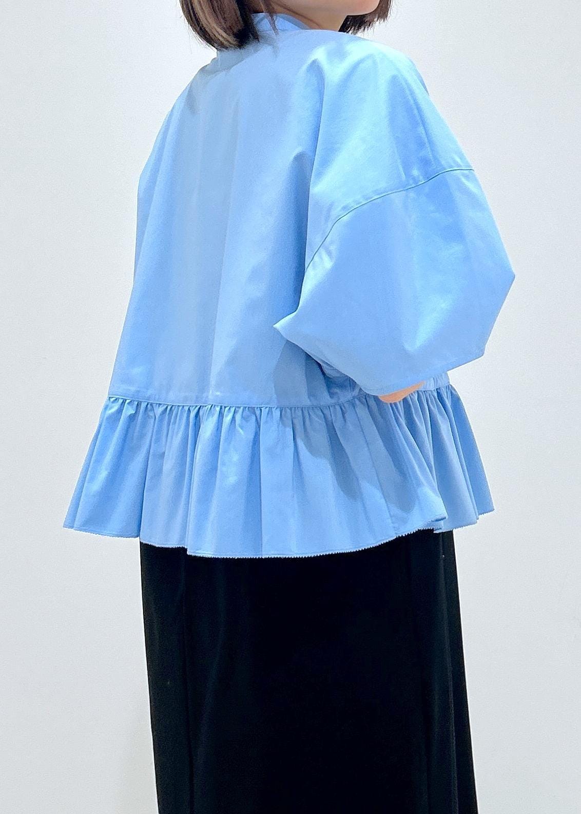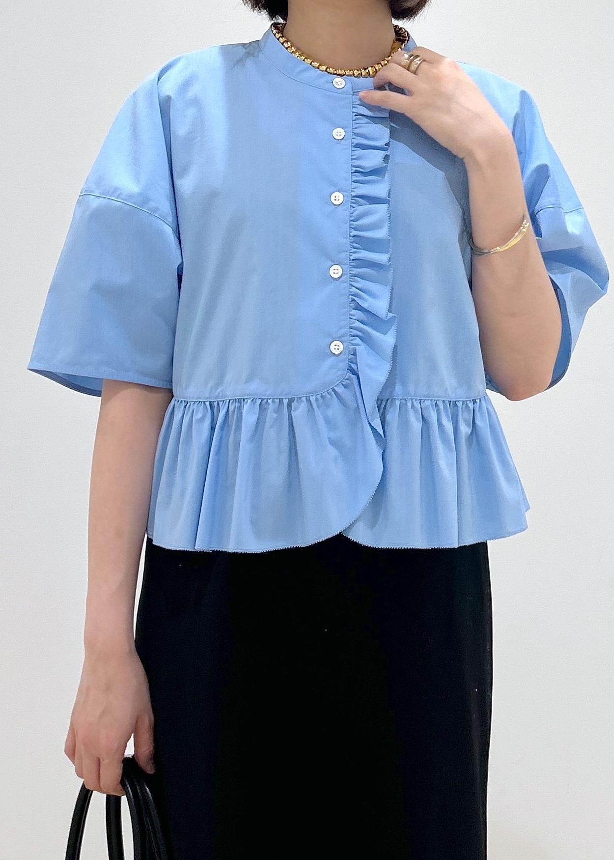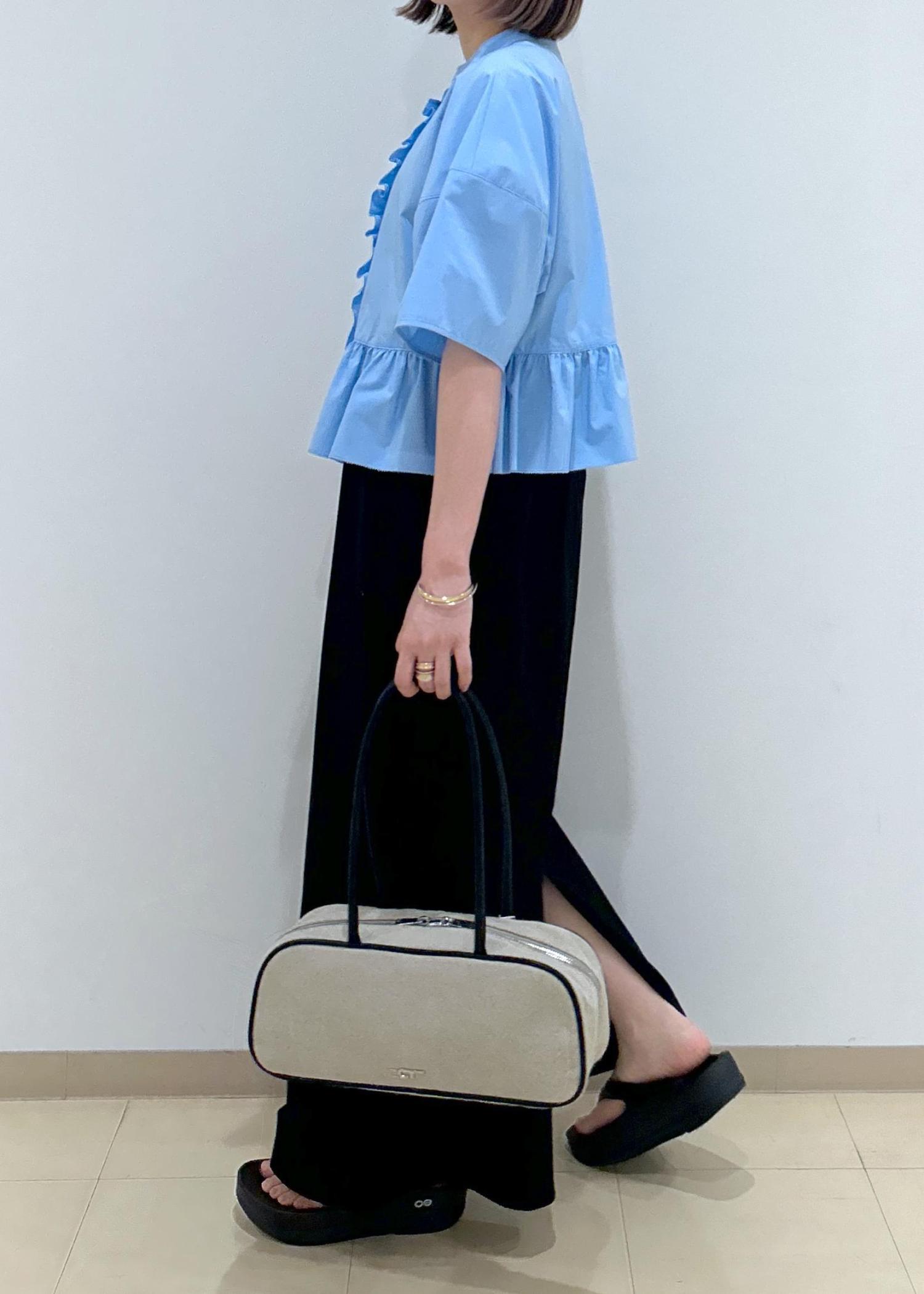 ノースリーブのワンピースに、夏らしい涼しげなブルーのブラウスをレイヤード。