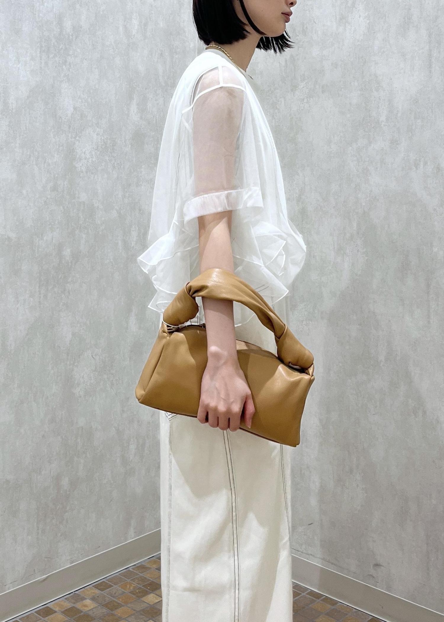 全体的に丸みを帯びたデザインで、柔らかさが特徴な上品なバッグです。しっかりとマチがあるため、財布、ポーチ、ハンカチなど様々なものを入れることができます。内側にポケットがあります。