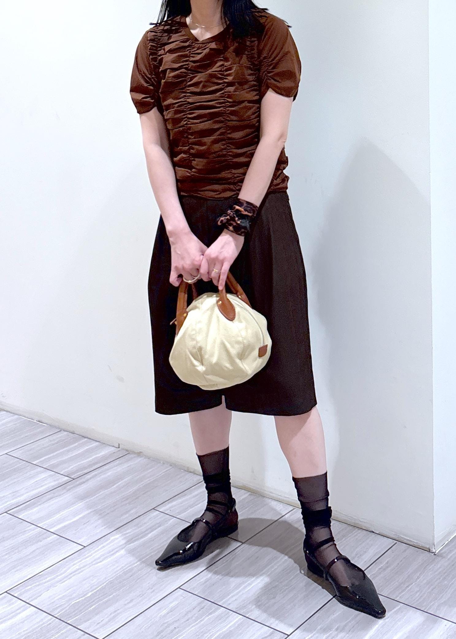 たっぷりとギャザーが入った、シンプルながら着映えするTシャツを合わせて、子供っぽくなりがちなハーフパンツを大人仕様に。