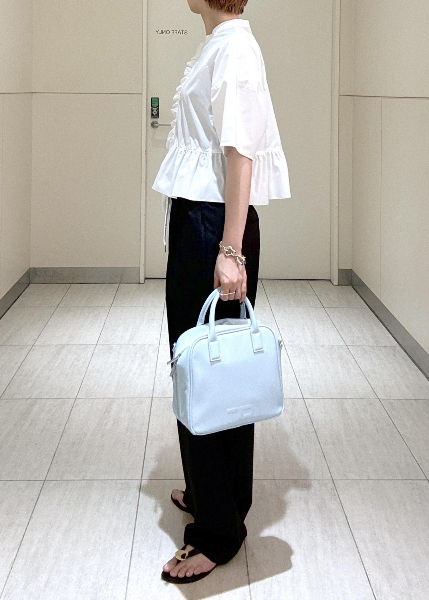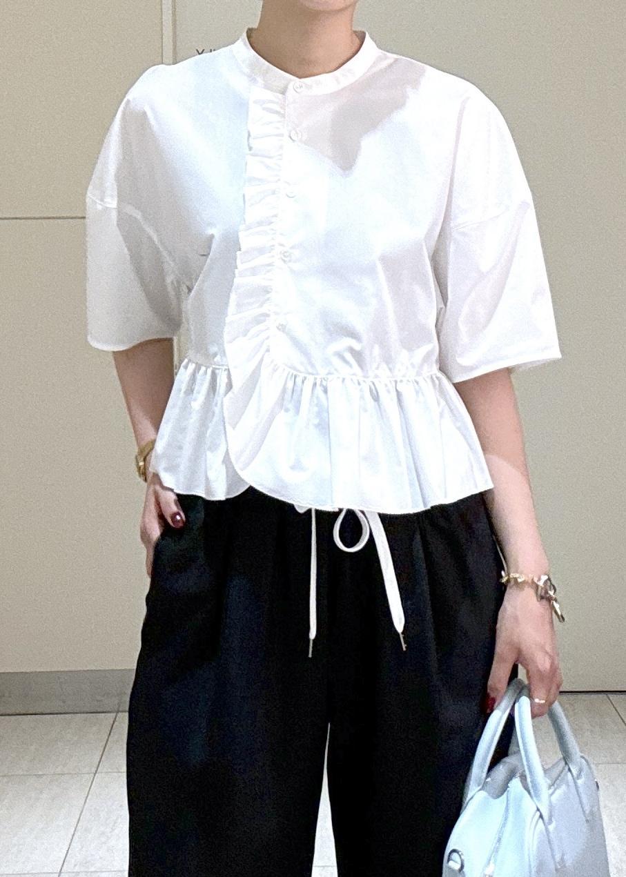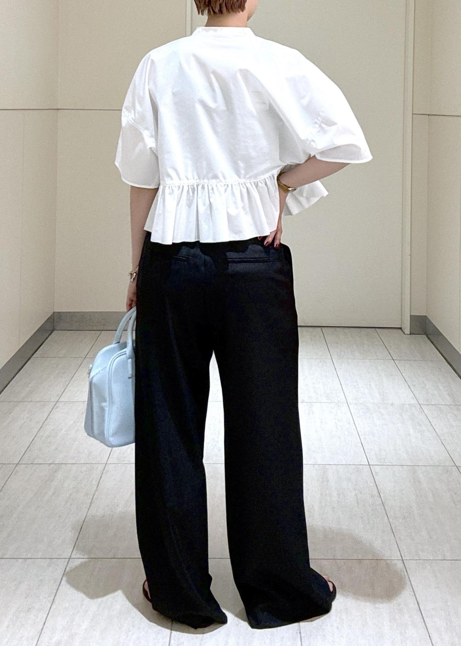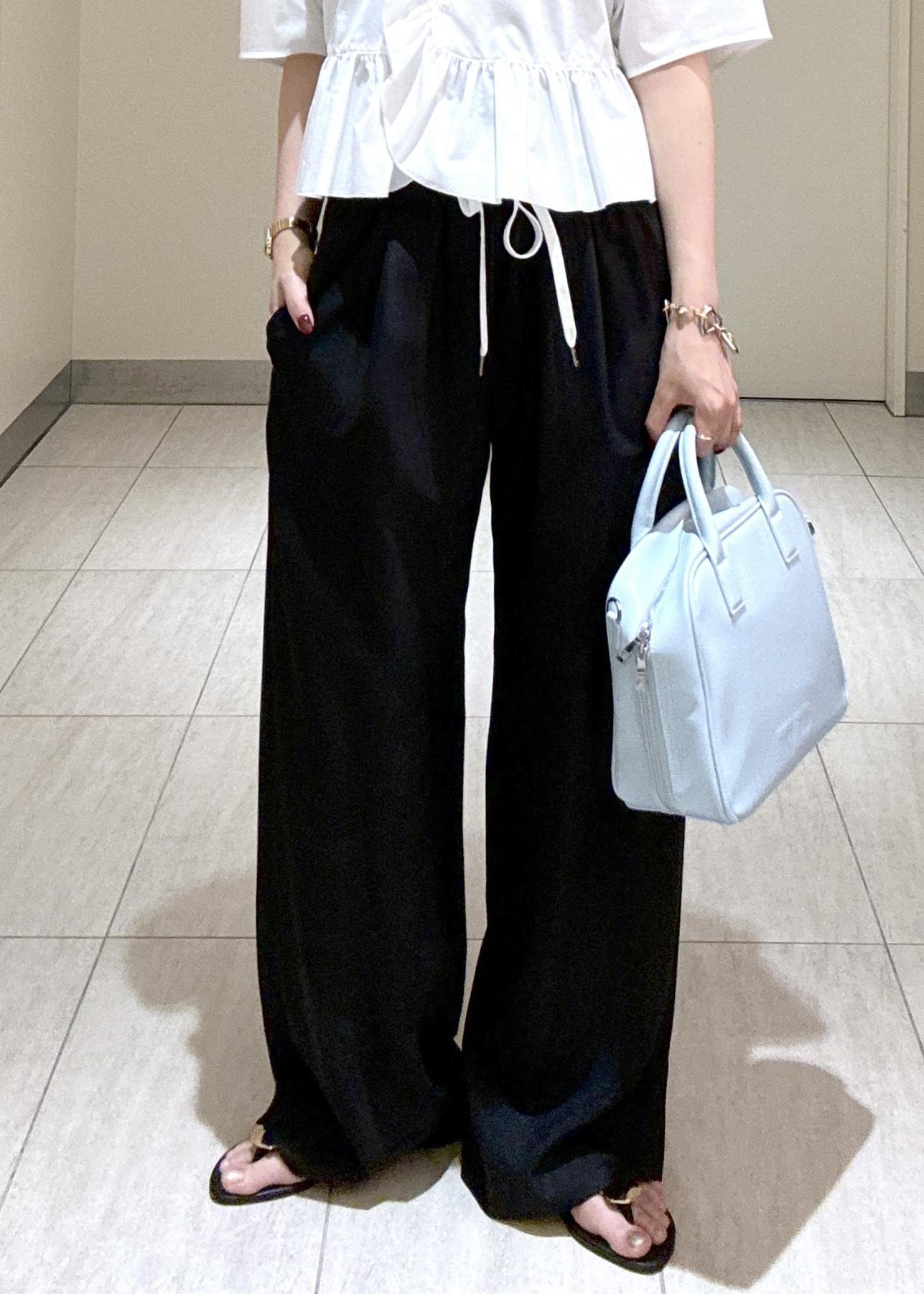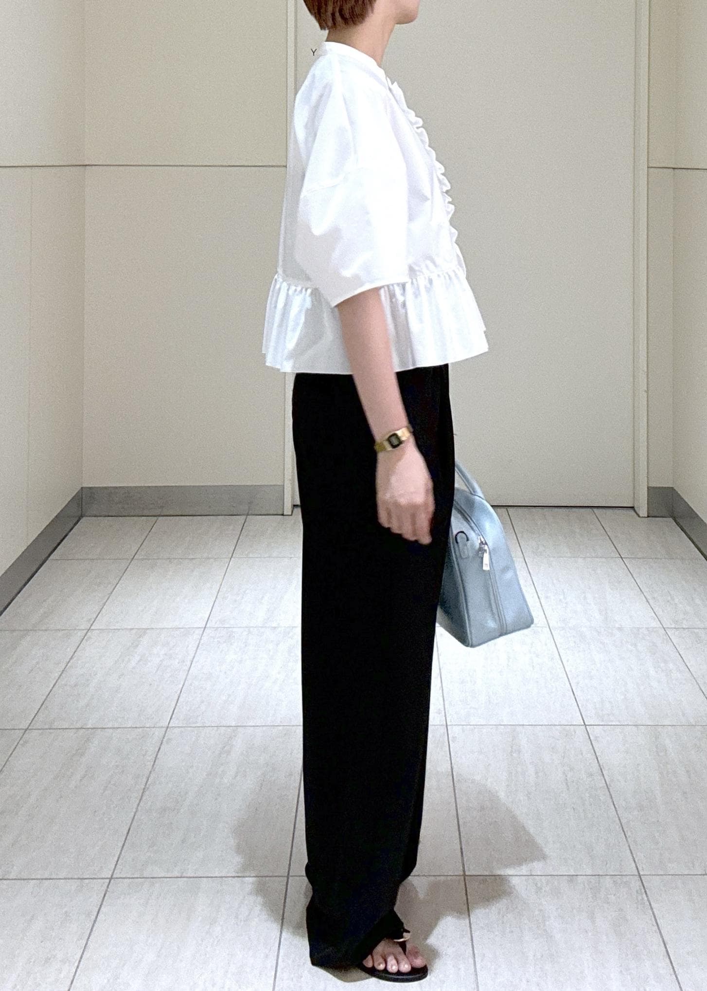 普段フリル系はあまい、フェミニンなイメージがあって着用しないのですがカジュアルなイージーパンツとサンダルを合わせると挑戦しやすいです!