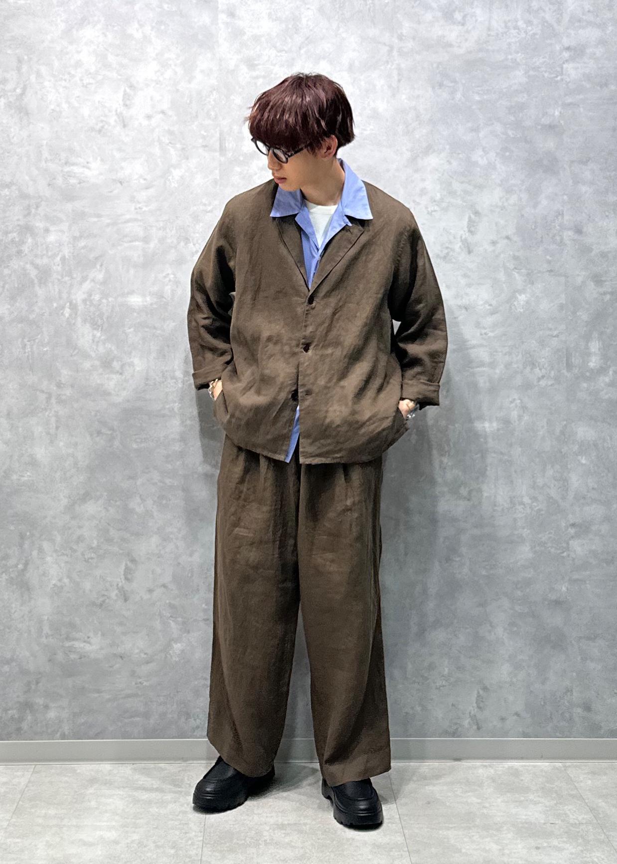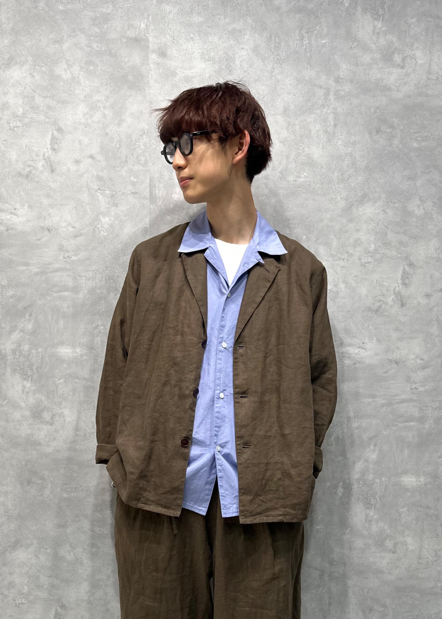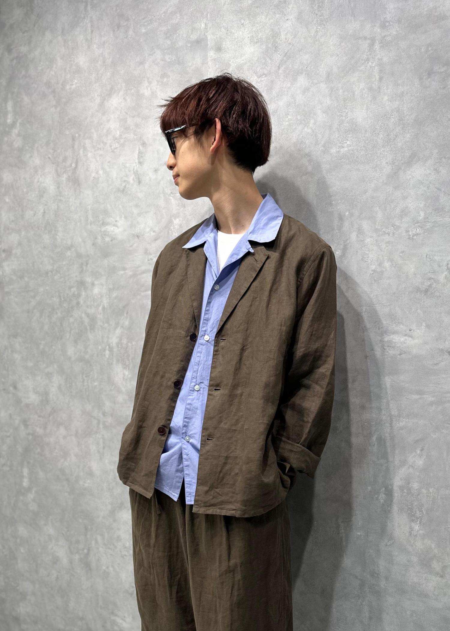 リネンのジャケット。リラックス感のあるルーズなサイズ感で、大きいサイズ感ながらも素材や色味で大人らしい雰囲気。ルーズですが、どこかクリーン。涼しく、快適な着心地。リネン100%、天然繊維の良さを着て感じてみて欲しい逸品です。