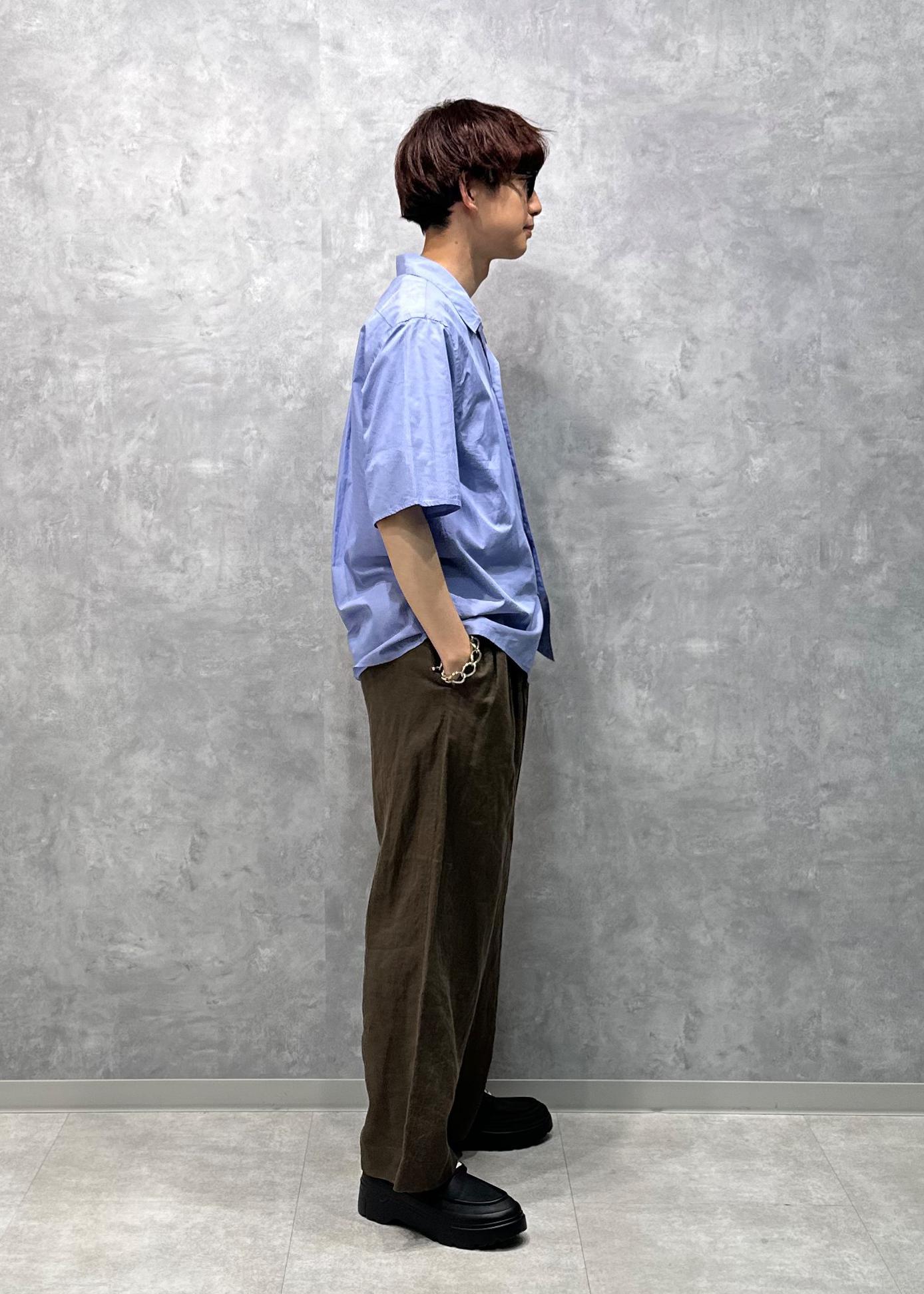 程よくルーズな着心地、シルエットはオーバーサイズすぎず、スタイリッシュです。生地は自然な光沢とクタッとした柔らかな肌触り、綺麗すぎず少し不揃いな表面感が特徴です。