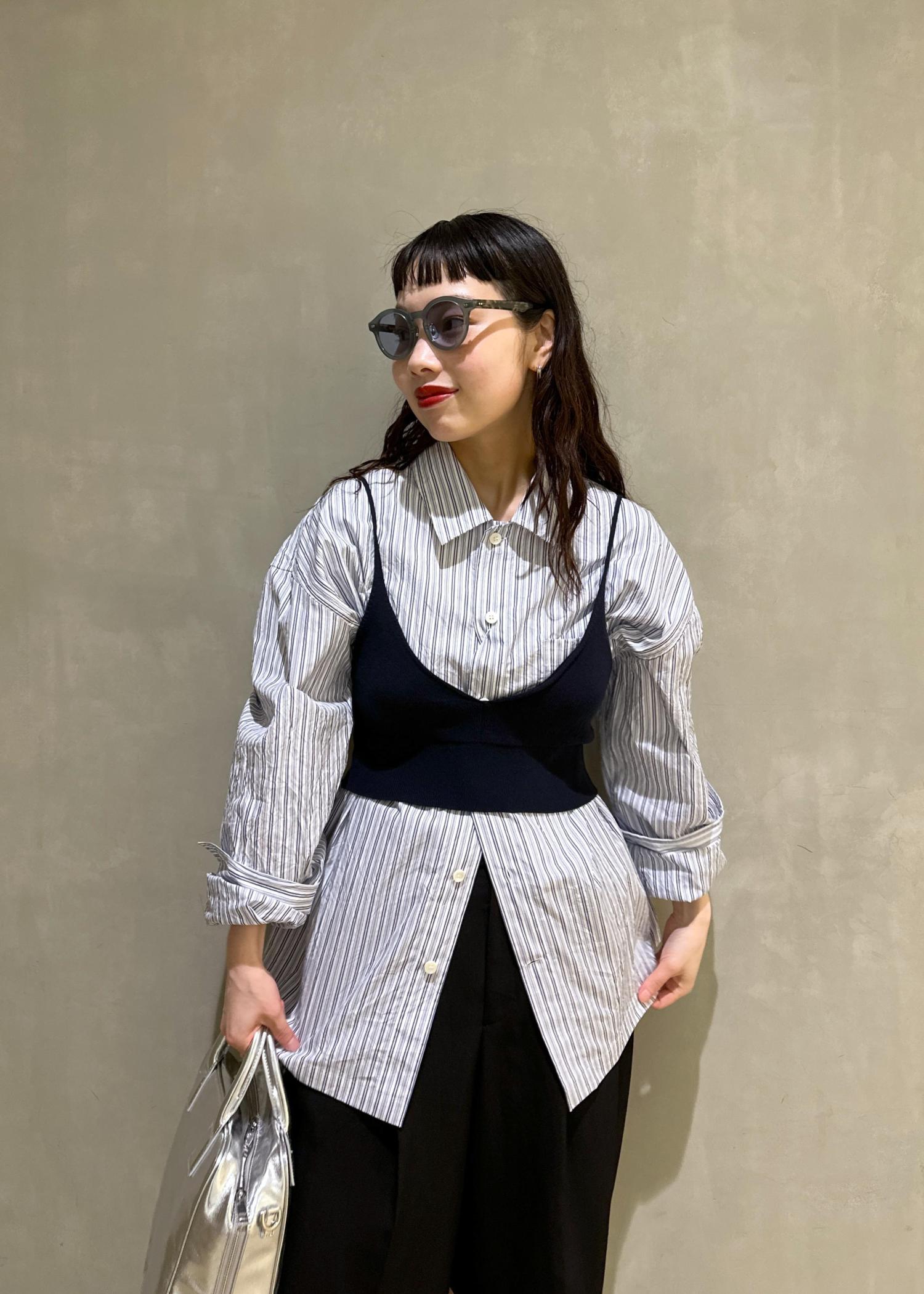 メンズのシャツにビスチェをレイヤードして、