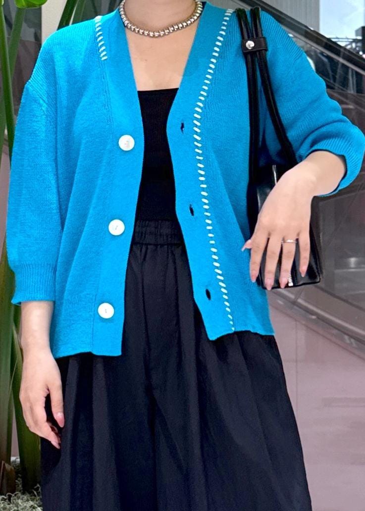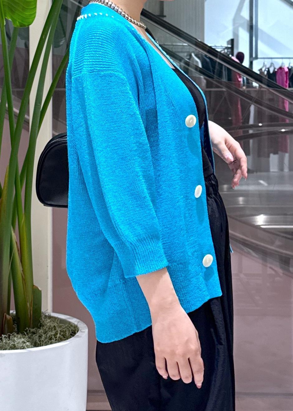 パキッとブルーがさわやかに見えて素材感もかなり薄めなのでとっても涼しく着ていただけます!