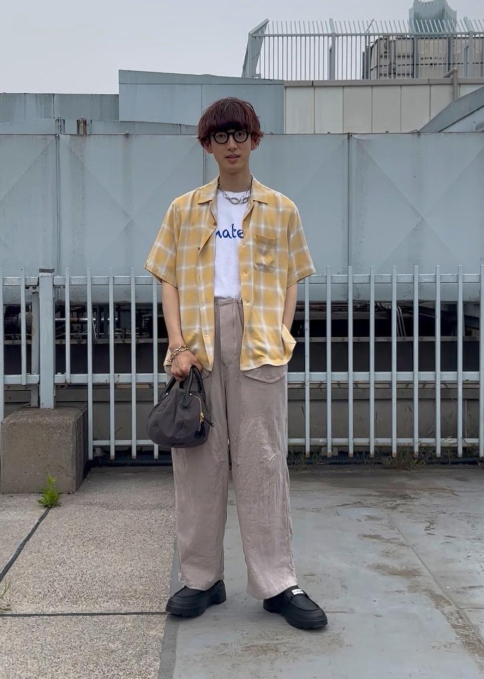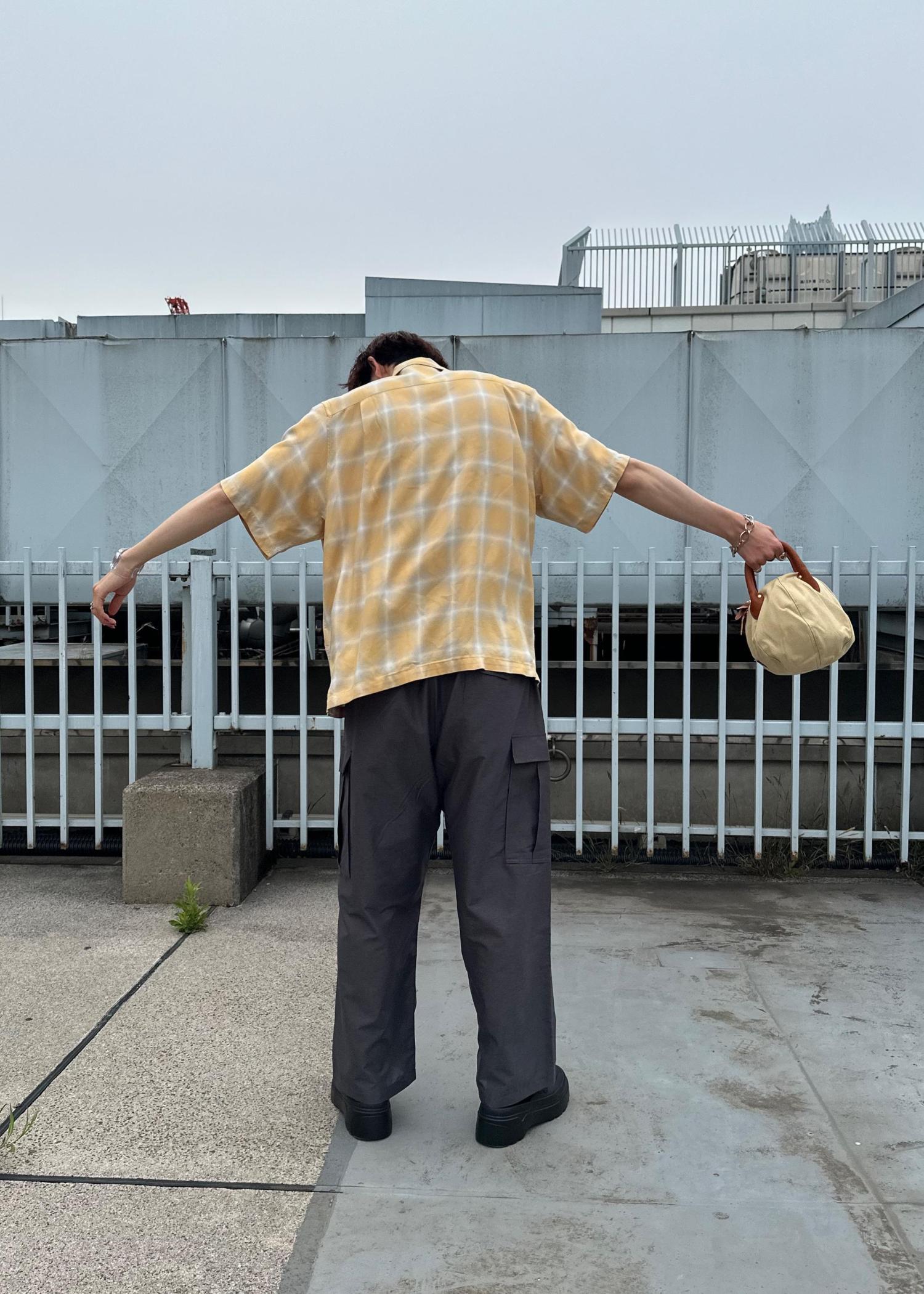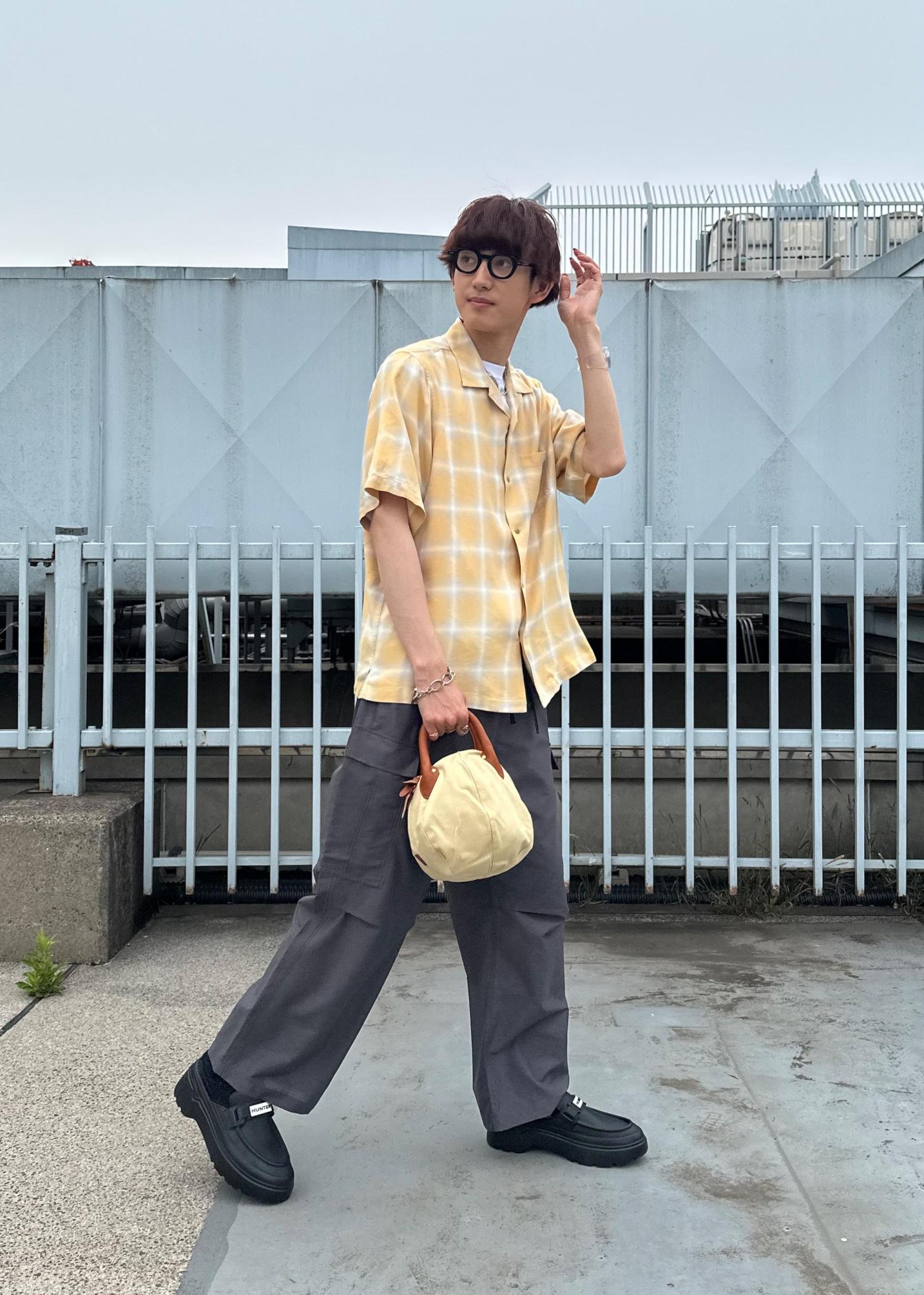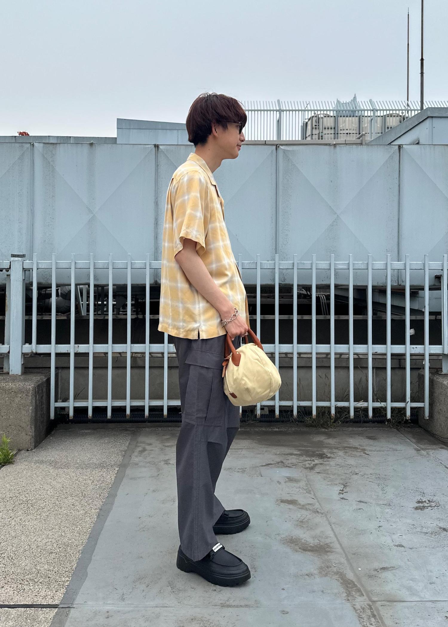 イエローチェックにグレーを合わせた、シャツの色、柄を目立たせたコーデです。バッグはキナリの色味で統一感を持たせました。足元はレザーで上品に。チェックシャツを目立たせた遊び心溢れるコーデに仕上げました。