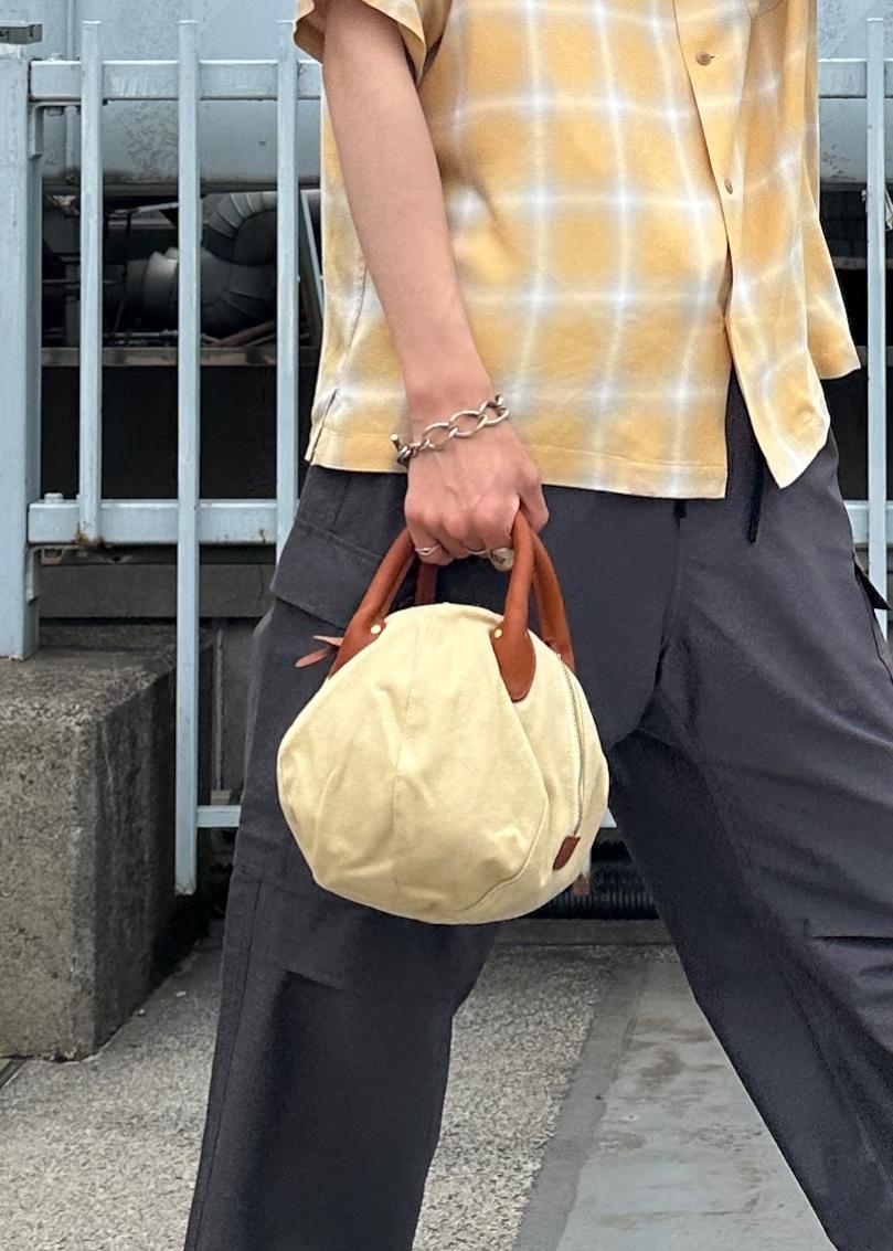 ミニマルで可愛らしい形のバッグ。ボウリングの球を入れるバッグのよう。サイズ感はハンドボールよりやや小さいかなくらいに感じます。容量は申し分ないです。