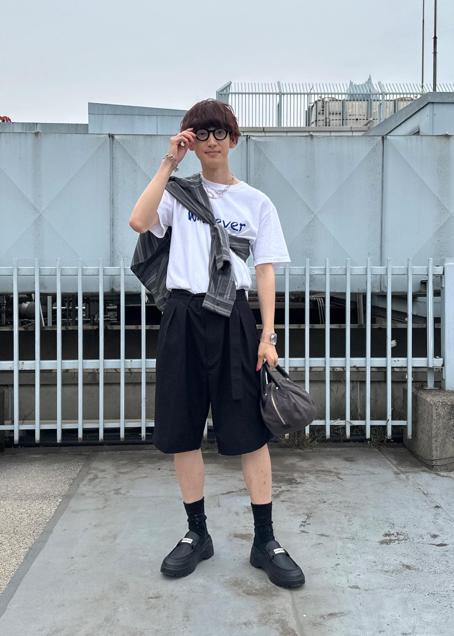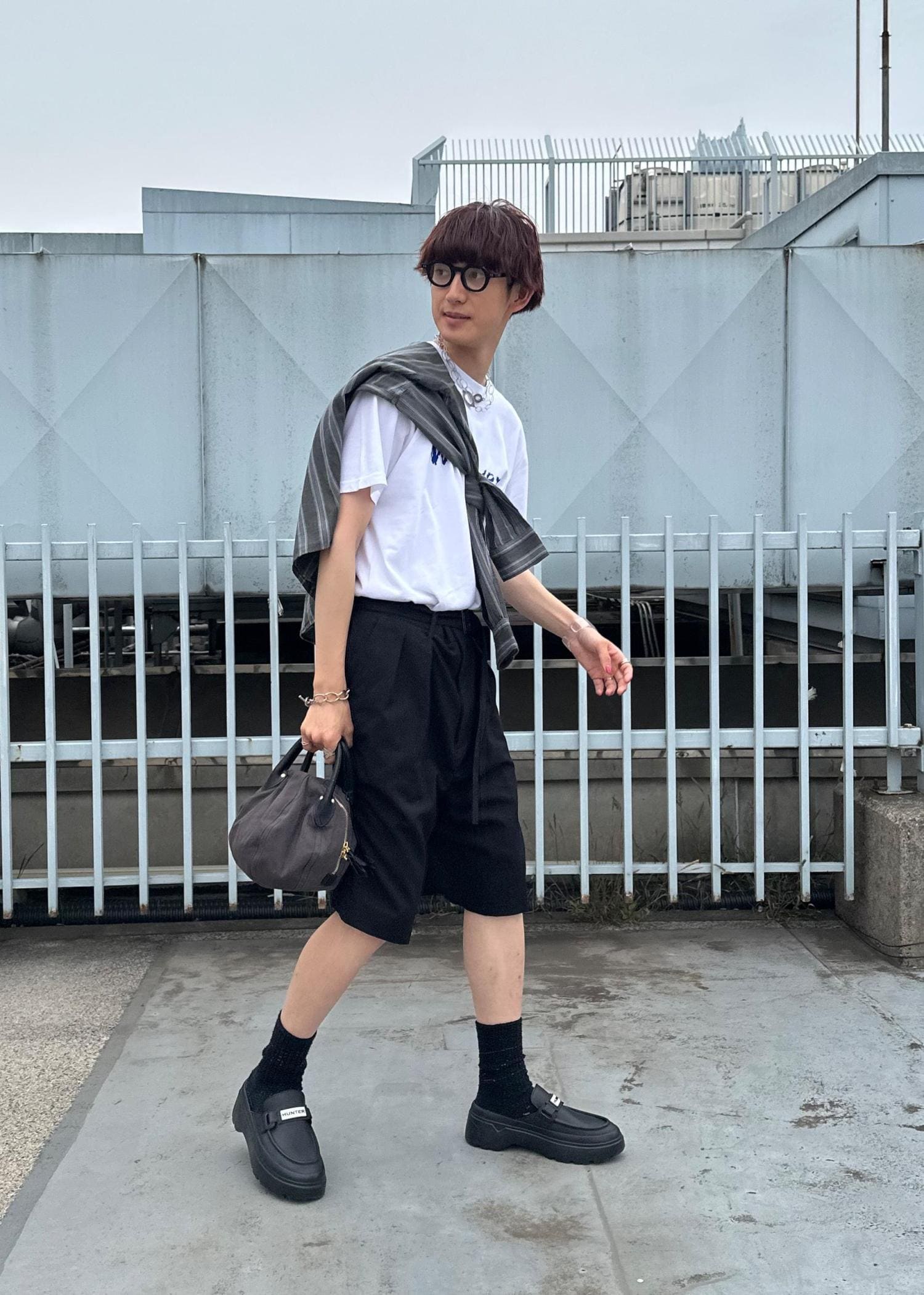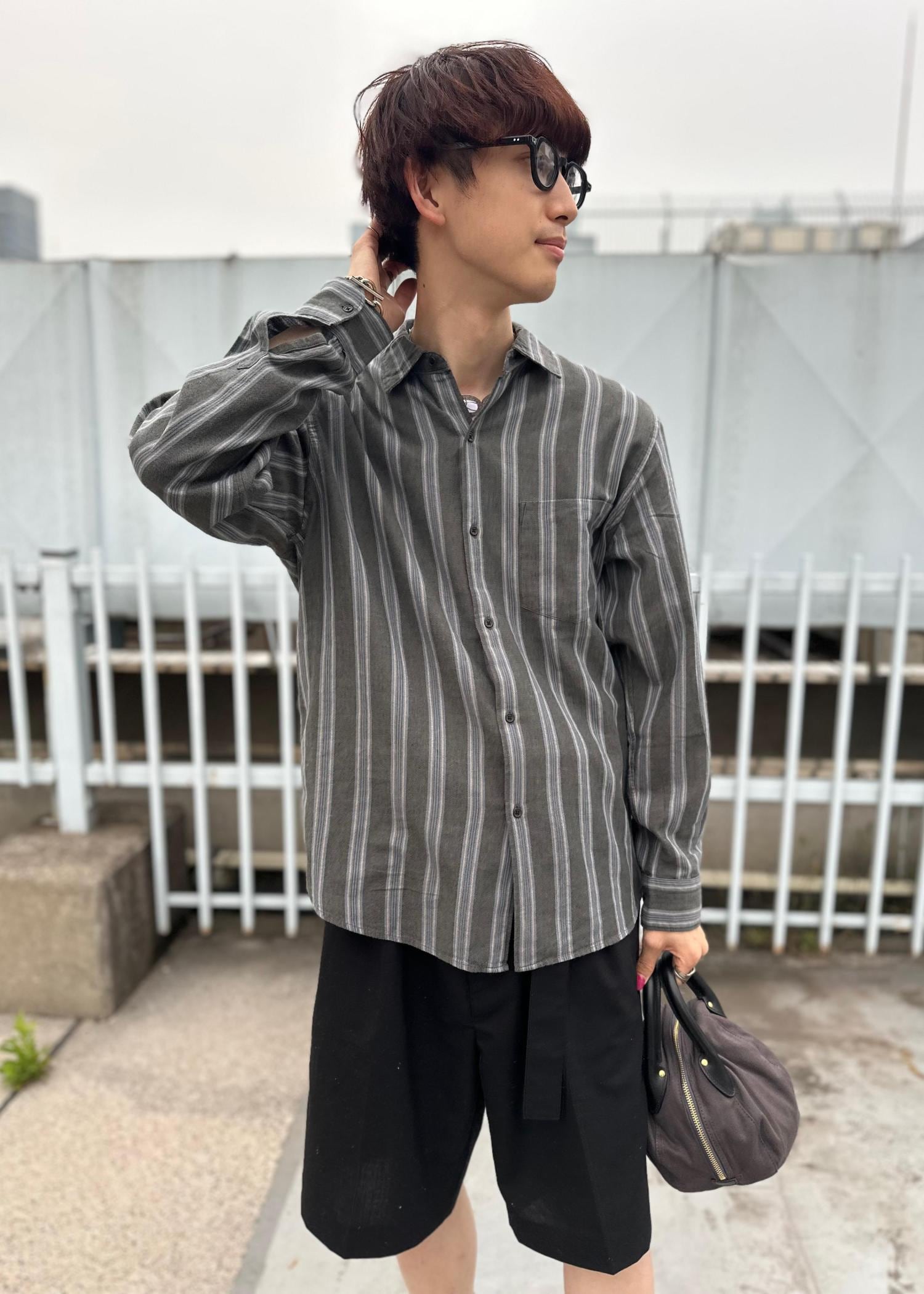 ショーツにシャツを合わせた大人スタイルです。モノトーンでまとめすっきりとさせました。暑い時はたすきがけにしてもかっこいいです。気温調節もしやすく、雨の日コーデにもおすすめです。