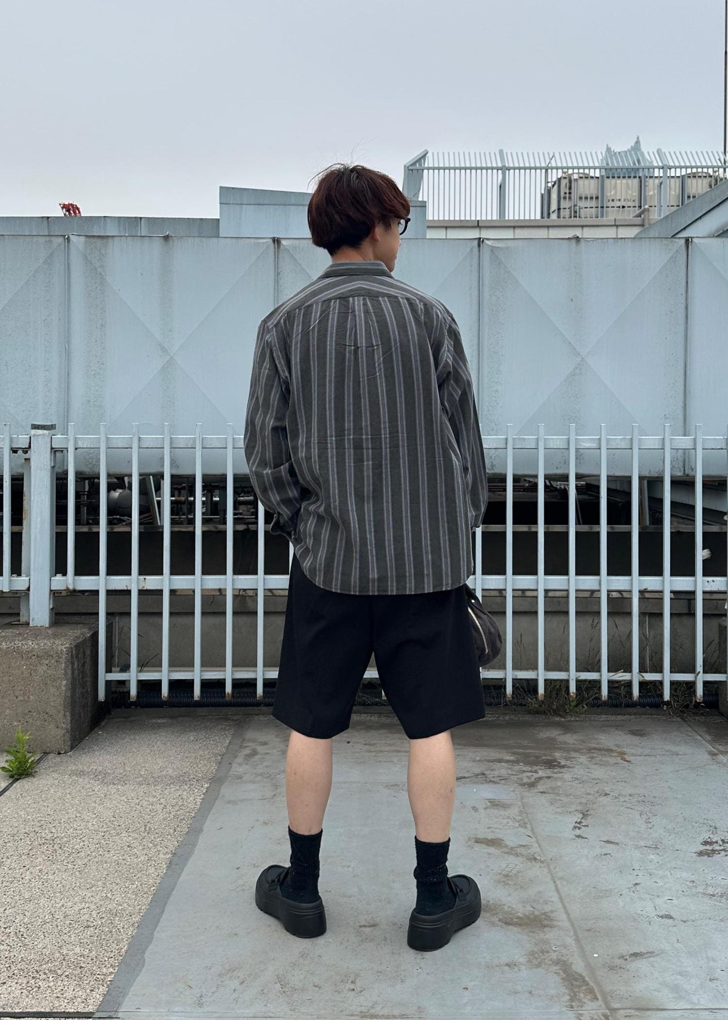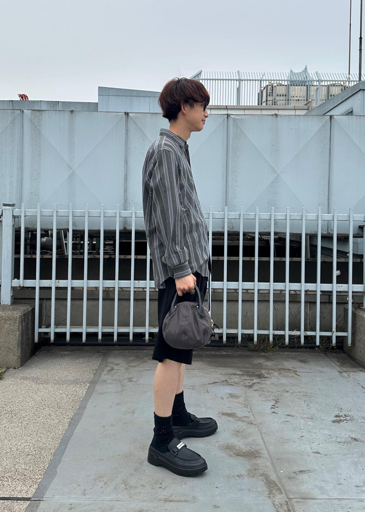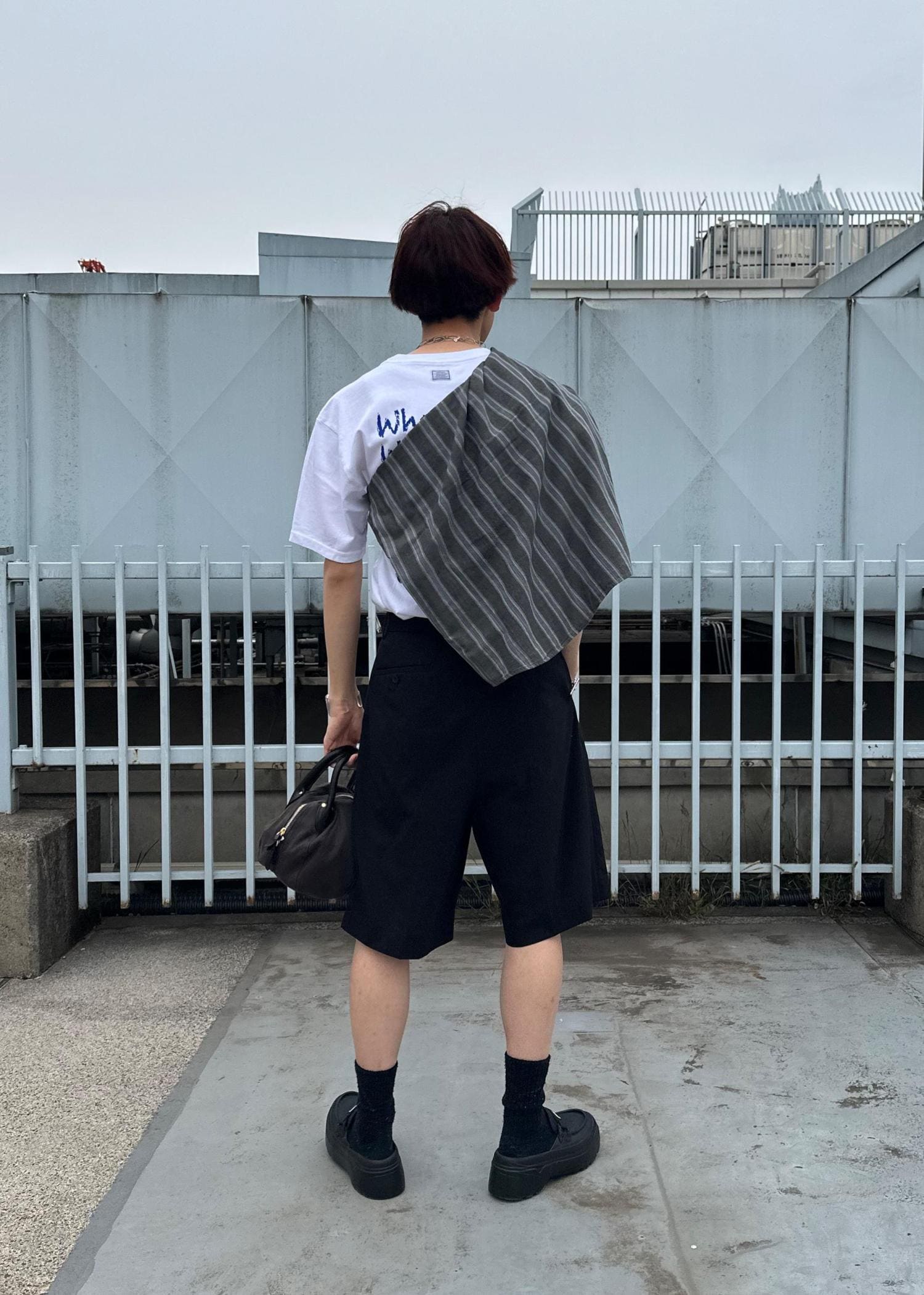 ショーツにシャツを合わせた大人スタイルです。モノトーンでまとめすっきりとさせました。暑い時はたすきがけにしてもかっこいいです。気温調節もしやすく、雨の日コーデにもおすすめです。