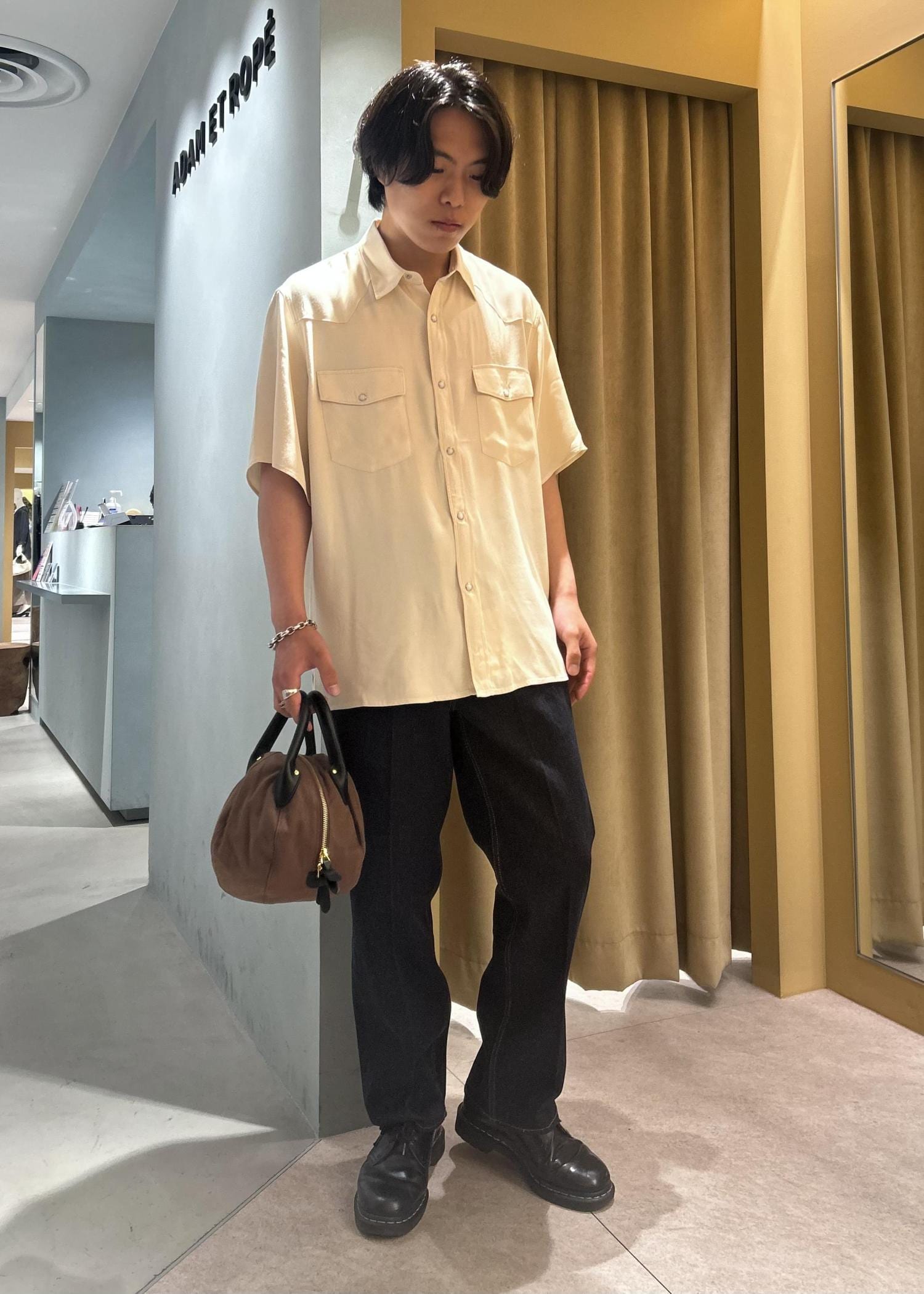 ウエスタンシャツということでカジュアルさを取り入れたくパンツはネイビーのデニムパンツで組みました。