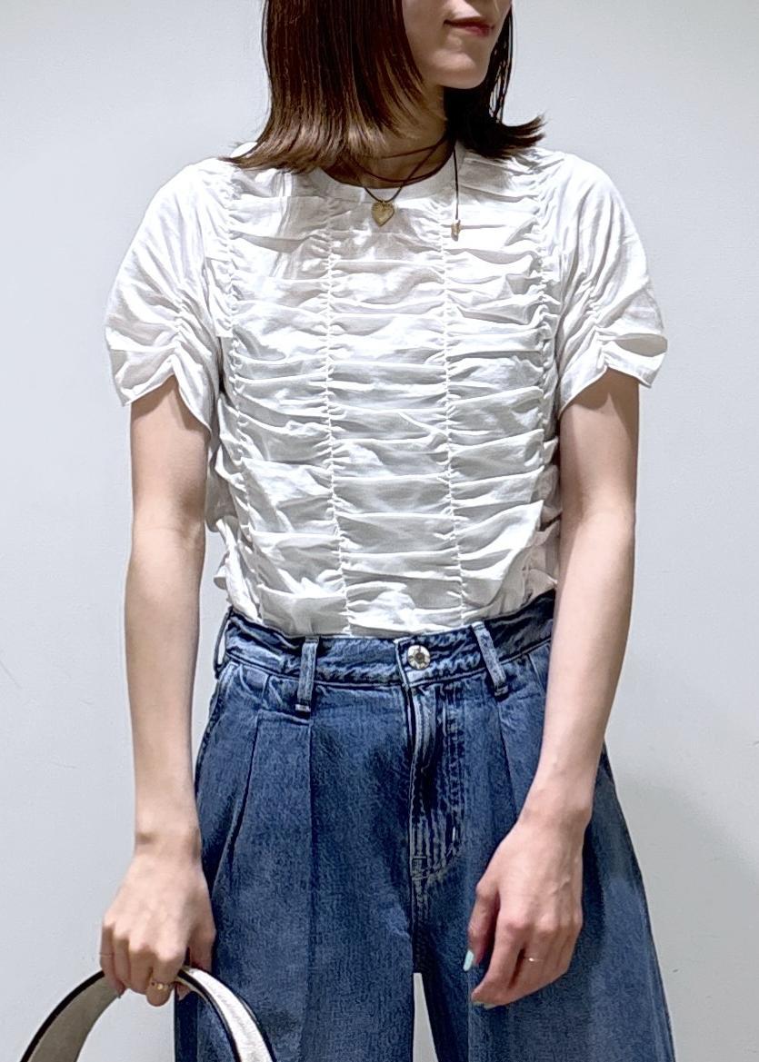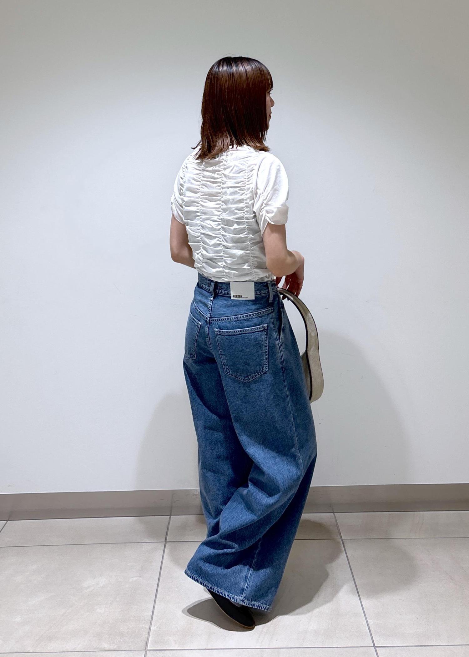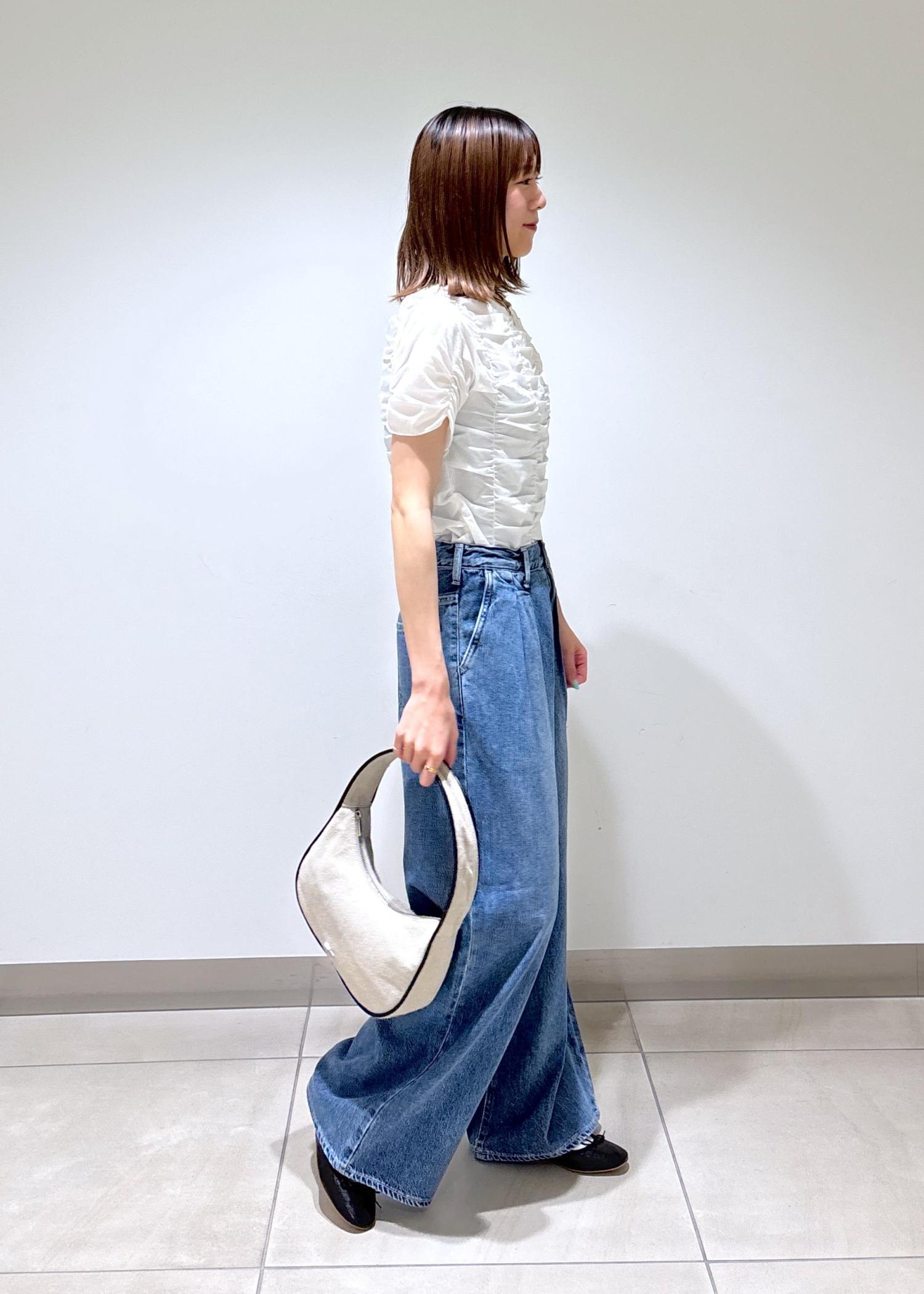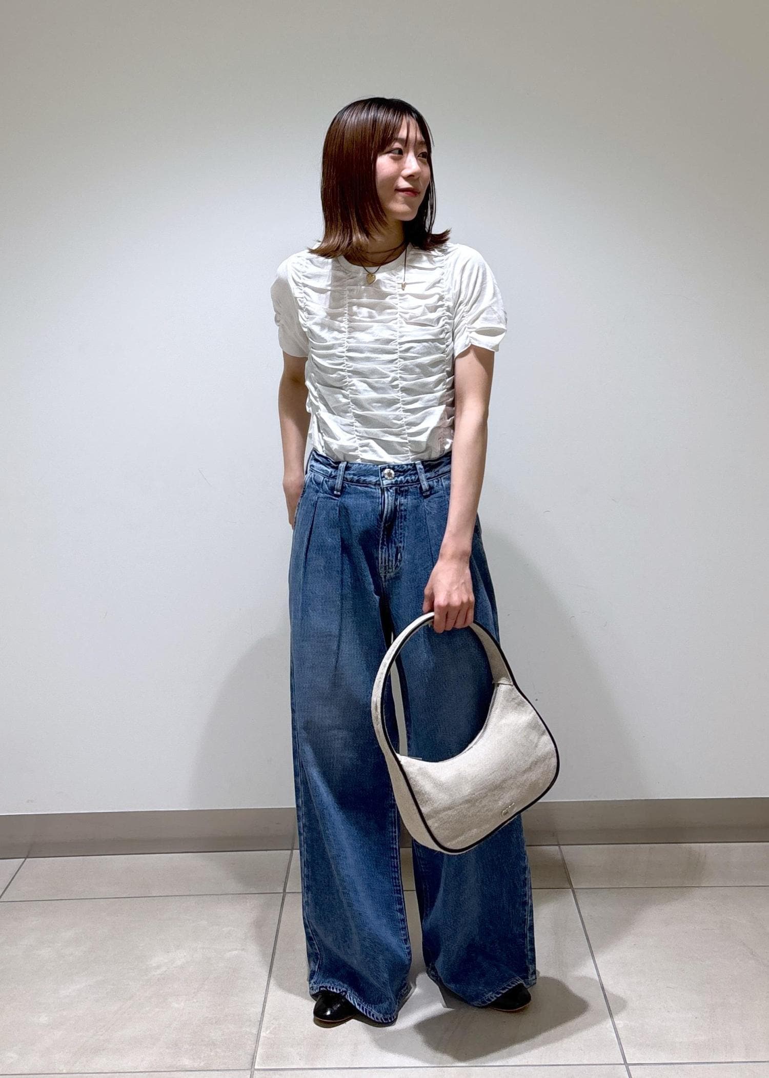 くしゅっとしたデザインが可愛く、1枚で着映え感バッチリなトップスとワイドデニムを合わせて大人カジュアルなスタイリングにしてみました♡