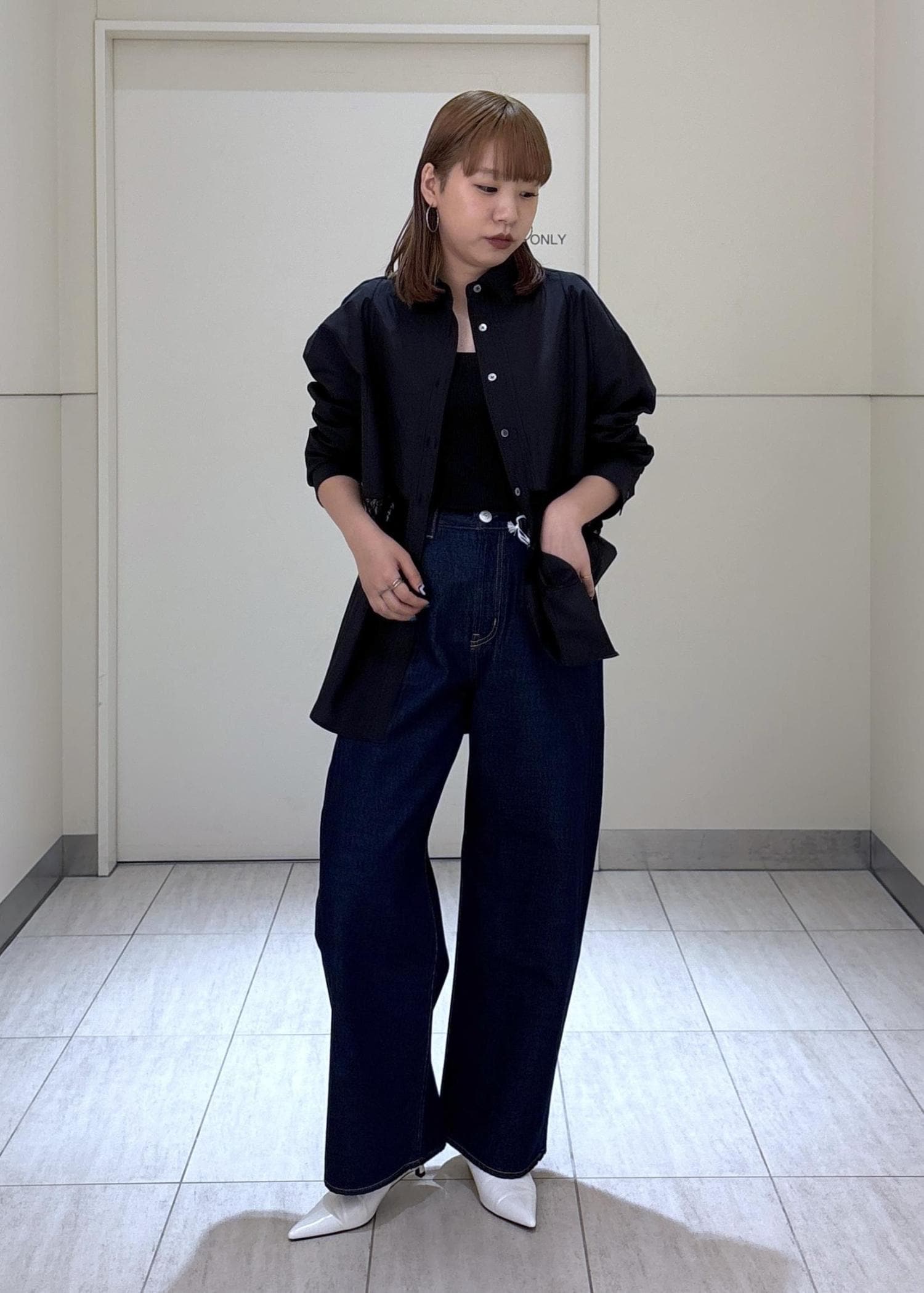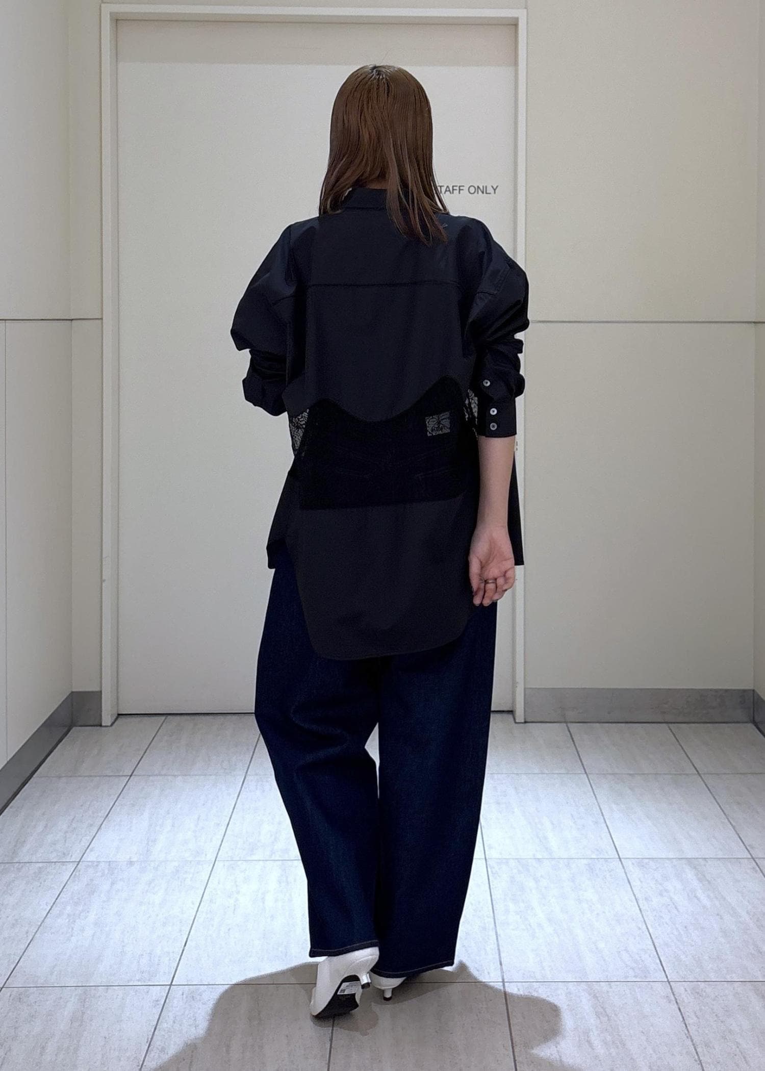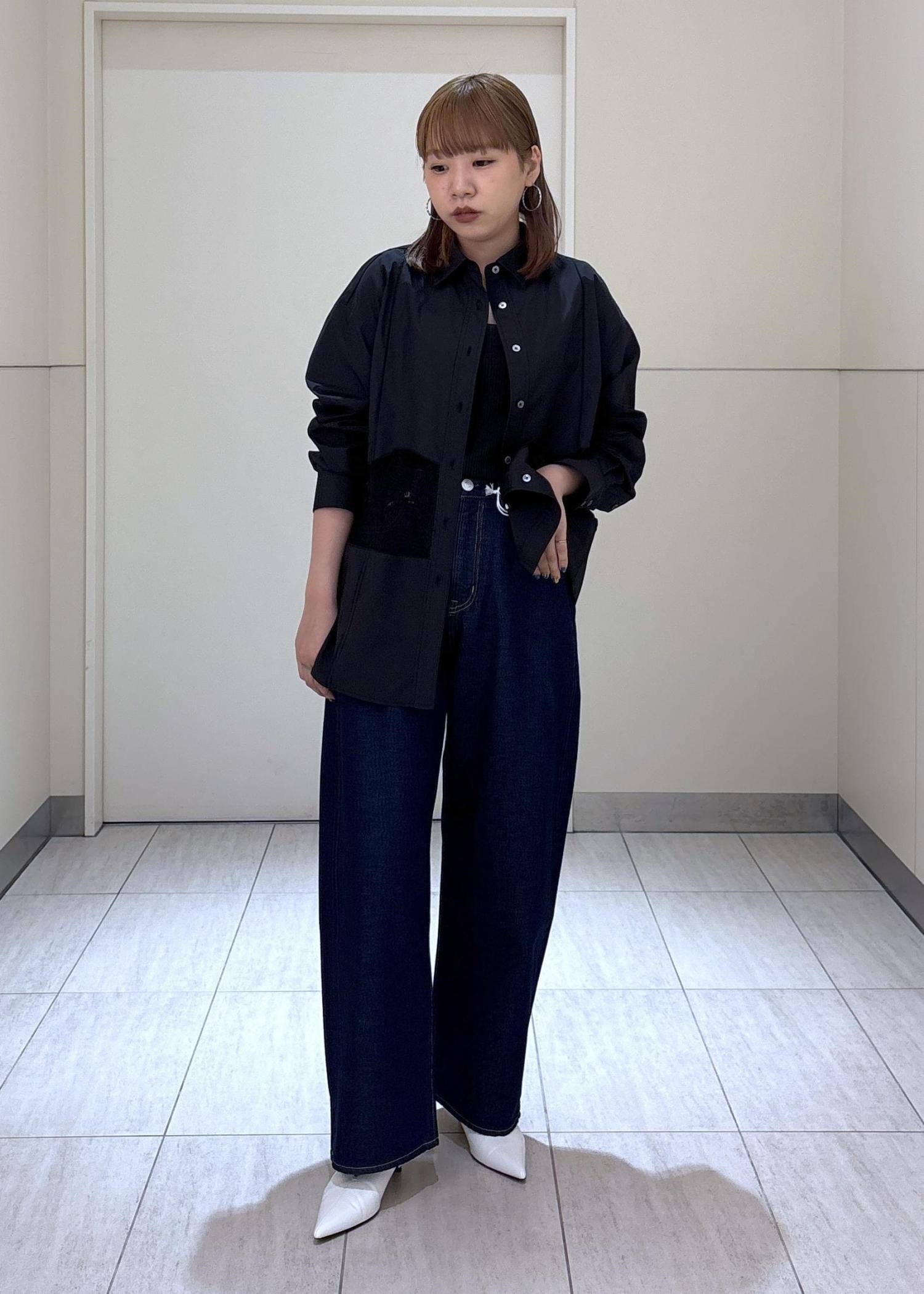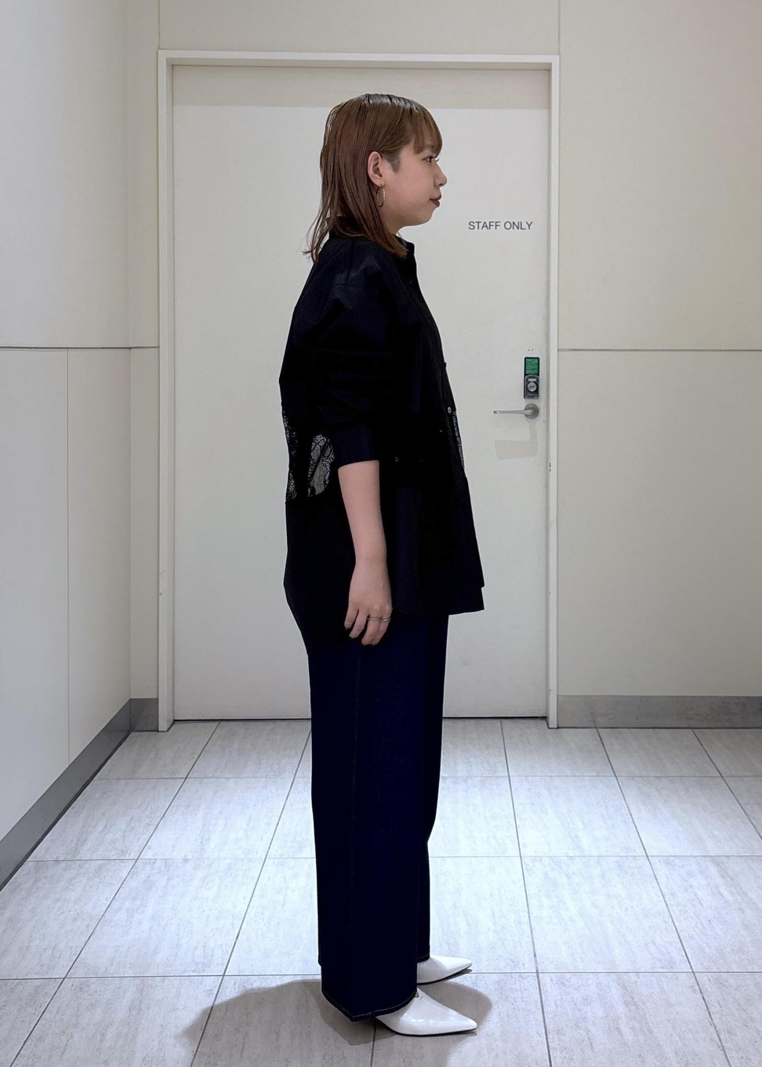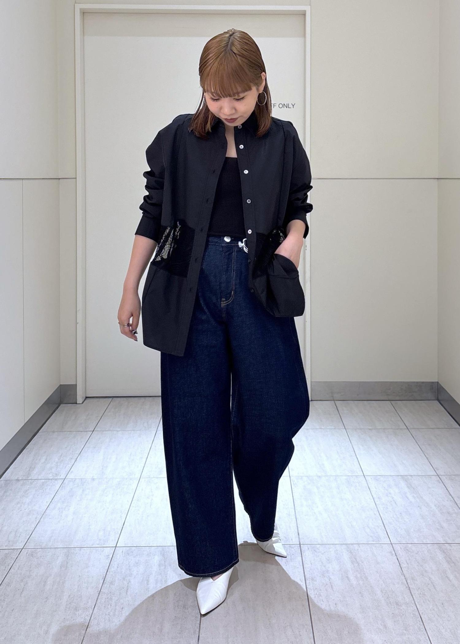 腰部分に抜け感がでるレースデザインが可愛くて女性らしさも出るシャツに、ワイドで脚長効果のあるデニムパンツが今年っぽくおすすめです!