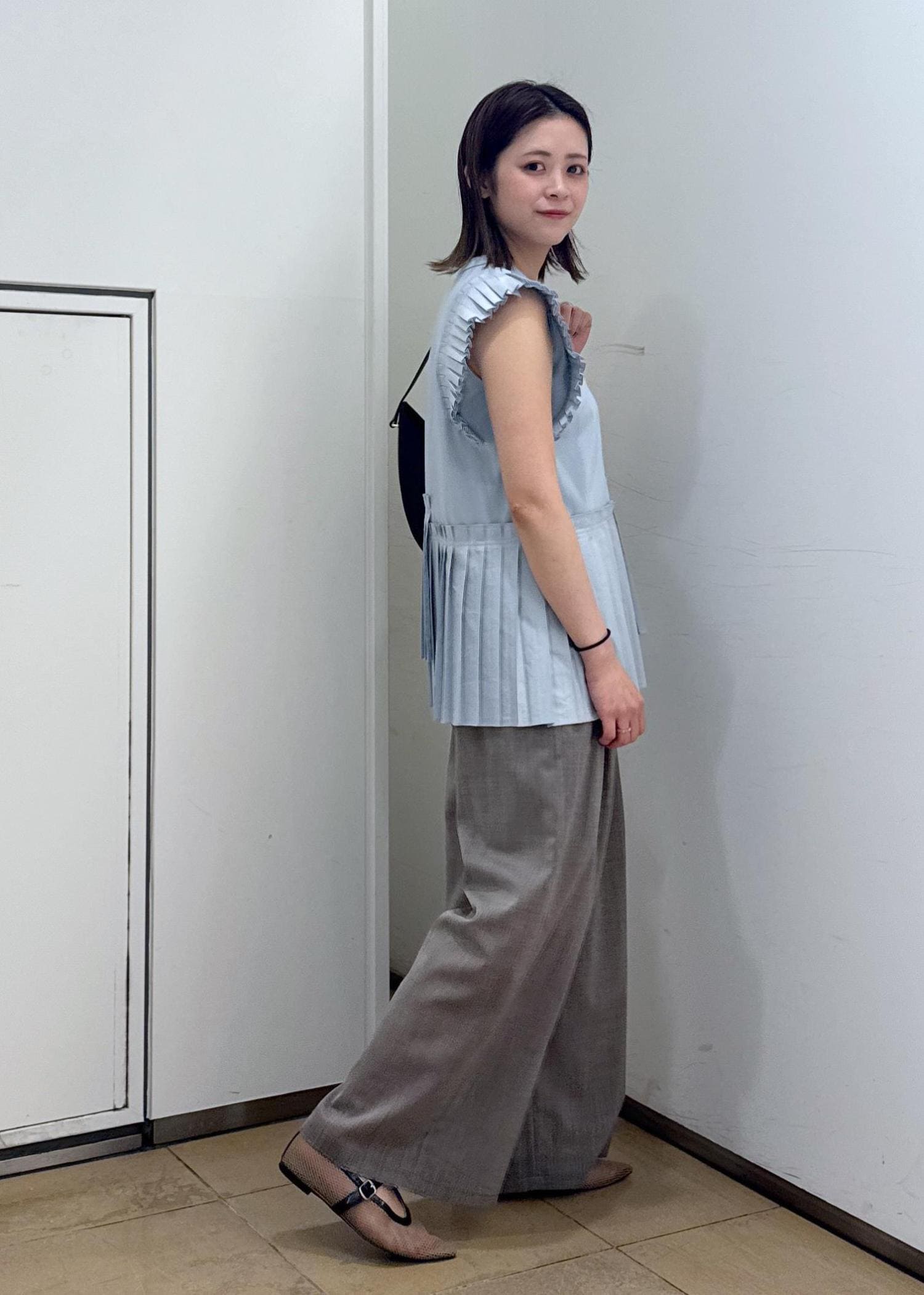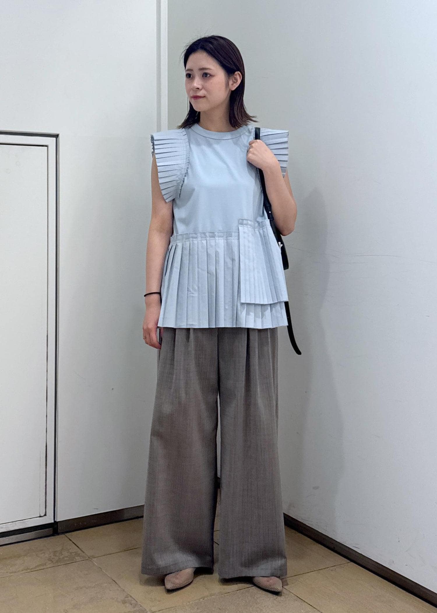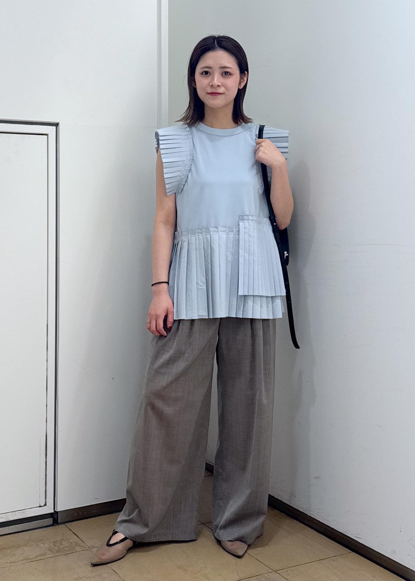 お尻が隠れるくらいの丈感で、袖部分のプリーツは肩までしっかり乗っかってくれるので安心感◎でした。 -