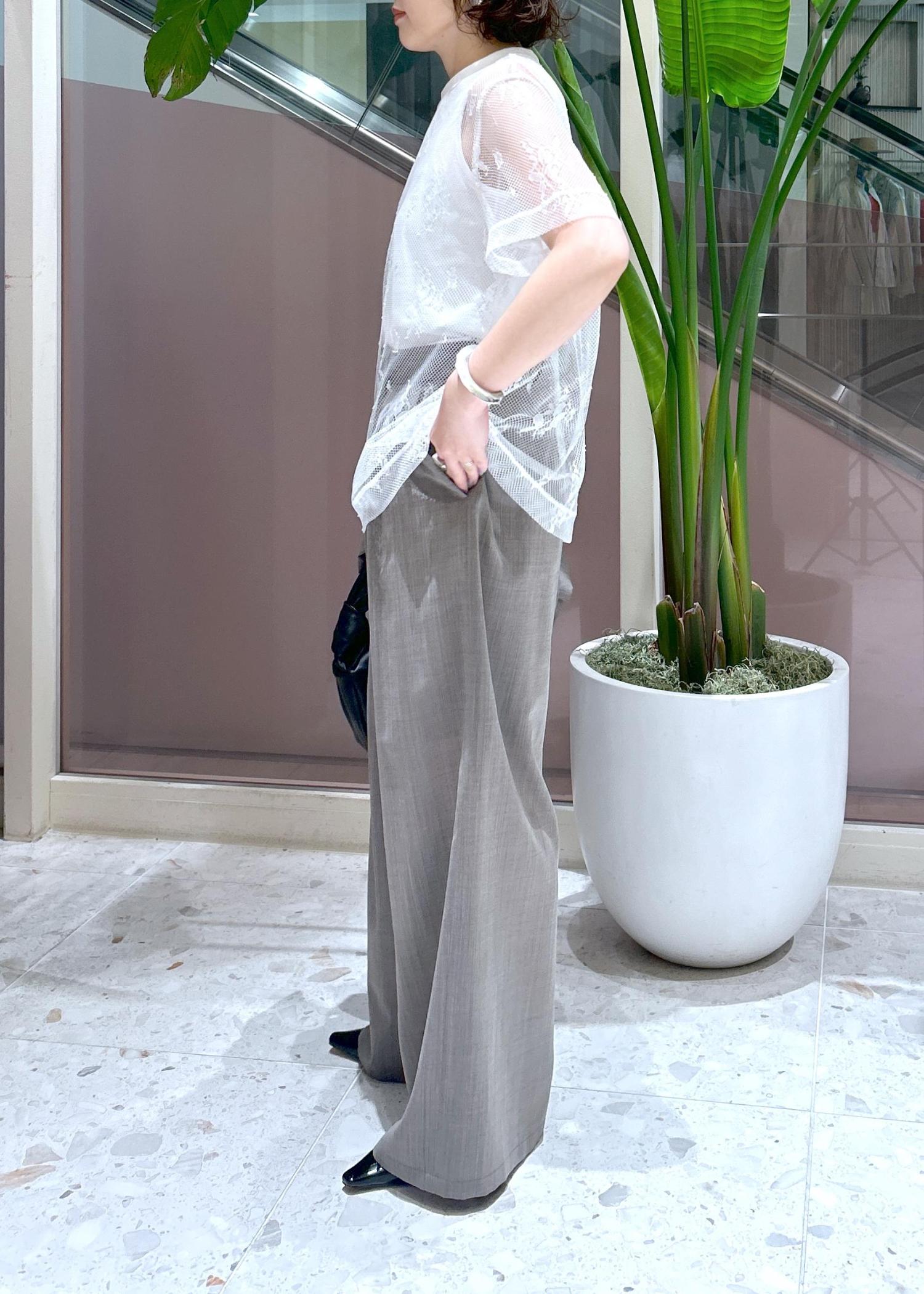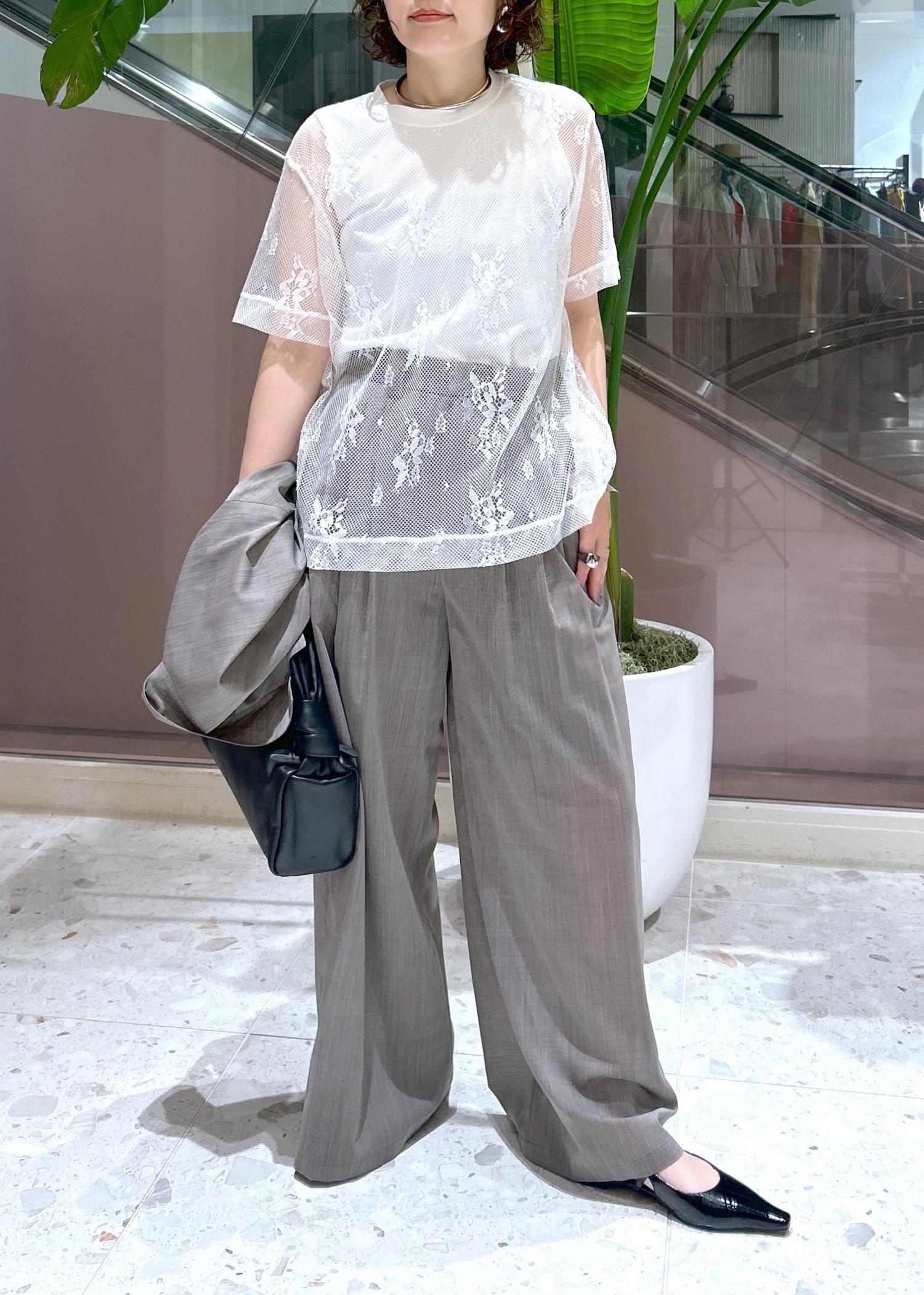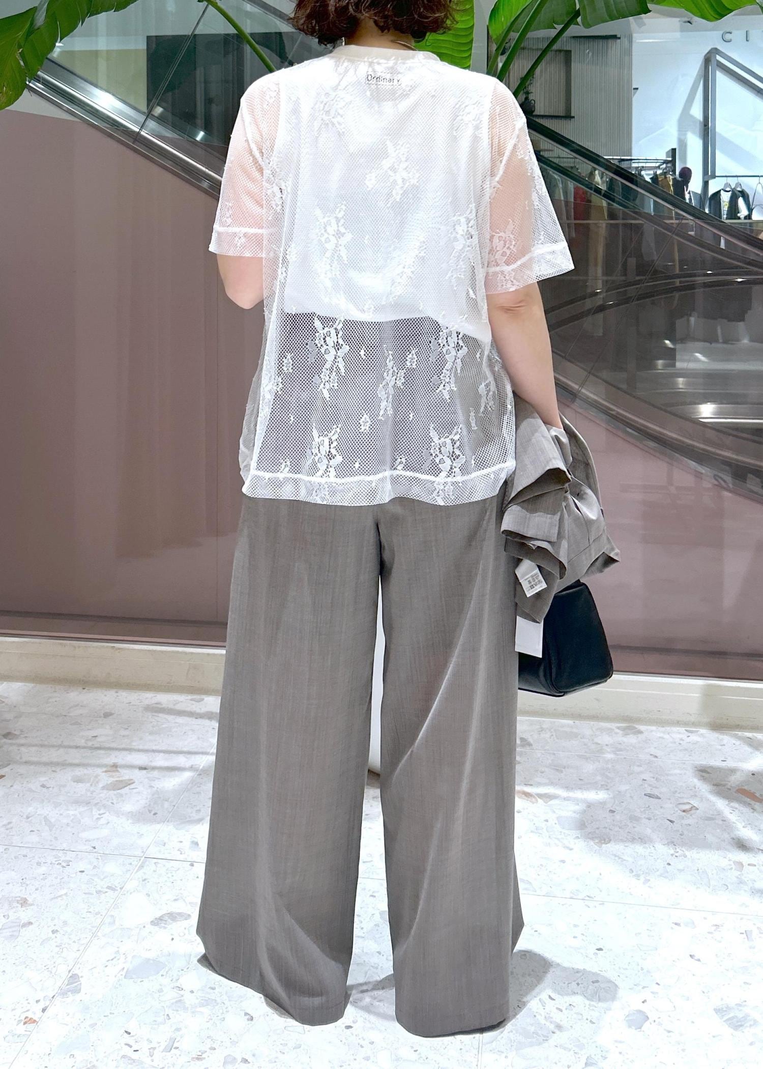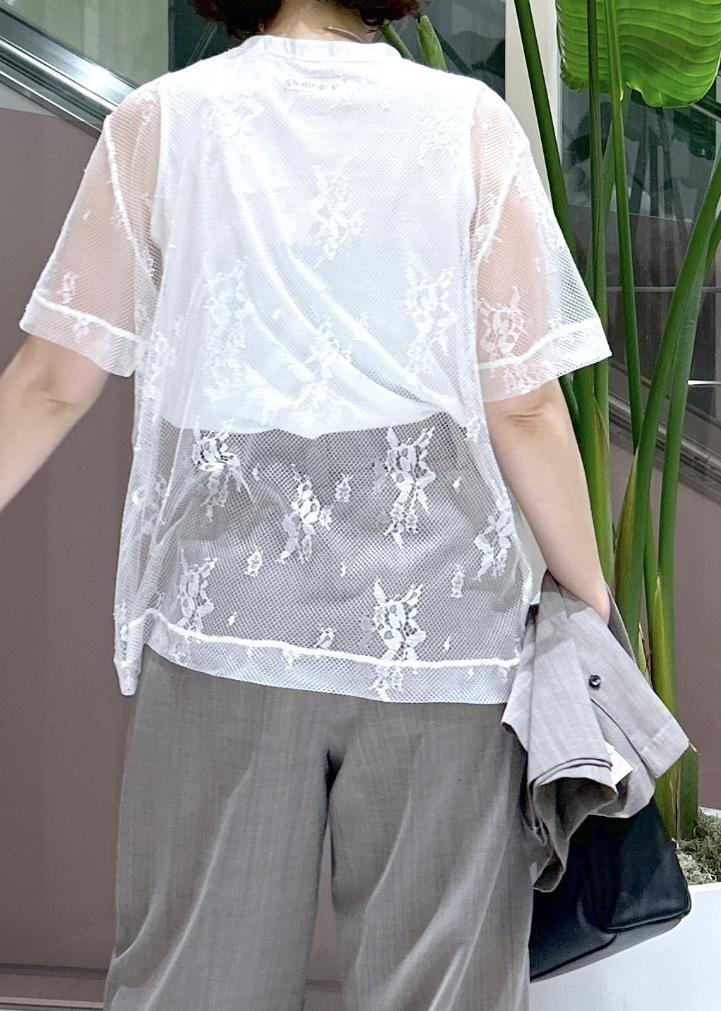 オンオフ使えるデザインで、インナーに華やかなレース素材のTシャツを合わせました♪